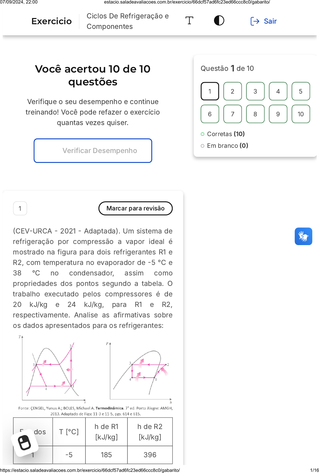 <p>Você acertou 10 de 10</p><p>questões</p><p>Verifique o seu desempenho e continue</p><p>treinando! Você pode refazer o exercício</p><p>quantas vezes quiser.</p><p>Verificar Desempenho</p><p>1 Marcar para revisão</p><p>�CEV�URCA � 2021 � Adaptada). Um sistema de</p><p>refrigeração por compressão a vapor ideal é</p><p>mostrado na figura para dois refrigerantes R1 e</p><p>R2, com temperatura no evaporador de �5 °C e</p><p>38 °C no condensador, assim como</p><p>propriedades dos pontos segundo a tabela. O</p><p>trabalho executado pelos compressores é de</p><p>20 kJ/kg e 24 kJ/kg, para R1 e R2,</p><p>respectivamente. Analise as afirmativas sobre</p><p>os dados apresentados para os refrigerantes:</p><p>Estados T [°C]</p><p>h de R1</p><p>[kJ/kg]</p><p>h de R2</p><p>[kJ/kg]</p><p>1 �5 185 396</p><p>Questão 1 de 10</p><p>Corretas �10�</p><p>Em branco �0�</p><p>1 2 3 4 5</p><p>6 7 8 9 10</p><p>Exercicio</p><p>Ciclos De Refrigeração e</p><p>Componentes</p><p>Sair</p><p>07/09/2024, 22:00 estacio.saladeavaliacoes.com.br/exercicio/66dcf57ad6fc23ed66ccc8c0/gabarito/</p><p>https://estacio.saladeavaliacoes.com.br/exercicio/66dcf57ad6fc23ed66ccc8c0/gabarito/ 1/16</p><p>A</p><p>B</p><p>C</p><p>D</p><p>E</p><p>2 38 205 490</p><p>3 38 72 253</p><p>4 �5 72 253</p><p>I��O refrigerante R1 consome maior energia e</p><p>possui maior COP que R2;</p><p>II��O refrigerante R2 consome maior energia e</p><p>possui menor COP que R1;</p><p>II��O COP máximo para o sistema analisado é</p><p>maior que 6.</p><p>Está correto o que se afirma em:</p><p>Apenas II.</p><p>Apenas I.</p><p>Apenas I e III.</p><p>Apenas III.</p><p>Apenas II e III.</p><p>Resposta correta</p><p>Parabéns, você selecionou a</p><p>alternativa correta. Confira o</p><p>gabarito comentado!</p><p>Gabarito Comentado</p><p>07/09/2024, 22:00 estacio.saladeavaliacoes.com.br/exercicio/66dcf57ad6fc23ed66ccc8c0/gabarito/</p><p>https://estacio.saladeavaliacoes.com.br/exercicio/66dcf57ad6fc23ed66ccc8c0/gabarito/ 2/16</p><p>2 Marcar para revisão</p><p>�FGV � 2022 � Adaptada). Em um ciclo de</p><p>compressão de vapor ideal, quatro processos</p><p>são necessários: 1. compressão, 2.</p><p>condensação, 3. expansão e 4. vaporização.</p><p>Desta forma, observe as descrições abaixo:</p><p>I��passagem adiabática irreversível do</p><p>refrigerante pelo dispositivo medidor, com</p><p>vaporização de parte do refrigerante,</p><p>absorvendo calor do restante da massa</p><p>líquida.</p><p>II��entrada do refrigerante no evaporador, em</p><p>uma mistura líquido e vapor com baixa</p><p>pressão e temperatura, em cuja tubulação a</p><p>massa líquida vai absorvendo calor.</p><p>07/09/2024, 22:00 estacio.saladeavaliacoes.com.br/exercicio/66dcf57ad6fc23ed66ccc8c0/gabarito/</p><p>https://estacio.saladeavaliacoes.com.br/exercicio/66dcf57ad6fc23ed66ccc8c0/gabarito/ 3/16</p><p>A</p><p>B</p><p>C</p><p>D</p><p>E</p><p>II��entrada do vapor frio a baixa pressão e</p><p>temperatura, para receber energia e sair a</p><p>alta temperatura e pressão.</p><p>V��perda de calor pelo vapor para o meio</p><p>condensante, saindo na forma líquida</p><p>A sequência que relaciona a característica com</p><p>a sequência do ciclo apresentada acima é:</p><p>I � II � IV � III.</p><p>II � III � I � IV.</p><p>III � IV � I � II.</p><p>III � IV � II � I.</p><p>IV � III � II � I.</p><p>Resposta correta</p><p>Parabéns, você selecionou a</p><p>alternativa correta. Confira o</p><p>gabarito comentado!</p><p>Gabarito Comentado</p><p>Em um ciclo de refrigeração a vapor ideal,</p><p>na compressão o vapor entra a baixa</p><p>temperatura e pressão no compressor</p><p>saindo do mesmo a alta pressão e</p><p>temperatura; na condensação, à a troca de</p><p>calor com o meio externo pelo</p><p>condensador saindo o fluido como líquido</p><p>saturado; na expansão, o fluido a alta</p><p>pressão passa pelo dispositivo de</p><p>expansão saindo a baixa pressão e como</p><p>uma mistura líquido vapor; na evaporação à</p><p>07/09/2024, 22:00 estacio.saladeavaliacoes.com.br/exercicio/66dcf57ad6fc23ed66ccc8c0/gabarito/</p><p>https://estacio.saladeavaliacoes.com.br/exercicio/66dcf57ad6fc23ed66ccc8c0/gabarito/ 4/16</p><p>A</p><p>B</p><p>C</p><p>D</p><p>E</p><p>troca de calor entre o ambiente a ser</p><p>climatizado e o fluido refrigerante dentro</p><p>do evaporador.</p><p>3 Marcar para revisão</p><p>�NC�UFRP � 2015 � Adaptada). Uma máquina</p><p>frigorífica é um tipo de máquina térmica</p><p>geradora que transforma algum tipo de energia,</p><p>habitualmente mecânica, em energia térmica</p><p>para obter e manter em um recinto uma</p><p>temperatura menor que a temperatura exterior.</p><p>Em uma máquina frigorífica funcionando com</p><p>um ciclo de refrigeração por compressão de</p><p>vapor, o componente responsável por retirar</p><p>calor do meio a ser resfriado é denominado:</p><p>Evaporador.</p><p>Compressor.</p><p>Expansor termostático.</p><p>Condensador.</p><p>Centrífuga.</p><p>Resposta correta</p><p>Parabéns, você selecionou a</p><p>alternativa correta. Confira o</p><p>gabarito comentado!</p><p>07/09/2024, 22:00 estacio.saladeavaliacoes.com.br/exercicio/66dcf57ad6fc23ed66ccc8c0/gabarito/</p><p>https://estacio.saladeavaliacoes.com.br/exercicio/66dcf57ad6fc23ed66ccc8c0/gabarito/ 5/16</p><p>Gabarito Comentado</p><p>O evaporador é o componente de uma</p><p>máquina frigorífica que tem a função de</p><p>retirar o calor do ambiente que se deseja</p><p>resfriar. Ele recebe o fluido refrigerante que</p><p>vem da válvula de expansão e realiza a</p><p>evaporação deste fluido. Esse processo de</p><p>evaporação ocorre por meio da absorção</p><p>de calor do ambiente a ser refrigerado, o</p><p>que resulta na diminuição da temperatura</p><p>do mesmo. Portanto, a alternativa correta é</p><p>a "A", que indica o evaporador como o</p><p>componente responsável por essa fun