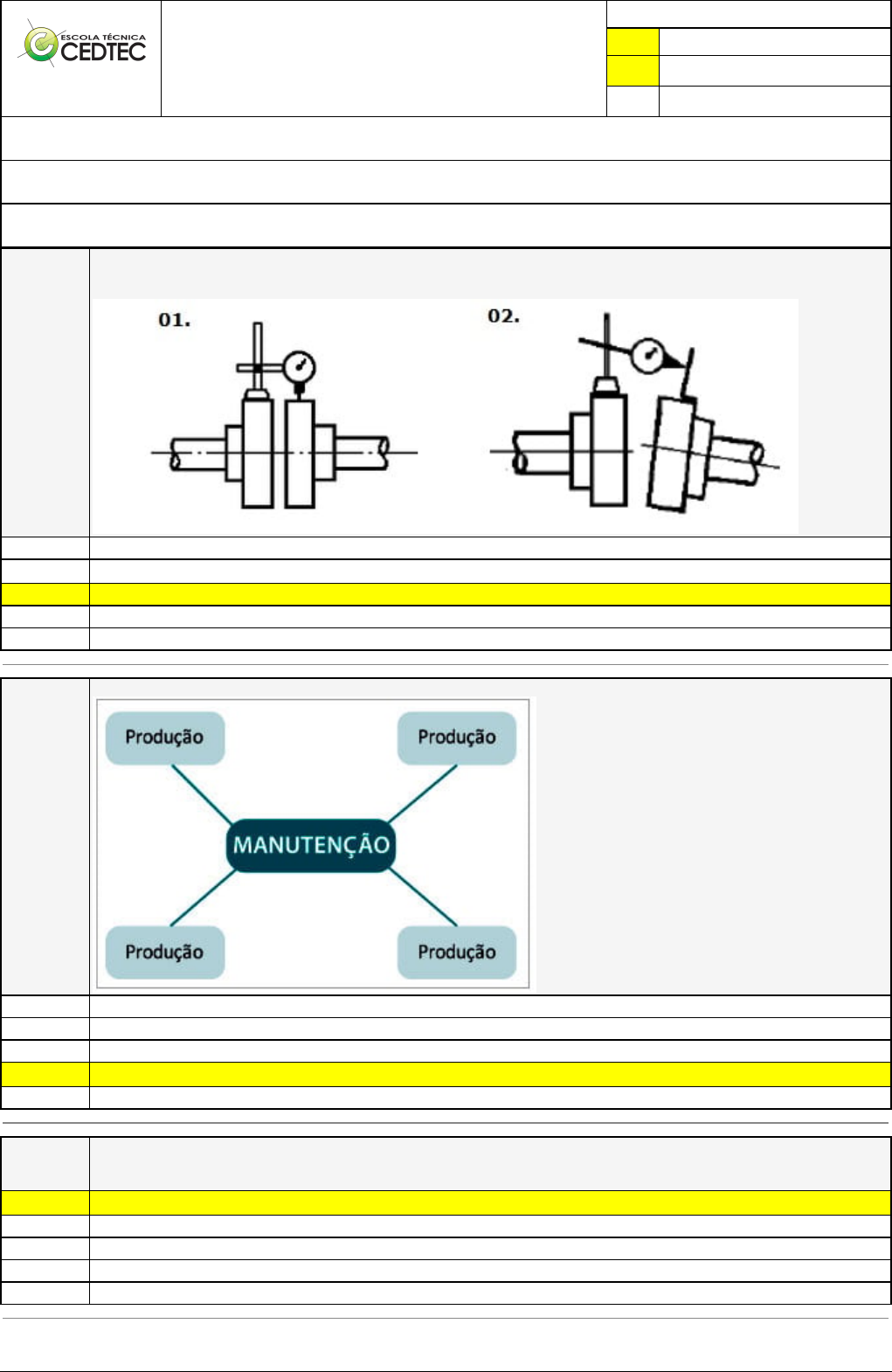 <p>Pincel Atômico - 08/09/2024 07:54:58 1/4</p><p>VANDERLEI FERREIRA</p><p>FREIRE</p><p>Avaliação Presencial (EAD)</p><p>Atividade finalizada em 06/09/2024 02:19:16 (2502132 / 1)</p><p>LEGENDA</p><p>Resposta correta na questão</p><p># Resposta correta - Questão Anulada</p><p>X Resposta selecionada pelo Aluno</p><p>Disciplina:</p><p>MANUTENÇÃO MECÂNICA [1058770] - Avaliação com 20 questões, com o peso total de 51,00 pontos [capítulos - Todos]</p><p>Turma:</p><p>Curso Técnico: Mecânica - Grupo: EAD - 03/24 - EAD MEC [116680]</p><p>Aluno(a):</p><p>91584633 - VANDERLEI FERREIRA FREIRE - Respondeu 17 questões corretas, obtendo um total de 43,35 pontos como nota</p><p>[192_7606]</p><p>Questão</p><p>001</p><p>Quando posicionamos o relógio comparador para detectarmos um desalinhamento de uma máquina rotativa estamos obtendo</p><p>informações para realizarmos os ajustes dos desalinhamentos.</p><p>Analisando as imagens abaixo de desalinhamento, podemos concluir que:</p><p>Desalinhamento 1. paralelo e 2. radial</p><p>X Desalinhamento 1. angular e 2. radial</p><p>Desalinhamento 1. radial e 2. angular</p><p>Desalinhamento 1. angular e 2. axial</p><p>Desalinhamento 1. radial e 2. paralelo</p><p>[192_53341]</p><p>Questão</p><p>002</p><p>A Figura abaixo mostra de forma esquemática a concepção de que Forma Administrativa de Organização da Manutenção?</p><p>Manutenção Five.</p><p>Manutenção Total.</p><p>Manutenção Toyota Five.</p><p>X Manutenção Centralizada.</p><p>Manutenção Preventiva.</p><p>[192_296648]</p><p>Questão</p><p>003</p><p>Não podemos afirmar como irregularidade que podem ser encontradas nos cabos de aço:</p><p>X Baixa lubrificação</p><p>Desgastes localizados</p><p>Redução no diâmetro dos cabos</p><p>Costuras inadequadas ou avariadas</p><p>Gaiola de passarinho</p><p>Pincel Atômico - 08/09/2024 07:54:58 2/4</p><p>[192_53343]</p><p>Questão</p><p>004</p><p>Identifique as informações abaixo sobre Tagueamento e marque com V (Verdadeiro) e F (Falso) e marque a afirmativa correta:</p><p>( ) O Tagueamento ou etiquetagem é a base da organização da manutenção, com ele conseguimos planejar e controlar a manutenção</p><p>de uma forma mais rápida.</p><p>( ) É possível através do Tagueamento armazenar e extrair informações, como os dados do equipamento, sua localização na empresa e</p><p>seu histórico de funcionamento, entre outros.</p><p>( ) Não é necessário o Tagueamento individual do equipamento desde que o mesmo esteja montado na mesma máquina.</p><p>( ) A quantidade de dígitos do código não em função de cada organização produtiva.</p><p>V. F. F. F.</p><p>V. V. F. V.</p><p>V. V. V. V.</p><p>F. V. F. F.</p><p>X V. V. F. F.</p><p>[192_296652]</p><p>Questão</p><p>005</p><p>Caso seje detectado um defeito de rompimento nos cabos de aço, é obrigatório:</p><p>X Substituição imediata, sem o uso do equipamento</p><p>Realizar a troca somente na próxima parada de manutenção</p><p>Não realizar a tarefa de movimentação de carga e deixar o tempo passar</p><p>Dar continuidade do seu uso até segunda ordem</p><p>A manutenção de soldagem poderá solucionar o problema</p><p>[192_155129]</p><p>Questão</p><p>006</p><p>Os tipos de rolamentos construídos para suportarem cargas perpendiculares ao eixo são conhecidos pelo nome de rolamentos:</p><p>Rolamento de agulha</p><p>Autocompensadores</p><p>Mistos</p><p>X Radiais</p><p>Axiais</p><p>[192_53293]</p><p>Questão</p><p>007</p><p>A normalização técnica dos produtos científicos e tecnológicos documentais é fundamental para a total e ampla compreensão e</p><p>identificação dos mesmos também no universo da manutenção. São exemplos de entidades representativas que se destina a</p><p>padronizar as técnicas de produção feitas no país.</p><p>ABRAMAN - Associação Brasileira de Manutenção Nacional.</p><p>PNQC – Programa Nacional de Qualificação e Cientifica.</p><p>ABRAMAN - Associação Brasileira de Manutenção Naval.</p><p>PNQC – Presidência Nacional de Qualificação e Certificação.</p><p>X ABNT - Associação Brasileira de Normas Técnicas.</p><p>[192_53335]</p><p>Questão</p><p>008</p><p>Organização e controle centralizados, com agrupamentos específicos de manutenção, distribuídos pelas áreas de produção, sem,</p><p>contudo estarem subordinados diretamente ao chefe de produção da área. São características de que tipo de Formas Administrativas</p><p>de Organização da Manutenção?</p><p>Manutenção Mista Total.</p><p>Manutenção Preventiva.</p><p>X Manutenção Mista.</p><p>Manutenção Mista Toyota.</p><p>Manutenção Mista de Preventiva.</p><p>[192_049]</p><p>Questão</p><p>009</p><p>Qual acessório para movimentação de carga é composto por arame, perna e alma?</p><p>Tirfor</p><p>Cintas nylon.</p><p>Lingas de correntes.</p><p>X Cabo de aço.</p><p>Cordas.</p><p>[192_155143]</p><p>Questão</p><p>010</p><p>Que tipo de falha em rolamento é considerada de estágio secundário?</p><p>Corrosão</p><p>X Descascamento</p><p>Arranhamento</p><p>Pincel Atômico - 08/09/2024 07:54:58 3/4</p><p>Deterioração de superfície</p><p>Dano por corrente elétrica</p><p>[355_296628]</p><p>Questão</p><p>011</p><p>São utilizadas no manejo de cargas:</p><p>Alinhador</p><p>X Talhas</p><p>Potênciometro</p><p>Pirômetro</p><p>Pára-raio</p><p>[359;_2661]</p><p>Questão</p><p>012</p><p>A entrada de partículas no contato entre dentes das engrenagens de um redutor podem provocar desgaste por:</p><p>Adesão</p><p>X Abrasão</p><p>Calor</p><p>Escoamento plástico</p><p>Fadiga</p><p>[355_296620]</p><p>Questão</p><p>013</p><p>Não podemos afirmar como sendo ferramenta manual usado na desmontagem e montagem de equipamentos:</p><p>Alicate de corte</p><p>Chave cruzada</p><p>X Manômetro</p><p>Chave combinada</p><p>Chave torx</p><p>[355_6821]</p><p>Questão</p><p>014</p><p>O que fazer quando houver trincas ou lascados no anel interno, no anel externo, nos corpos rol