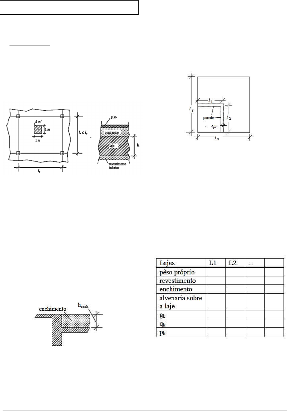 <p>Prof. José Renato de Castro Pessôa CONCRETO II – UESC Ref.: Curso de Concreto Armado – José Milton de Araújo 1</p><p>Aula 1 - Pré-dimensionamento do Projeto</p><p>Estrutural – Projeto Estrutural</p><p>Determinação das estimativas de cargas atuantes</p><p>nos elementos estruturais de edifícios</p><p>a) Cargas nas lajes</p><p>As lajes constituem elementos planos que suportam</p><p>cargas transversais que podem ser definidas por</p><p>unidade de área.</p><p>Normalmente, as lajes têm, em planta, forma retangular</p><p>de dimensões lx por ly (vãos teóricos), onde,</p><p>convencionalmente, adota-se lx ≤ ly.</p><p>A) Peso Próprio:</p><p>g1 = peso próprio (pp) = 25 h (h em m) = X kN/m2</p><p>B) Revestimento:</p><p>Da NBR 6120/2019, para revestimentos de pisos</p><p>residenciais e comerciais, com espessura de 5 cm e</p><p>peso específico ����� = 20��/�³, tem-se:</p><p>g2 = revestimento (rev) = 1 kN/m2</p><p>C) Enchimento:</p><p>Segundo a NBR 6120/2019, quando a laje for</p><p>rebaixada, o nivelamento necessita de material de</p><p>enchimento que, geralmente, é constituído de entulho</p><p>de obra cujo peso específico é da ordem de 15 kN/m3.</p><p>g3 = enchimento = 15 hench (hench em m) = X kN/m2.</p><p>D) Alvenaria:</p><p>Quando existir parede construída diretamente sobre a</p><p>laje, o seu peso pode ser considerado através de uma</p><p>carga distribuída equivalente aplicada sobre toda a</p><p>área da laje.</p><p>Como pode se ver na figura:</p><p>���� = ����(�� + ��)������</p><p>PD = pé direito</p><p>alv = 18 kN/m³ (tijolo maciço) e 13 kN/m³ (tijolo furado)</p><p>g4 = alvenaria direta sobre a laje = Gpar / (lx . ly) = X</p><p>kN/m2.</p><p>E) Carga Acidental:</p><p>Definidas na NBR 6120/2019.</p><p>q = carga acidental sobre a laje = X kN/m2</p><p>Tem-se, assim, atuando sobre as lajes a carga</p><p>permanente total (gk)= g1 + g2 + g3 + g4 e a carga</p><p>acidental (qk).</p><p>Pode-se adotar a seguinte disposição prática para o</p><p>levantamento da carga total atuando sobre a laje pk = gk</p><p>+ qk com a construção da seguinte tabela:</p><p>A figura a seguir mostra um esquema estrutural onde</p><p>se tem:</p><p>- 3 lajes, 5 vigas e 4 pilares.</p><p>- L1 em balanço que recebe um parapeito periférico em</p><p>alvenaria de 1,2 m de altura de 15 cm de espessura.</p><p>- L2 com duas paredes de alvenaria de 15 cm de</p><p>espessura.</p><p>Prof. José Renato de Castro Pessôa CONCRETO II – UESC Ref.: Curso de Concreto Armado – José Milton de Araújo 2</p><p>- L3 com rebaixo de 25 cm.</p><p>- As vigas suportam paredes de alvenaria de 25 cm,</p><p>exceto a V4 com parede de 15 cm.</p><p>- As alvenarias são de tijolo maciço com alv = 16 kN/m3.</p><p>(Pé direito = 3 m)</p><p>A tabela seguinte apresenta as cargas sobre as lajes,</p><p>bem como, as suas diversas parcelas. (cargas em</p><p>kN/m).</p><p>Exercício 1:</p><p>Apresentar uma memória de cálculo com todos os</p><p>cálculos para se chegar aos resultados</p><p>apresentados no quadro (cargas nas lajes), ou seja:</p><p>Cálculo para g, q e p.</p><p>b) Cargas nas vigas</p><p>Normalmente, as cargas atuantes nas vigas são</p><p>constituídas de cargas distribuídas (por unidade de</p><p>comprimento da viga).</p><p>Eventualmente, pode-se ter cargas concentradas que</p><p>correspondem às reações de outras vigas apoiadas</p><p>(apoio indireto).</p><p>As cargas distribuídas podem ser compostas de 3</p><p>parcelas:</p><p>g1 = peso próprio da viga = 25 bw h (kN/m).</p><p>g2 = peso da alvenaria = ealv (PD - h) alv</p><p>alv = 18 kN/m³ em bloco cerâmico maciço e 14 kN/m³</p><p>em bloco cerâmico vazado com parede maciça.</p><p>Usualmente, desprezam-se os vazios correspondentes</p><p>a portas e janelas.</p><p>Em situações particulares (por exemplo, na presença</p><p>de uma grande janela de acesso à sacada ocupando</p><p>quase todo o vão da parede), pode-se descontar os</p><p>Prof. José Renato de Castro Pessôa CONCRETO II – UESC Ref.: Curso de Concreto Armado – José Milton de Araújo 3</p><p>vazios, adicionando-se, contudo, o peso das</p><p>esquadrias.</p><p>g3 = reações das lajes</p><p>Estas reações podem ser estimadas através do</p><p>método das charneiras plásticas onde, por</p><p>exemplo, a carga atuante numa laje retangular com</p><p>bordos livres é subdividida em quatro partes</p><p>proporcionais às áreas de 2 triângulos e 2 trapézios</p><p>como mostrado na figura a seguir.</p><p>A parcela referente a cada figura é aplicada como carga</p><p>distribuída uniforme sobre a vigas de apoio daquele</p><p>bordo da laje.</p><p>As parcelas correspondentes aos triângulos estarão</p><p>sobre as vigas de apoio dos bordos menores da laje, e</p><p>as dos trapézios sobre os bordos maiores.</p><p>De acordo com a figura mostrada (laje com bordos</p><p>livres), para a carga total p = g+q atuando sobre a laje,</p><p>tem-se:</p><p>�� =</p><p>��. ��</p><p>2 × 2</p><p>∙</p><p>�</p><p>��</p><p>=</p><p>���</p><p>4</p><p>�� =</p><p>�� + �� − ��</p><p>2</p><p>∙</p><p>��</p><p>2</p><p>∙</p><p>�</p><p>��</p><p>�� =</p><p>���</p><p>4</p><p>�2 −</p><p>��</p><p>��</p><p>�</p><p>�� = �� �2 −</p><p>��</p><p>��</p><p>�</p><p>As reações das lajes, (g + q), são:</p><p>g = reação da carga permanente da laje;</p><p>q = reação da carga acidental que atua sobre a laje.</p><p>Para o exemplo anterior, tem-se:</p><p>peso próprio da viga:</p><p>�� = 25��ℎ = �</p><p>25 . 0,12 . 0,50 = 1,50 ��/� − �� � ��</p><p>25 . 0,12 . 0,45 = 1,35 ��/� − �� � ��</p><p>Admitindo-se que as paredes sejam de tijolo maciço, as</p><p>externas com 25 cm e as internas com 15 cm, tem-se:</p><p>peso da alvenaria:</p><p>�� = ����(�� − ℎ)����</p><p>�� = �</p><p>0,25 . (3,0 − 0,50) . 16 = 10,