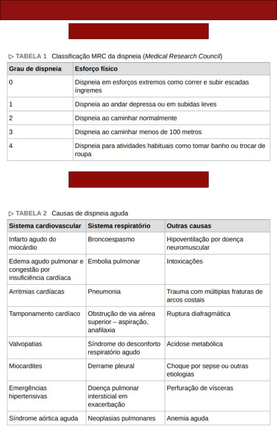 <p>Dispneia</p><p>Classificação</p><p>• A classificação do órgão britânico MRC (Medical Research Council) parece ser a mais adequada</p><p>Etiologia</p><p>• Dispneia crônica: asma, DPOC, IC</p><p>Achados clínicos</p><p>• EXAME FÍSICO:</p><p>- Inspeção (cabeça e pescoço, tórax, extremidades)</p><p>- Ausculta respiratória e cardíaca</p><p>.</p><p>.</p><p>Exames complementares</p><p>• O 1° passo na investigação diagnóstica da dispneia é determinar o órgão primariamente envolvido</p><p>• Em 80% dos casos a história e o exame físico são suficientes para o diagnóstico</p><p>- No entanto, os exames complementares podem ajudar</p><p>• EXAMES DE 1a LINHA:</p><p>- ECG: pode revelar arritmias cardíacas, distúrbios de condução, hipertrofia ventricular,</p><p>alterações isquêmicas e doença pericárdica</p><p>- RX TÓRAX: pode revelar alterações pulmonares, de parede torácica e cardíacas</p><p>- HEMOGRAMA E PERFIL METABÓLICO: anemia pode ser causa de dispneia. Acidose</p><p>respiratória pode ocorrer em DPOC e em doenças neuromusculares, assim como acidose</p><p>metabólica pode ocorrer em uremia, cetoacidose diabética e IC com baixo débito</p><p>- ESPIROMETRIA: pode fazer diagnóstico de doença obstrutiva ou doença intersticial. Pode ser</p><p>utilizado o peak flow na indisponibilidade</p><p>- OXIMETRIA DE PULSO: importante para avaliação da gravidade dos doentes e, se anormal,</p><p>pode ser útil a realização de gasometria arterial.</p><p>- POCUS (USG À BEIRA LEITO): pode verificar a presença de linhas B indicando infiltrado</p><p>intersticial, consolidação, sinais de pneumotórax ou derrame pleural</p><p>• EXAMES DE 2a LINHA:</p><p>- Prova de função pulmonar, ecocardiograma, BNP, gasometria arterial, TC, holter, cintilografia</p><p>O BNP aumenta em formas mais avançadas ou crônicas de IC, podendo ser usado</p><p>para diferenciar quadros cardíacos de pulmonares em unidades de emergência.</p><p>Quanto maior o BNP, maior é a probabilidade do diagnóstico de IC</p><p>BNP > 400 pg/mL, têm grande valor preditivo positivo</p><p>BNP < 100 pg/mL, têm valor preditivo negativo</p><p>Tratamento</p><p>• Todos os pacientes com dispneia devem ser encaminhados para a sala de emergência e receber as</p><p>medidas iniciais de atendimento ao paciente grave, incluindo O2 suplementar e IOT, se precisar</p><p>- Na primeira avaliação, alguns achados sugerem parada respiratória iminente, como</p><p>rebaixamento do nível de consciência, inabilidade de manter o esforço respiratório e cianose</p><p>- Pacientes com insuficiência respiratória necessitarão de suporte ventilatório. Em pacientes sem</p><p>contraindicação, a ventilação não invasiva (VNI) é preferida em pacientes com exacerbação de</p><p>DPOC, congestão pulmonar e imunossuprimidos com infecção respiratória</p><p>• O tratamento definitivo depende da etiologia</p><p>• Oxigênio deve ser obrigatoriamente suplementado em todos os pacientes com hipoxemia, mas a</p><p>evidência de benefício de oxigênio para alívio da dispneia é limitada</p><p>- A oxigenoterapia é benéfica para pacientes com hipoxemia significativa (PaO2 < 55 mmHg)</p><p>Lembrar que pacientes com condições com risco de acidose respiratória como exacerbação</p><p>de DPOC têm alvo de SaO2 de 88 a 92%, enquanto em outros pacientes o alvo é de 94%</p><p>• Os pacientes com insuficiência respiratória com necessidade de suporte ventilatório, instabilidade</p><p>hemodinâmica ou outra condição ameaçadora à vida devem ser internados em UTI</p>