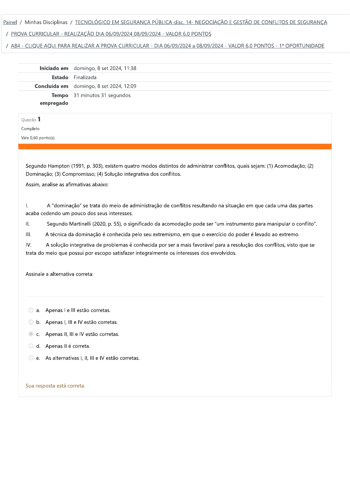 <p>Painel / Minhas Disciplinas / TECNOLÓGICO EM SEGURANÇA PÚBLICA-disc. 14- NEGOCIAÇÃO E GESTÃO DE CONFLITOS DE SEGURANÇA / PROVA CURRICULAR - REALIZAÇÃO DIA 06/09/2024 08/09/2024 - VALOR PONTOS / AB4 - CLIQUE AQUI PARA REALIZAR A PROVA CURRICULAR DIA 06/09/2024 a 08/09/2024 VALOR 6,0 PONTOS - OPORTUNIDADE Iniciado em domingo, 8 set 2024, 11:38 Estado Finalizada Concluída em domingo, 8 set 2024, 12:09 Tempo 31 minutos 31 segundos empregado Questão 1 Completo Vale 0,60 ponto(s). Segundo Hampton (1991, p. 303), existem quatro modos distintos de administrar conflitos, quais sejam: (1) Acomodação; (2) Dominação; (3) Compromisso; (4) Solução integrativa dos conflitos. Assim, analise as afirmativas abaixo: I. A "dominação" se trata do meio de administração de conflitos resultando na situação em que cada uma das partes acaba cedendo um pouco dos seus interesses. II. Segundo Martinelli (2020, p. 55), o significado da acomodação pode ser "um instrumento para manipular o conflito". III. A técnica da dominação é conhecida pelo seu extremismo, em que o exercício do poder é levado ao extremo. IV. A solução integrativa de problemas é conhecida por ser a mais favorável para a resolução dos conflitos, visto que se trata do meio que possui por escopo satisfazer integralmente os interesses dos envolvidos. Assinale a alternativa correta: a. Apenas I e III estão corretas. b. Apenas I, III e IV estão corretas. C. Apenas II, III e IV estão corretas. d. Apenas é correta. e. As alternativas I, II, III e IV estão corretas. Sua resposta está correta.</p><p>Questão 2 Completo Vale 0,60 ponto(s). Ainda se tratando da administração de conflitos, se faz pertinente citar Pinzón e (1996 apud MARTINELI, 2020, p. 58), que ensinam quatro maneiras de lidar com a outra parte quando um indivíduo está em conflito. São elas: I. "Confronto Direto" - Nesse caso, pode acontecer com ou sem diálogo anterior. Nessas situações de confronto direto, o mais forte tende atingir seus objetivos em detrimento do mais fraco. II. "Abandonar todos os seus objetivos e ceder as decisões da outra parte" - Nessa situação, uma das partes abandona todos os seus objetivos cedendo as decisões que a outra parte tomar. III. "Negociar com o outro lado, buscando atingir seus interesses, porém fazendo certas concessões para que os interesses da outra parte também sejam satisfeitos". IV. "Buscar ou aceitar a intervenção de uma terceira parte, que pode ter autonomia para impor uma solução". É correto o que se afirma em: a. As alternativas I, II, III e IV estão corretas. b. Apenas e III estão corretas. C. Apenas II é correta. d. Apenas II, III e IV estão corretas. e. Apenas I, III e IV estão corretas. Sua resposta está correta.</p><p>Questão 3 Completo Vale 0,60 ponto(s). O termo "negócio" tem a sua origem no latim "negotium", "atividades de compra e venda", o que literalmente significa "ausência de folga". Surge da combinação de "nec" (nem, não), advérbio de negação, e "otium" (ócio, repouso), formando a palavra "negocium" (negócio), que significa largar o ócio, deixar o status quo para em direção ao objetivo, ou seja, um acordo. Assim, quanto a terminologia "negócio", analise as afirmativas abaixo: I. A negociação precisa ser necessariamente de forma verbal e presencial, ela não pode ocorrer por meio de mensagens, vídeos, cartas e demais tecnologias. II. A negociação também pode ser feita por meio de intervenção de terceiro, pela qual este terceiro, quando convidado para buscar uma solução para o conflito, poderá detectar vários caminhos para abordar determinada controvérsia, delineando um panorama geral para as possibilidades de negociação para a composição do conflito. III. Se trata de uma disputa, podendo envolver duas ou mais pessoas, que, por meio exclusivo da legislação busca a resolução de um conflito. IV. A negociação ou barganha, é o processo de tomar decisões conjuntas quando as partes envolvidas têm preferências diferentes [...] as partes envolvidas precisam chegar a alguma forma de acordo ou consenso sobre assuntos ou pendências que as afetam direta ou diretamente. Assinale a alternativa correta: a. Apenas I e III estão corretas. b. Apenas II é correta. C. Apenas II e IV estão corretas. d. As alternativas I, II, III e IV estão corretas. e. Apenas II, III e IV estão corretas. Sua resposta está correta.</p><p>Questão 4 Completo Vale 0,60 ponto(s). Passamos a transformar os conflitos em oportunidades, quando buscamos a sua resolução de maneira efetiva e sustentável. Pois, a maneira que lidamos com a lide, influenciará diretamente no relacionamento dos envolvidos. Com base nisto, analise as afirmativas abaixo: I. enfoque da parceria entre os conflitantes é muito importante para a construção do relacionamento em geral, de modo que possibilita que as partes cheguem a soluções que atendam às necessidades individuais e compartilhadas, com benefícios mútuos prolongando o relacionamento. II. A Academia Nacional do FBI define o gerenciamento de crises como "o processo de identificar, obter e aplicar recursos necessários à antecipação, prevenção e resolução de uma crise". III. O gerenciamento de crises é o processo estabelecido para possibilitar o atendimento das ocorrências policiais críticas, de maneira técnica e integrada, por parte de todos os responsáveis pelas ações, visando à resolução aceitável. IV. A falta de conhecimento e desenvolvimento de habilidades acerca das estratégias no âmbito da gestão de negociação de conflitos pode, por consequência, trazer resultados prejudiciais aos grupos policiais. Assinale a alternativa correta: a. Apenas II, III e IV estão corretas. b. Apenas e III estão corretas. C. Apenas é correta. d. Apenas I, e IV estão corretas. e. As alternativas I, II, III e IV estão corretas. Sua resposta está correta.</p><p>Questão 5 Completo Vale 0,60 ponto(s). "Líderes, 