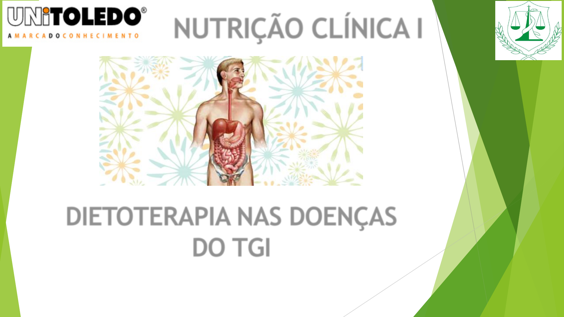 <p>Professora: Me. Mariane Pravato Munhoz Gonçalves</p><p>Araçatuba</p><p>2020</p><p>NUTRIÇÃO CLÍNICA I</p><p>DIETOTERAPIA NAS DOENÇAS</p><p>DO TGI</p><p>• DISFUNÇÕES ESOFÁGICAS E GÁSTRICAS - (Refluxo,</p><p>hérnia hiatal, gastrites)</p><p>• DISFUNÇÕES INTESTINAIS - (Síndrome do intestino</p><p>irritável, constipação, diarreia e doenças diverticulares)</p><p>DOENÇAS DO TRATO GASTROINTESTINAL</p><p>Professora: Me. Mariane Pravato Munhoz Gonçalves</p><p>Araçatuba</p><p>2020</p><p>NUTRIÇÃO CLÍNICA I</p><p>REFLUXO GASTROESOFÁGICO E HÉRNIA DE HIATO</p><p>COMO OCORRE O RGE</p><p>Ocorre devido a pressão ou contração inadequada do</p><p>esfíncter inferior (EEI) após a passagem do alimento,</p><p>permitindo assim o retorno do conteúdo gástrico ácido (HCL).</p><p>APARECIDO-GONÇALVES, T. dos S.; AMARAL, P. F. G. P. do; SOARES, A. A.; RODRIGUES, M. de L.; BERTINELI, L. M. S.; GERMANO, R. de M. A conduta dietoterápica no tratamento da doença</p><p>do refluxo gastroesofágico – relato de caso. Arq. Cienc. Saúde UNIPAR, Umuarama, v. 20, n. 3, p, 199-203, set./dez. 2016.</p><p>De promover o controle do EEI, por</p><p>meio da ingestão de nutrientes</p><p>adequados que causam controle na</p><p>contração.</p><p>A NUTRIÇÃO TEM O POTENCIAL</p><p>SINTOMAS DO RGE</p><p>•Pirose (azia): sensação de “queimação” no peito que</p><p>costuma ocorrer logo após a ingestão de alimentos;</p><p>•Regurgitação: (gosto ácido, halitose e azedo), podendo</p><p>provocar náuseas e vômitos em algumas pessoas;</p><p>•Excesso de saliva;</p><p>•Dores de garganta sem causas aparentes;</p><p>•Tosse, rouquidão e asma.</p><p>•Otite, sinusite.</p><p>OS FATORES PRÉ DISPOENTES ENVOLVEM</p><p>•Estresse: promove secreção excessiva de HCL.</p><p>•Dieta: alguns alimentos promovem o relaxamento</p><p>do EEI;</p><p>•Tabagismo: causa redução no tônus do esfíncter;</p><p>•Obesidade: acúmulo de gordura no abdômen</p><p>aumenta a pressão no estômago;</p><p>KRAUSE, 2018.</p><p>OS FATORES PRÉ DISPOENTES ENVOLVEM</p><p>•Hormônios envolvidos com a gravidez</p><p>•Anticoncepcionais orais – (progesterona);</p><p>•Úlcera péptica – (com a presença de H. Pylori);</p><p>•Uso de antiinflamatório;</p><p>•Hérina de Hiato: Doença em que parte do estômago se</p><p>projeta para dentro do tórax, facilitando o retorno do</p><p>conteúdo ácido para o interior do esôfago e levando à</p><p>ocorrência do RGE.</p><p>SINTOMAS DA HÉRNIA DE HIATO</p><p>Costumam surgir cerca de 30 minutos após as refeições</p><p>e tendem a desaparecer pouco tempo depois:</p><p>•Azia e queimação na garganta;</p><p>•Dificuldade para engolir;</p><p>•Tosse seca e irritativa;</p><p>•Sabor amargo frequente e mau hálito;</p><p>•Arrotos frequentes;</p><p>•Sensação de digestão lenta;</p><p>•Vontade de vomitar frequente.</p><p>Esses sintomas também podem ser indicativos de RGE e,</p><p>por isso, é comum que o RGE seja diagnosticado antes</p><p>da hérnia de hiato.</p><p>TRATAMENTOS:</p><p>•Medicamentosos;</p><p>•Cirúrgicos;</p><p>•Nutricionais.</p><p>MEDICAMENTOSOS VISA PROMOVER</p><p>FALTA DE ÁCIDO</p><p>A HIPOCLORIDRIA É A:</p><p>•Redução de ácido do estômago que interfere</p><p>diretamente na digestão de alimentos e na absorção de</p><p>nutrientes tais como:</p><p>• Aminoácidos – (MM);</p><p>• Cálcio – (saúde dos ossos)</p><p>• Magnésio – (SN, contração);</p><p>• Zinco – (cofator enzimático</p><p>em mais de 200 reações)</p><p>Sendo comum nesses pacientes as queixas de</p><p>gases, estufamentos, dores de cabeça</p><p>(enxaquecas +).</p><p>Deficiência de B12,</p><p>causando a chamada</p><p>anemia perniciosa,</p><p>levando a sintomas</p><p>como cansaço e falta</p><p>de energia.</p><p>além</p><p>O paciente com RGE sente grande sensação de</p><p>desconforto e dor (conteúdo ácido), por isso para</p><p>esse paciente é utilizado frequentemente pelos</p><p>médicos o tratamento</p><p>•Medicamentoso;</p><p>Esse medicamento, tem o potencial de neutralizar</p><p>o pH do estômago evitando que retorne o</p><p>conteúdo ácido impedido que ocorram lesões no</p><p>esôfago (ESOFAGITE).</p><p>No entanto: Estudos recentes mostram que seu uso</p><p>prolongado pode dobrar risco de câncer de</p><p>estômago.</p><p>A TERAPIA NUTRICIONAL SE</p><p>BASEAIA</p><p>• Na redução dos alimentos de difícil digestibilidade, flatulentos e</p><p>fermentáveis.</p><p>• O fracionamento da alimentação deve ser aumentado a fim de</p><p>evitar desconforto e o aumento da pressão abdominal.</p><p>• O volume das refeições deve ser diminuído para evitar</p><p>distensão intra-abdominal e a estimulação do ácido clorídrico.</p><p>• A temperatura não dever ser elevada, visto que alimentos</p><p>quentes aumentam a congestão da mucosa gástrica, e a</p><p>secreção ácida, assim como no tempo de esvaziamento</p><p>gástrico, fazendo com que o alimento fique por mais tempo no</p><p>estômago.</p><p>(MAHAN; ESCOTTSTUMP; RAYMOND, 2013).</p><p>Hiperproteica em decorrência da</p><p>liberação de</p><p>> 1,0g/kg</p><p>colecistoquinina</p><p>VITAMINAS E MINERAIS:</p><p>•Micronutrientes relevantes no tratamento do RGE:</p><p>• Vitamina C – (absorção de Fe, antioxidante,</p><p>imunidade, síntese de colágeno e cicatrização);</p><p>• Vitaminas do Complexo B – (envolvida no</p><p>metabolismo dos CHO e LIP)</p><p>•Zinco – (sistema imune, melhora da resposta</p><p>inflamatória provocada pelo refluxo)</p><p>Todas as medidas terapêuticas buscam melhorar a</p><p>função motora do esôfago, aumentar a pressão do</p><p>esfíncter EEI, assim como reduzir o prejuízo causado</p><p>pela acidez gástrica, neutralizando-a ou mesmo</p><p>suprimindo-a.</p><p>As queixas são ainda maiores</p><p>com consumo de vinho tinto</p><p>quando comparadas a cerveja</p><p>ALIMENTOS A SEREM EVITADOS:</p><p>Alimentos que diminuam a pre