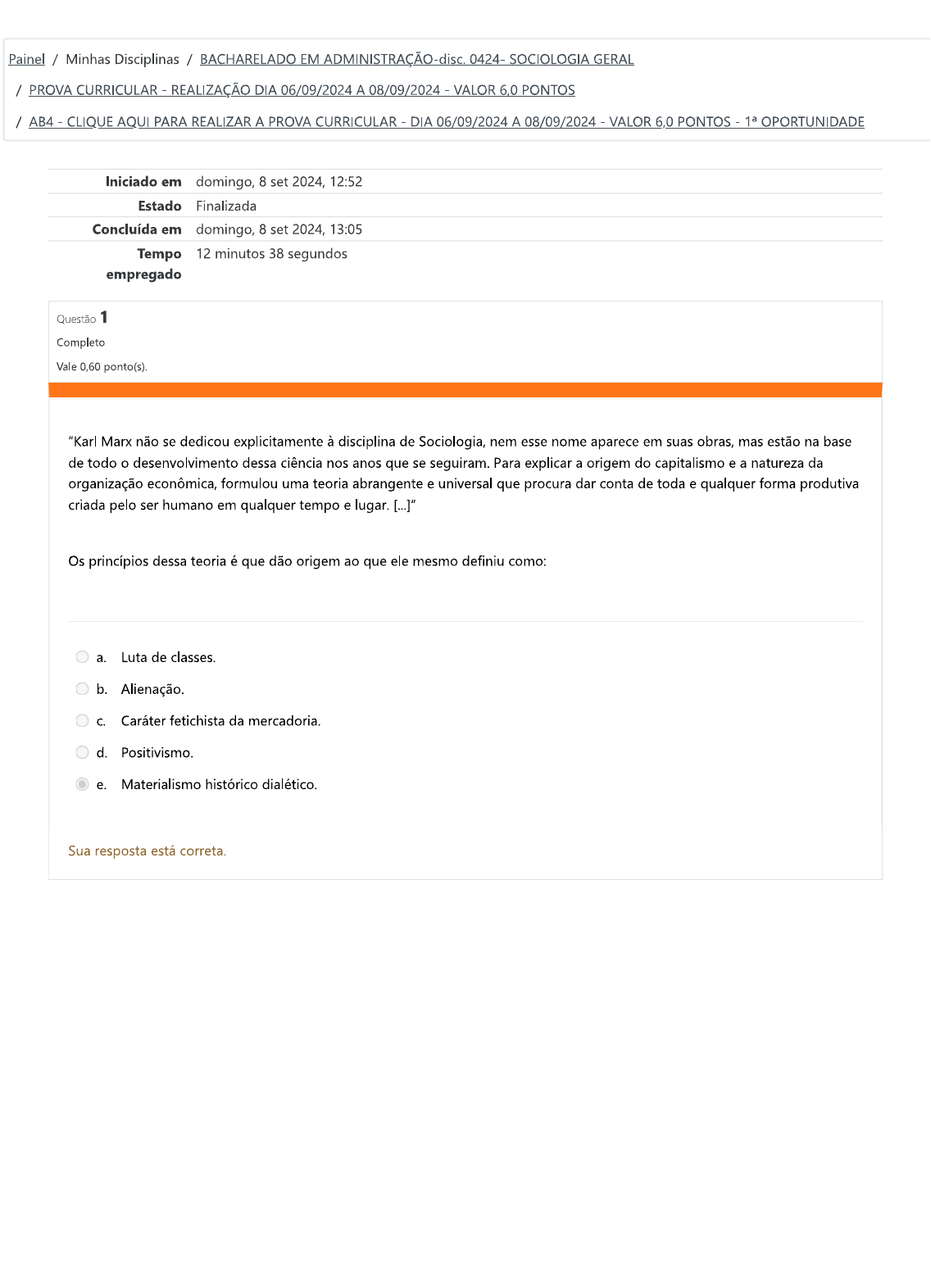<p>Painel / Minhas Disciplinas / BACHARELADO EM ADMINISTRAÇÃO-disc 0424- SOCIOLOGIA GERAL / PROVA CURRICULAR - REALIZAÇÃO DIA 06/09/2024 A 08/09/2024 - VALOR PONTOS / AB4 - CLIQUE AQUI PARA REALIZAR A PROVA CURRICULAR - DIA 06/09/2024 A 08/09/2024 - VALOR 6,0 PONTOS - OPORTUNIDADE Iniciado em domingo, 8 set 2024, 12:52 Estado Finalizada Concluída em domingo, 8 set 2024, 13:05 Tempo 12 minutos 38 segundos empregado Questão 1 Completo Vale 0,60 ponto(s). "Karl Marx não se dedicou explicitamente à disciplina de Sociologia, nem esse nome aparece em suas obras, mas estão na base de todo o desenvolvimento dessa ciência nos anos que se seguiram. Para explicar a origem do capitalismo e a natureza da organização econômica, formulou uma teoria abrangente e universal que procura dar conta de toda e qualquer forma produtiva criada pelo ser humano em qualquer tempo e lugar. [...]" Os princípios dessa teoria é que dão origem ao que ele mesmo definiu como: a. Luta de classes. b. Alienação. C. Caráter fetichista da mercadoria. d. e. Materialismo histórico dialético. Sua resposta está correta.</p><p>Questão 2 Completo Vale 0,60 ponto(s). "Todos nós vivemos em sociedade, e até o mais remoto ermitão é um ser humano que já foi socializado e optou pelo isolamento da sociedade. Entretanto, isolamento individual não é isolamento da sociedade. O mero ato de pensar é um ato social; aprender a linguagem é um ato social. Embora qualquer um de nós venha ao mundo com a capacidade de aprender línguas, só as aprendemos em contato com o mundo social. Essa constatação simples, "vivemos em sociedade", deu origem a muitas reflexões sobre o lugar do indivíduo no mundo." De acordo com o fragmento assinale a alternativa correta: a. Só é ser social se manter relações sociais sem nunca buscar o isolamento social. b. ser social é fruto de uma análise filosófica sem existir na realidade. C. Consideramos seres sociais os que possuem predileção pelo isolamento individual. d. Somos seres sociais por mantermos traços que aprendemos na interação social. e. Somos considerados seres sociais por mantermos boas relações com os indivíduos. Sua resposta está correta.</p><p>Questão 3 Completo Vale 0,60 "[...] habitantes de uma península que se abria para o Oriente foram um povo original - comerciantes, navegadores e viajantes que aprenderam a conviver com diferentes povos e culturas, dos quais receberam inúmeras influências e conhecimentos. Além disso, desenvolveram o apreço pela reflexão, dedicando-se à Filosofia. Tinham um estilo de vida urbano e um agudo apreço pela vida pública. [...] não formaram impérios como os egípcios e os mesopotâmios, mas desenvolveram uma cultura diversificada, cuja principal unidade eram as cidades-Estado. Cidades como Atenas, Esparta, Tebas e Corinto, entre outras, eram independentes entre si e cada qual criou suas leis, a sua organização sociopolítica e as suas tradições. Entretanto, compartilhavam a mesma língua, mitologia e tradições, denominada helenística. Essa cultura, posteriormente, foi apropriada pelo Império Romano, que a difundiu pela Europa e pelo Oriente." A que cultura o autor se refere: a. Cultura chinesa. b. Cultura hebraica. C. Cultura grega. d. Cultura Hindu. e. Cultura latina. Sua resposta está correta.</p><p>Questão 4 Completo Vale 0,60 ponto(s). "A principal fonte de divergência entre os autores refere-se à objetividade do conhecimento sociológico. Para alguns autores, o conhecimento sociológico é objetivo, exterior aos indivíduos, cabendo ao sociólogo manter-se neutro na investigação dos fatos sociais. [...]." A citação acima apresenta uma discussão epistemológica (metodológica) a respeito da nova ciência, Sociologia. Que problema epistemológico está sendo citado acima? a. Ao fato que naquele momento histórico, século XIX, não seria possível chegar à conclusão se tal área do conhecimento seria científica ou não, logo, acharam melhor, naquele momento descartar tais discussões. b. problema epistemológico apresentado se refere à defesa da Sociologia ser considerada uma reflexão sociológica e não uma ciência, uma vez que não possui o rigoroso método das ciências, ditas naturais. C. À questão de que alguns acreditavam que a Sociologia seria uma ciência rigorosa, tal qual as ciências da natureza e poderia descartar a subjetividade em suas análises. d. A questão de que a Sociologia deveria ser vista como uma ciência social, isto é, possuindo um caráter subjetivo, característico da consciência humana. e. A discussão se refere ao acordo entre os sociólogos criadores que decidiram que objetividade e subjetividade eram próprias dessa área do conhecimento. Sua resposta está correta.</p><p>Questão 5 Completo Vale 0,60 ponto(s). "[...] acreditava que, em seu estado natural, os homens lutavam uns contra os outros pelo poder e por riqueza. Por isso, os indivíduos abrem mão da liberdade e concebem regras de convivência a fim de garantir condições mínimas de estabilidade. Forma-se, assim, a sociedade civil - que, [...] é sinônimo de Estado. Assinale a alternativa que apresenta o pensador que teorizou acima. a. Thomas Hobbes. b. Immanuel Kant. C. John Locke. d. Montesquieu. e. Lavoisier. Sua resposta está correta.</p><p>Questão 6 Completo Vale 0,60 ponto(s). "[...] conhecido como relativismo cultural: uma tomada de posição perante a diferença cultural, segundo a qual cada cultura deve ser avaliada apenas em seus próprios termos. Portanto, é uma forma de encarar a diversidade sem impor valores e normas alheios. De acordo com o fragmento assinale a alternativa que contenha as afirmativas corretas. I. Podemos considerar o relativismo uma inversão do evolucionismo: se este escalona as diferenças a partir de valores específicos das sociedades ocidentais, o relativismo evita qualquer tipo de escala, analisando as diferenças segundo os termos da própria sociedade
