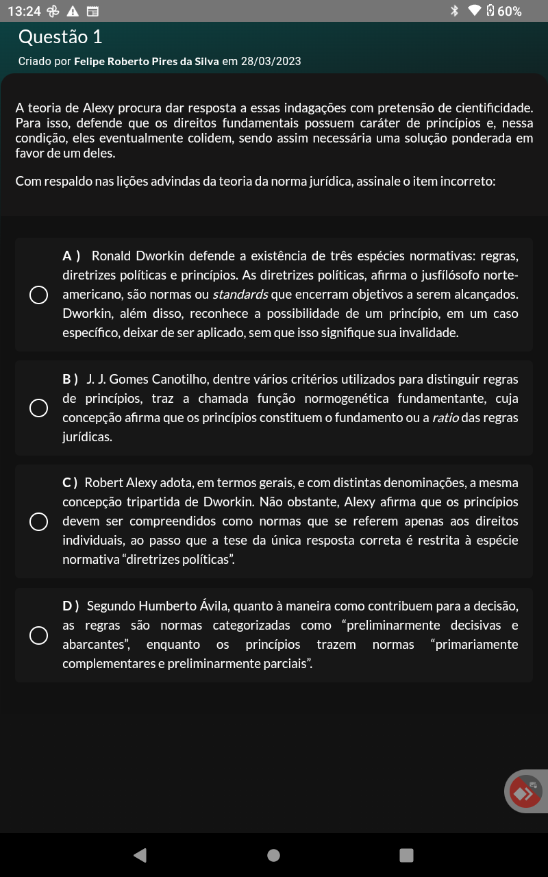 <p>13:24 A Questão 1 Criado por Felipe Roberto Pires da Silva em 28/03/2023 A teoria de Alexy procura dar resposta a essas indagações com pretensão de cientificidade. Para isso, defende que os direitos fundamentais possuem caráter de princípios e, nessa condição, eles eventualmente colidem, sendo assim necessária uma solução ponderada em favor de um deles. Com respaldo nas lições advindas da teoria da norma jurídica, assinale item incorreto: A ) Ronald Dworkin defende a existência de três espécies normativas: regras, diretrizes políticas e princípios. As diretrizes políticas, afirma O norte- americano, são normas ou standards que encerram objetivos a serem alcançados. Dworkin, além disso, reconhece a possibilidade de um princípio, em um caso específico, deixar de ser aplicado, sem que isso signifique sua invalidade. B) J.J. Gomes Canotilho, dentre vários critérios utilizados para distinguir regras de princípios, traz a chamada função normogenética fundamentante, cuja concepção afirma que os princípios constituem fundamento ou a ratio das regras jurídicas. C) Robert Alexy adota, em termos gerais, e com distintas denominações, a mesma concepção tripartida de Não obstante, Alexy afirma que os princípios devem ser compreendidos como normas que se referem apenas aos direitos individuais, ao passo que a tese da única resposta correta é restrita à espécie normativa "diretrizes políticas". D) Segundo Humberto Ávila, quanto à maneira como contribuem para a as regras são normas categorizadas como "preliminarmente decisivas e abarcantes". enquanto os princípios trazem normas "primariamente complementares e preliminarmente parciais".</p>