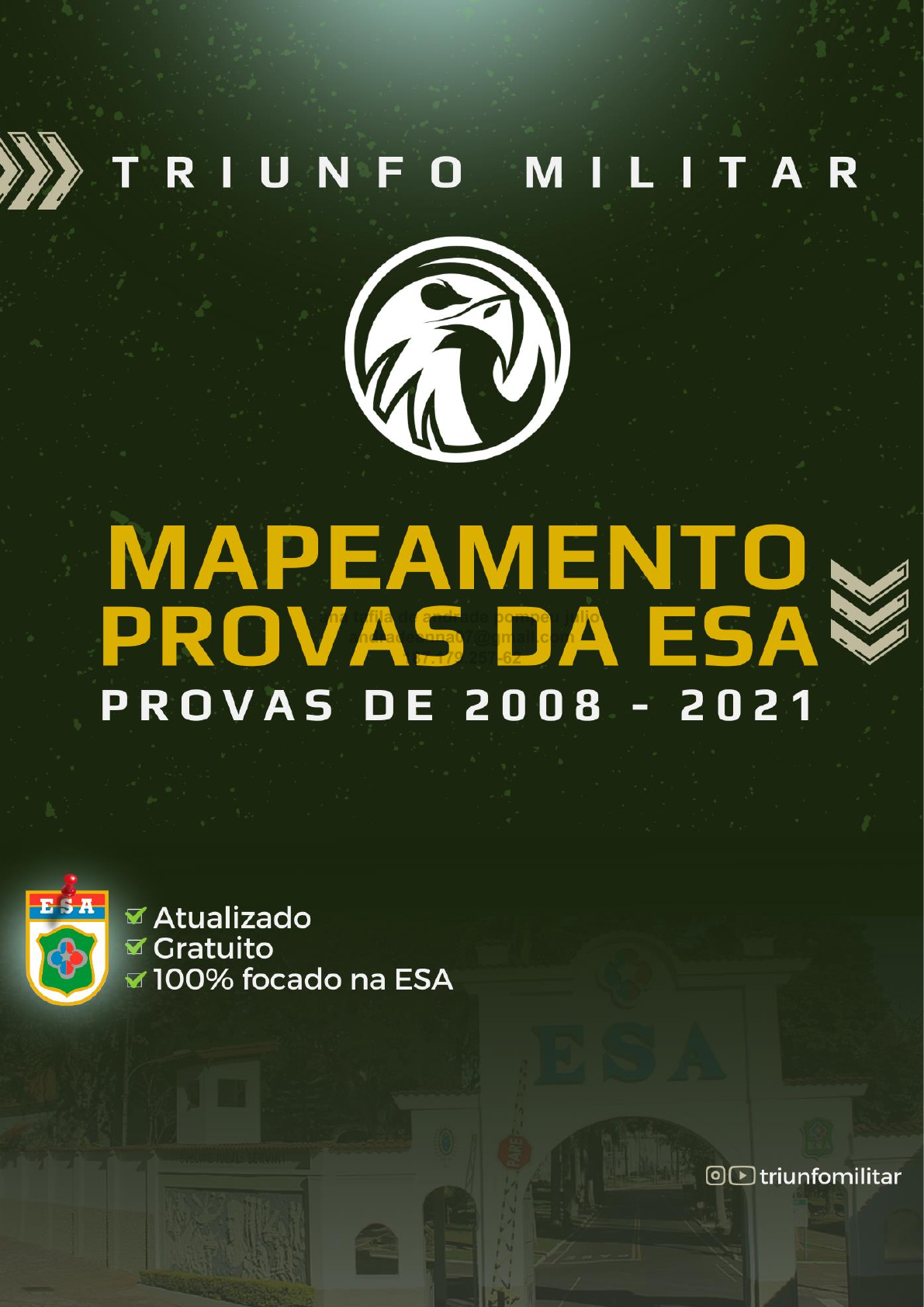 <p>1</p><p>T</p><p>ana tafila de andrade pompeu julio</p><p>andradeanna07@gmail.com</p><p>187.179.257-62</p><p>2</p><p>Sumário</p><p>Apresentação..............................................................................................................................................................................................................003</p><p>Prova da ESA 2008...................................................................................................................................................................................................004</p><p>Prova da ESA 2009...................................................................................................................................................................................................010</p><p>Prova da ESA 2010...................................................................................................................................................................................................016</p><p>Prova da ESA 2011...................................................................................................................................................................................................023</p><p>Prova da ESA 2012...................................................................................................................................................................................................031</p><p>Prova da ESA 2013...................................................................................................................................................................................................040</p><p>Prova da ESA 2014...................................................................................................................................................................................................046</p><p>Prova da ESA 2015...................................................................................................................................................................................................052</p><p>Prova da ESA 2016...................................................................................................................................................................................................058</p><p>Prova da ESA 2017...................................................................................................................................................................................................063</p><p>Prova da ESA 2018...................................................................................................................................................................................................069</p><p>Prova da ESA 2019...................................................................................................................................................................................................075</p><p>Prova da ESA 2020...................................................................................................................................................................................................081</p><p>Prova da ESA 2021...................................................................................................................................................................................................089</p><p>ana tafila de andrade pompeu julio</p><p>andradeanna07@gmail.com</p><p>187.179.257-62</p><p>3</p><p>Hope Hope!</p><p>Pra você que não me conhece, eu sou o Sgt Abrahão do Triunfo Militar.</p><p>O Triunfo Militar é um preparatório para concursos militares que, desde 2020, vem contribuindo com</p><p>a aprovação dos seus alunos utilizando o Método Papiro Insano de Aprovação.</p><p>Essa forma de estudar segue uma sequência de ações já conhecidas pelos concurseiros e validadas por</p><p>milhares de aprovados. Esse modelo de estudo envolve: um bom material de estudo, método de revisão,</p><p>método de resolução de questões e o estudo correto de simulados, mas não paramos por aí...</p><p>Nosso método tem como base também a vibração, a vontade de mudar de vida, o “Papirar até o caderno</p><p>pegar fogo” e, principalmente, a qualidade do estudo, e não somente quantidade de horas estudadas.</p><p>Foi dessa forma que eu fui aprovado em quatro concursos militares, concluí minha formação Sargento</p><p>como 01 da minha turma e ajudei na aprovação de centenas de alunos.</p><p>Esse método foi desenvolvido na prática porque eu já fui concurseiro e sei exatamente como é difícil</p><p>lidar com a falta de motivação, a falta de foco, a dificuldade nas matérias e a dúvida se será possível ser</p><p>aprovado ou não.</p><p>Eu aprendi, na prática, o caminho para superar cada um desses pontos. É isso que ensino aos meus</p><p>alunos nas aulas do curso, nas mentorias que realizo com a Tropa e nos conteúdos que disponibilizo nas</p><p>redes sociais.</p><p>Uma das vertentes do método Papiro Insano é a resolução de questões. Por esse motivo, a equipe do</p><p>Triunfo Militar desenvolveu esse material para você. É um presente para você que deseja colocar o seu</p><p>nome na lista de aprovados no concurso da ESA. Eu tenho certeza de que alguns dos próximos</p><p>aprovados no concurso da ESA, em algum momento, usarão esse material de estudo. Nosso material –</p><p>MAPEAMENTO PROVAS DA ESA | 2008 - 2021 - É 100% gratuito.</p><p>Realizar baterias de questões é um dos melhores treinamentos para a sua prova. Refazer as questões</p><p>que já foram cobradas no seu concurso te passa um mapeamento de como a sua banca cobra cada</p><p>assunto.</p><p>Para você que deseja ter uma preparação completa, que vai do básico ao avançado, acompanhe os canais</p><p>do Triunfo Militar para garantir sua vaga em nosso curso.</p><p>É um curso composto de mais de 3.