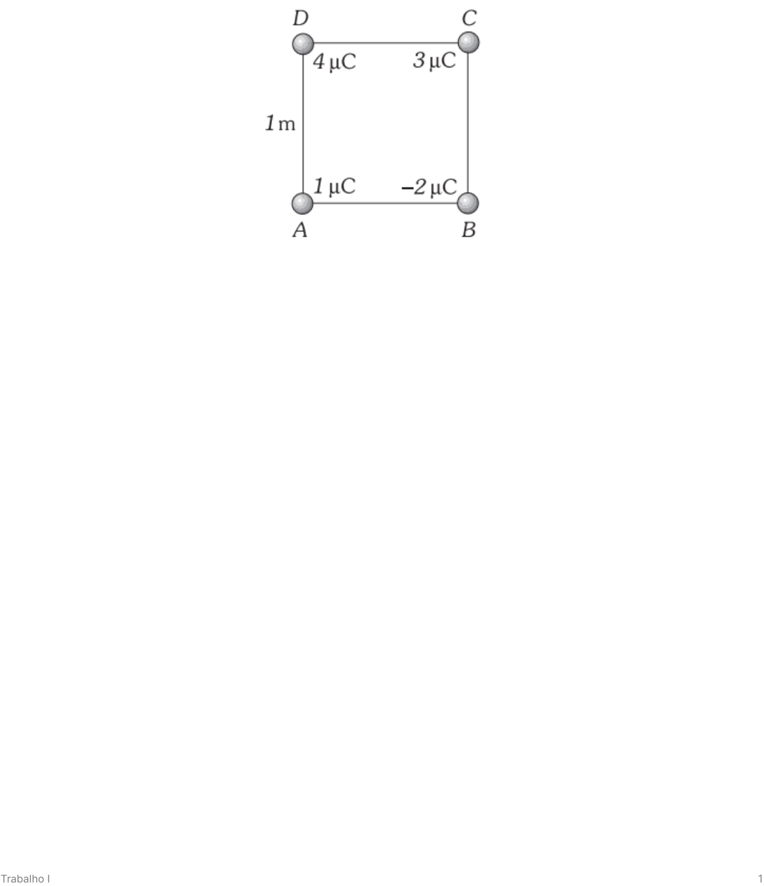 <p>Trabalho I 1</p><p>Trabalho I</p><p>1. O quadrado da figura tem lado de 1 m. Determine a força que</p><p>atua sobre a carga localizada no vértice C.</p><p>2. Uma carga pontual positiva de está localizada na</p><p>origem de um sistema de coordenadas ortogonais. Outra carga</p><p>pontual negativa de está no eixo das ordenadas e</p><p>a 1 m da origem. Determine a intensidade do campo elétrico</p><p>criado por uma distribuição em pontos:</p><p>a) A (2, 0) m</p><p>b) B (1, 3) m</p><p>c) C (1/2, 1/2) m</p><p>d) D (3 , 4)m</p><p>3. Duas esferas de plástico pequenas recebem cargas elétricas</p><p>positivas. Quando estão separadas por uma distância de 15,0</p><p>cm, a força repulsiva entre elas possui módulo igual a</p><p>0,220 N. Qual é a carga de cada esfera (a) se as duas</p><p>cargas fossem iguais e (b) se uma esfera possuísse uma</p><p>carga quatro vezes maior que a outra?</p><p>10 μC−2</p><p>−10 μC−2</p><p>Trabalho I 2</p><p>4. Calcule a intensidade do campo elétrico criado pelo dipolo</p><p>figura elétrica da figura nos pontos:</p><p>a) O (0, 0).</p><p>b) P(x, 0).</p><p>c) S (0, y).</p><p>5. Três cargas puntiformes negativas estão posicionadas ao</p><p>longo de uma linha, como indica a Figura abaixo. Determine</p><p>o módulo, a direção e o sentido do campo elétrico que esse</p><p>conjunto de cargas produz no ponto P, que está a 6,00 cm da</p><p>carga - 2,00 µC, medida perpendicularmente à linha que</p><p>conecta as três cargas.</p><p>Trabalho I 3</p><p>6. Uma carga puntiforme é colocada em cada vértice de um</p><p>quadrado de lado a. Todas as cargas possuem módulo q. Duas</p><p>cargas são positivas e duas são negativas (Figura abaixo).</p><p>Determine a direção e o sentido do campo elétrico</p><p>resultante no centro do quadrado em função das quatro</p><p>cargas, bem como o módulo do campo em função de q e a.</p><p>7. A distância entre duas cargas puntiformes e</p><p>é igual a , formando um dipolo elétrico.</p><p>q =1 −4, 5nC</p><p>q =2 +4, 5nC 3, 1mm</p><p>Trabalho I 4</p><p>(a) Calcule o momento de dipolo elétrico (módulo, direção e</p><p>sentido).</p>