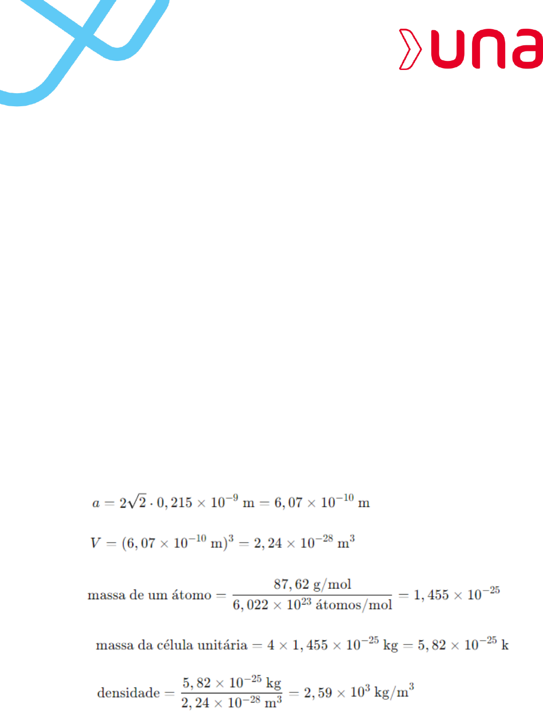 <p>Atividades de fixação</p><p>Comportamento Químico e Mecânico dos Materiais</p><p>Marcos Vinicius Dias Moreira – 62411346</p><p>Professores: Felipe Wallysson Ferreira de Oliveira</p><p>Atividade de fixação Aula 3 – CQMM (Estrutura cristalina dos sólidos)</p><p>1) Qual é a diferença entre estrutura atômica e estrutura cristalina?</p><p>R: O número de prótons e nêutrons não apresenta núcleo de determinação da estrutura atômica.</p><p>não apenas um átomo, mas também o número e as distribuições de probabilidade dos elétrons</p><p>associados. Por outro lado, a "estrutura cristalina" descreve como os átomos estão interessados</p><p>no material cristalino sólido.</p><p>2) Se o raio atômico do chumbo é de 0,175 nm, calcule o volume de sua célula unitária</p><p>em metros cúbicos.</p><p>R: A=22⋅0,175×10−9 m=4,95×10−10 m</p><p>V= (4,95×10−10 m)3=1,21×10−28 m3</p><p>3) O estrôncio (Sr) tem estrutura cristalina CFC, um raio atômico de 0,215 nm, e um</p><p>peso atômico de 87,62 g/mol. Calcule a massa específica teórica para o Sr.</p><p>4) Calcule o raio de um átomo de paládio (Pd), dado que o Pd possui uma estrutura</p><p>cristalina CFC, uma massa específica de 12,0 g/cm3 e um peso atômico de 106,4 g/mol.</p><p>5) O ferro (Fe) passa por uma transformação alotrópica a 912 °C: com o aquecimento,</p><p>passa de uma estrutura CCC (fase α) a uma estrutura CFC (fase γ). Essa</p><p>transformação vem acompanhada de uma mudança no raio atômico do Fe, de RCCC</p><p>= 0,12584 nm para RCFC = 0,12894 nm, e, ainda, de uma alteração na massa</p><p>específica (e no volume). Calcule a variação percentual no volume a qual está</p><p>associada a essa reação. O volume aumenta ou diminui?</p><p>6) O nióbio (Nb) possui um raio atômico de 0,1430 nm e uma massa específica de 8,57</p><p>g/cm3. Determine se ele possui uma estrutura cristalina CFC ou CCC.</p><p>Comparando os valores calculados com o valor fornecido de 8,57 g/cm3, vemos que a</p><p>estrutura CCC fornece um valor de massa específica mais próximo do valor fornecido.</p><p>Portanto, o nióbio provavelmente possui uma estrutura cristalina Compacta de Corpo</p><p>Centrado (CCC).</p><p>7) Um metal hipotético possui a estrutura cristalina cúbica simples. Se seu peso atômico é</p><p>de 74,5 g/mol e o raio atômico vale 0,145 nm, calcule sua massa específica.</p><p>8) O peso atômico, a massa específica e o raio atômico para três ligas hipotéticas estão</p><p>listados na tabela a seguir. Para cada uma delas, determine se a estrutura cristalina é</p><p>CFC, CCC ou cúbica simples e, então, justifique sua determinação.</p><p>Atividade de fixação Aula 4 – CQMM (Cristalografia)</p><p>a) Sistema Cristalino Tetragonal:</p><p>b) Corpo Centrado Tetragonal</p><p>2) Esboce uma célula unitária para a estrutura cristalina ortorrômbica de faces</p><p>centradas.</p><p>3) Quais são os índices para as direções indicadas pelos dois vetores no desenho a seguir?</p><p>a) Sistema Cristalino Tetragonal e Sistema Cristalino Ortorrômbico</p><p>respectivamente</p><p>b) Corpo Centrado Tetragonal e Face Centrada Ortorrômbica respectivamente</p><p>6. A figura abaixo mostra os cinco primeiros picos do difratograma de raios</p><p>X para o tungstênio (W), que tem estrutura cristalina CCC; usou-se</p><p>radiação X monocromática com comprimento de onda de 0,1542 nm.</p><p>(a) Identifique cada um desses picos (isto é, forneça os índices h, k e l).</p><p>Os cinco primeiros picos são (110) (211) (220) (310)</p><p>(b) Determine o espaçamento interplanar para cada um dos picos.</p><p>(c) Para cada pico, determine o raio</p><p>atômico do W, e compare esses valores</p><p>com o valor apresentado na tabela</p><p>presente no slide 35 da Aula 3.</p><p>Atividade de fixação Aula 5 – CQMM (Difusão)</p><p>1) O que é difusão?</p><p>Difusão é um fenômeno crucial de transporte de matéria por movimento atômico.</p><p>2) Diferencie Interdifusão de autodifusão, exemplificando cada um dos processos.</p><p>Autodifusão: é a migração de átomos em metais puros, onde todos os átomos que trocam de</p><p>posição são do mesmo tipo.</p><p>Interdifusão: é a difusão de átomos de um metal em outro metal.</p><p>3) Descreva como funciona e desenhe o processo de difusão intersticial.</p><p>Difusão intersticial: envolve átomos pequenos movendo-se através de posições intersticiais</p><p>(espaços entre os átomos maiores) na estrutura cristalina.</p><p>ANTES DEPOIS</p><p>4) Descreva como funciona e desenhe o processo de difusão por lacunas.</p><p>Difusão por lacunas: ocorre quando átomos se movem de um local na rede cristalina para uma</p><p>vaga adjacente. Este processo é responsável pela autodifusão e pela difusão de átomos de</p><p>impurezas substitucionais.</p><p>5) O que é o efeito Kirkendall e como ele interfere na propriedade de uma liga metálica.</p><p>O efeito Kirkendall é a migração de marcadores posicionados na interface entre uma liga e um</p><p>metal ao serem aquecidos até uma temperatura onde a difusão é possível. Por exemplo, se</p><p>molibdênio for usado como marcador entre cobre e latão (liga de cobre e zinco), os</p><p>marcadores se deslocarão para a região da liga. Isso acontece porque o zinco difunde-se mais</p><p>rapidamente que o cobre, movendo-se para fora da liga devido ao seu gradiente de potencial</p><p>químico. Este fenômeno não ocorre através da troca direta de átomos. Esse processo pode</p><p>melhorar a homogeneização durante a fabricação de uma liga ou gerar vacâncias excessivas,</p><p>tornando a liga mais frágil.</p><p>6) Descreva a razão pela qual a temperatura é um parâmetro extremamente relevante</p><p>no processo de difusão.</p><p>A temperatura é crucial porque acelera o movimento atômico. Quanto mais alta a temperatura</p><p>e mais próxima da temperatura de fusão, maior será a difusão dos átomos na liga. Além 