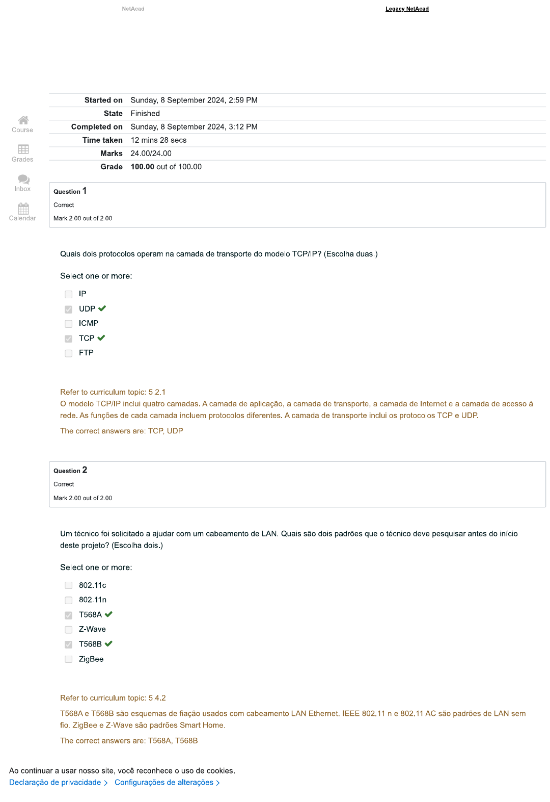 <p>NetAcad Legacy NetAcad Started on Sunday, 8 September 2024, 2:59 PM State Finished Course Completed on Sunday, 8 September 2024, 3:12 PM Time taken 12 mins 28 secs Marks 24.00/24.00 Grades Grade 100.00 out of 100.00 Inbox Question 1 Correct Calendar Mark 2.00 out of 2.00 Quais dois protocolos operam na camada de transporte do modelo TCP/IP? (Escolha duas.) Select one or more: IP UDP ICMP TCP FTP Refer to curriculum topic: 5.2.1 O modelo TCP/IP inclui quatro camadas. A camada de aplicação, a camada de transporte, a camada de Internet e a camada de acesso à rede. As funções de cada camada incluem protocolos diferentes. A camada de transporte inclui os protocolos TCP e UDP. The correct answers are: TCP, UDP Question 2 Correct Mark 2.00 out of 2.00 Um técnico foi solicitado a ajudar com um cabeamento de LAN. Quais são dois padrões que o técnico deve pesquisar antes do início deste projeto? (Escolha dois.) Select one or more: 802.11c 802.11n T568A Z-Wave T568B ZigBee Refer to curriculum topic: 5.4.2 T568A e T568B são esquemas de fiação usados com cabeamento LAN IEEE 802.11 n e 802.11 AC são padrões de LAN sem fio. ZigBee e Z-Wave são padrões Smart Home. The correct answers are: T568B Ao continuar a usar nosso site, você reconhece o uso de cookies. Declaração de privacidade > Configurações de alterações ></p><p>Question 3 Correct Mark 2.00 out of 2.00 Quais os três padrões Wi-Fi que operam no intervalo de frequências de 2,4GHz? (Escolha três.) Select one or more: 802.11b 802.11n 802.11ac 802,11a 802.11g Refer to curriculum topic: 5.2.3 802.11b e 802.11g operam no intervalo de 2,4 GHz e 802.11n pode operar no intervalo de 2,4 GHz ou de 5 GHz. 802.11a e 802.11ac operam apenas no intervalo de frequências de 5 GHz. The correct answers are: 802.11b. 802.11g, 802.11n Question 4 Correct Mark 2.00 out of 2.00 Que serviço de rede atribui automaticamente endereços IP aos dispositivos na rede? Select one: Telnet traceroute DNS DHCP Refer to curriculum topic: 5.2.4 Protocolo DHCP pode ser usado para permitir que os dispositivos finais configurem automaticamente as informações de IP, como seu endereço IP, máscara de sub-rede, servidor DNS e gateway padrão. serviço DNS é usado para proporcionar resolução de nomes de domínio. mapeando nomes de host para endereços IP. Telnet é um método para acessar uma sessão de CLI remotamente de um switch ou roteador. Traceroute é um comando usado para determinar o caminho de um pacote, quando ele atravessa a rede. The correct answer is: DHCP Ao continuar a usar nosso site, você reconhece o uso de cookies. Declaração de privacidade > Configurações de alterações ></p><p>Question 5 Correct Mark 2.00 out of 2.00 Qual tecnologia usa a fiação elétrica existente para conectar dispositivos a uma rede? Select one: Z-Wave 802.11 Ethernet sobre alimentação IPS Refer to curriculum topic: 5.3.3 Ethernet over Power, ou Powerline Networking, usa um dispositivo que se conecta a uma tomada de energia e a um cabo para conectar um dispositivo a uma rede. IEEE 802,11 é um padrão para redes sem fio. Um IPS (sistema de prevenção de intrusão) é um dispositivo de segurança que monitora todo o tráfego de entrada e saída. Z-Wave é um tipo de rede usado em uma casa inteligente. The correct answer is: Ethernet sobre alimentação Question 6 Correct Mark 2.00 out of 2.00 Que tecnologia de segurança é usada para monitorar passivamente o tráfego de rede com o objetivo de detectar um possível ataque? Select one: servidor proxy IPS IDS firewall Refer to curriculum topic: 5.3.2 Um sistema IDS é implementado para monitorar passivamente o tráfego em uma rede. Um IPS e um firewall monitoram ativamente o tráfego de rede e tomam medidas imediatas quando há correspondência com os critérios anteriormente definidos de segurança. Um servidor proxy, quando funciona como um firewall, também monitora ativamente o tráfego que caminha por ele e toma medidas imediatas. The correct answer is: IDS Ao continuar a usar nosso site, você reconhece o uso de cookies. Declaração de privacidade > Configurações de alterações ></p><p>Question 7 Correct Mark 2.00 out of 2.00 Um técnico capturou pacotes em uma rede que está com lentidão ao acessar a Internet. Qual número de porta o técnico deve procurar no material capturado para localizar os pacotes HTTP? Select one: 53 21 20 80 110 Refer to curriculum topic: 5.2.2 HTTP usa a porta TCP 80 e o HTTPS usa a porta TCP 443. HTTP e HTTPS são protocolos comumente usados para acessar páginas da Web. The correct answer is: 80 Question 8 Correct Mark 2.00 out of 2.00 Quais são as duas mídias comuns usadas nas redes? (Escolha dois.) Select one or more: fibra nylon madeira água cobre Refer to curriculum topic: 7.1.1 As mídias comuns usadas em redes incluem cobre, fibra ótica ou plástico óptica e sem fio. The correct answers are: cobre, fibra Ao continuar a usar nosso site, você reconhece o uso de cookies. Declaração de privacidade > Configurações de alterações ></p><p>Question 9 Correct Mark 2.00 out of 2.00 Qual dispositivo de rede regenera o sinal de dados sem segmentar a rede? Select one: modem roteador hub switch Refer to curriculum topic: 5.3.1 Hubs são chamados repetidores, pois regenerar o sinal. Todos os dispositivos conectados ao hub compartilham a mesma largura de banda (ao contrário de um que dá a cada dispositivo largura de banda dedicada). The correct answer is: hub Question 10 Correct Mark 2.00 out of 2.00 Que tipo de rede se estende por uma curta distância e conecta impressoras, mouses e teclados a um host individual? Select one: PAN WLAN LAN MAN Refer to curriculum topic: 5.1.1 Uma PAN (Personal Area Network, Rede de área pessoal) conecta dispositivos, como mouses, impressoras, smartphones e tablets. Esses dispositivos são, geralmente, conectados com a tecnologia Bluetooth. Bluetooth permite que os dispositivos se comuniquem em distâncias curtas. The correct ans