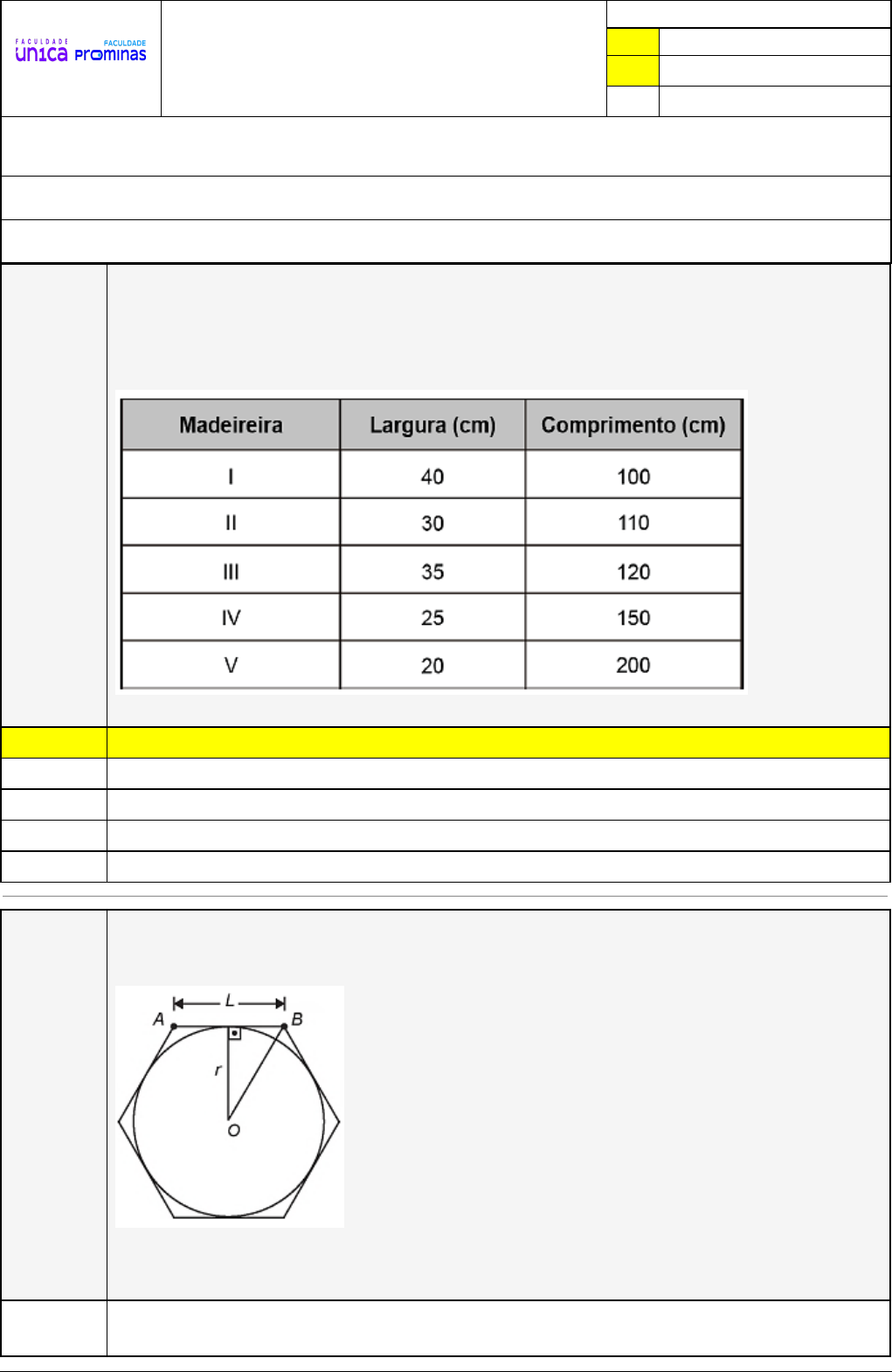 <p>Pincel Atômico - 08/09/2024 16:38:50 1/4</p><p>WATSON LIMA SILVA</p><p>Exercício Caminho do Conhecimento - Etapa 8 (21440)</p><p>Atividade finalizada em 08/09/2024 15:44:23 (2660657 / 1)</p><p>LEGENDA</p><p>Resposta correta na questão</p><p># Resposta correta - Questão Anulada</p><p>X Resposta selecionada pelo Aluno</p><p>Disciplina:</p><p>GEOMETRIA: FUNDAMENTOS E MÉTODOS DE ENSINO E PRÁTICAS PEDAGÓGICAS [1083645] - Avaliação com 8 questões, com o peso total de</p><p>1,67 pontos [capítulos - 4]</p><p>Turma:</p><p>Segunda Graduação: Segunda Graduação 6 meses - Licenciatura em Matemática - Grupo: FPD-MARC/2024 - SGegu0A280324 [120368]</p><p>Aluno(a):</p><p>91596722 - WATSON LIMA SILVA - Respondeu 4 questões corretas, obtendo um total de 0,83 pontos como nota</p><p>[359904_152500]</p><p>Questão</p><p>001</p><p>(INEP/2021/Enem) Um marceneiro visitou 5 madeireiras para comprar tábuas que</p><p>lhe permitissem construir 5 prateleiras de formato retangular, de dimensões iguais a</p><p>30 cm de largura por 120 cm de comprimento cada, tendo como objetivo minimizar a</p><p>sobra de madeira, podendo, para isso, fazer qualquer tipo de emenda. As dimensões</p><p>das tábuas encontradas nas madeireiras estão descritas no quadro.</p><p>Em qual madeireira o marceneiro deve comprar as tábuas para atingir seu objetivo?</p><p>IV.</p><p>III.</p><p>I.</p><p>X II.</p><p>V.</p><p>[359905_152498]</p><p>Questão</p><p>002</p><p>(INEP/2018/Enem – adaptada) Um brinquedo chamado pula-pula, quando visto de</p><p>cima, consiste de uma cama elástica com contorno em formato de um hexágono</p><p>regular.</p><p>Se a área do círculo inscrito no hexágono é 3π metros quadrados, então a área do</p><p>hexágono, em metro quadrado, é</p><p>9√2.</p><p>Pincel Atômico - 08/09/2024 16:38:50 2/4</p><p>6√3.</p><p>X 12√3.</p><p>9.</p><p>12.</p><p>[359903_152497]</p><p>Questão</p><p>003</p><p>Em Geometria, afirma-se que duas figuras são semelhantes quando elas guardam</p><p>entre si uma proporção, isto é, uma correspondência entre os lados homólogos</p><p>(correspondentes) de forma que a razão entre a medida desses segmentos é</p><p>sempre a mesma. Além disso, os ângulos de uma figura são correspondentes e</p><p>congruentes, de maneira biunívoca, aos ângulos da outra.</p><p>Assim, são feitas as seguintes afirmativas. Avalie-as e registre V para as que forem</p><p>verdadeiras e F para as que forem falsas.</p><p>( ) A razão de semelhança é um número que guarda a proporção entre duas figuras</p><p>semelhantes e é fixa (constante), independentemente dos lados homólogos que são</p><p>considerados.</p><p>( ) Dois polígonos regulares com o mesmo número de lados são sempre</p><p>semelhantes entre si.</p><p>( ) Para que dois polígonos sejam semelhantes, eles precisam ter o mesmo número</p><p>de lados, ângulos internos, respectivamente, congruentes e os lados homólogos</p><p>proporcionais.</p><p>Logo, após avaliar as afirmativas, conclui-se que a sequência de V e F que pode ser</p><p>registrada de forma adequada é</p><p>F – F – F.</p><p>V – F – F.</p><p>X V – F – V.</p><p>F – V – F.</p><p>V – V – V.</p><p>[359903_152503]</p><p>Questão</p><p>004</p><p>(INEP/2018/Enem) Isometria é uma transformação geométrica que, aplicada a uma</p><p>figura, mantém as distâncias entre pontos. Duas das transformações isométricas são</p><p>a reflexão e a rotação. A reflexão ocorre por meio de uma reta chamada eixo. Esse</p><p>eixo funciona como um espelho, a imagem refletida é o resultado da transformação.</p><p>A rotação é o “giro" de uma figura ao redor de um ponto chamado centro de rotação.</p><p>A figura sofreu cinco transformações isométricas, nessa ordem:</p><p>Qual a posição final da figura?</p><p>Pincel Atômico - 08/09/2024 16:38:50 3/4</p><p>X</p><p>[359903_152912]</p><p>Questão</p><p>005</p><p>(Instituto AOCP/2016/Técnico de Eletrônica - adaptada) Uma pessoa de 1,5 metros</p><p>de altura projeta uma sombra de 1,8 metros. Sabendo que, no mesmo instante, um</p><p>prédio projeta uma sombra de 12 metros, proporcional à primeira, conclui-se que a</p><p>altura do prédio é:</p><p>12 metros.</p><p>15 metros.</p><p>X 10 metros.</p><p>8 metros.</p><p>12 metros.</p><p>[359903_152916]</p><p>Questão</p><p>006</p><p>(GUALIMP/2020/Prefeitura de Quissamã/RJ/Auxiliar - adaptada) Renata precisava</p><p>medir a altura de uma árvore. Para isso, colocou um pedaço de cano enterrado no</p><p>chão, formando um ângulo de 90º com o solo, como na figura a seguir. Depois,</p><p>mediu o comprimento das sombras da árvore e do cano, obtendo as medidas</p><p>indicadas na figura abaixo.</p><p>Qual é a medida aproximada da altura dessa árvore?</p><p>5,1 m.</p><p>X 8,4 m.</p><p>7,9 m.</p><p>9,2 m.</p><p>6,8 m.</p><p>Pincel Atômico - 08/09/2024 16:38:50 4/4</p><p>[359903_152919]</p><p>Questão</p><p>007</p><p>(FURB/2019/Câmara de Timbó/SC/Técnico de Informática - adaptada) Considere a</p><p>seguinte sequência de figuras que representam polígonos regulares e analise o</p><p>padrão de construção:</p><p>Seguindo o padrão de construção dessas figuras, pode-se afirmar que o número de</p><p>lados da Figura 10 será:</p><p>X 21.</p><p>10.</p><p>15.</p><p>17.</p><p>19.</p><p>[359903_152917]</p><p>Questão</p><p>008</p><p>(Instituto Excelência/2019/Prefeitura de Rio Novo/MG/Técnico) Um hexágono regular</p><p>inscrito numa circunferência (figura abaixo) possui 18 cm de diâmetro. Portanto, qual</p><p>é o seu perímetro, em cm?</p><p>96 cm.</p><p>42 cm.</p><p>48 cm.</p><p>36 cm.</p><p>X 54 cm.</p>