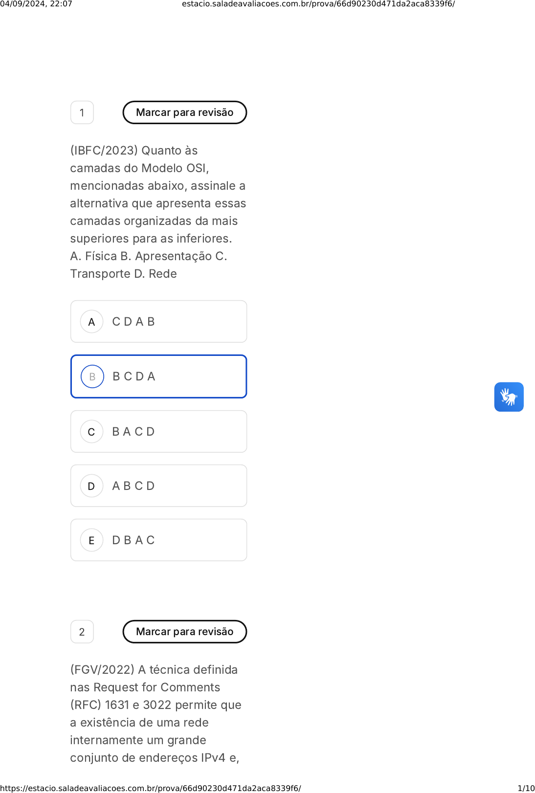 <p>A</p><p>B</p><p>C</p><p>D</p><p>E</p><p>1 Marcar para revisão</p><p>�IBFC/2023� Quanto às</p><p>camadas do Modelo OSI,</p><p>mencionadas abaixo, assinale a</p><p>alternativa que apresenta essas</p><p>camadas organizadas da mais</p><p>superiores para as inferiores.</p><p>A. Física B. Apresentação C.</p><p>Transporte D. Rede</p><p>C D A B</p><p>B C D A</p><p>B A C D</p><p>A B C D</p><p>D B A C</p><p>2 Marcar para revisão</p><p>�FGV/2022� A técnica definida</p><p>nas Request for Comments</p><p>�RFC� 1631 e 3022 permite que</p><p>a existência de uma rede</p><p>internamente um grande</p><p>conjunto de endereços IPv4 e,</p><p>04/09/2024, 22:07 estacio.saladeavaliacoes.com.br/prova/66d90230d471da2aca8339f6/</p><p>https://estacio.saladeavaliacoes.com.br/prova/66d90230d471da2aca8339f6/ 1/10</p><p>A</p><p>B</p><p>C</p><p>D</p><p>E</p><p>externamente, um endereço ou</p><p>então um pequeno conjunto de</p><p>endereços se chama</p><p>IPV6</p><p>intranet</p><p>ipconfig</p><p>NAT</p><p>Ifconfig</p><p>3 Marcar para revisão</p><p>A camada de rede de uma rede</p><p>de computadores pode</p><p>oferecer os serviços de</p><p>circuitos virtuais ou de</p><p>datagramas. O tipo de serviço</p><p>oferecido influencia</p><p>diretamente na forma como os</p><p>pacotes serão transportados</p><p>entre origem e destino.</p><p>Abaixo são realizadas</p><p>comparações entre circuitos</p><p>virtuais e datagramas:</p><p>I � Nas redes de circuitos</p><p>virtuais é estabelecido um</p><p>caminho a ser seguido por</p><p>todos os pacotes de uma</p><p>conexão, enquanto nas redes</p><p>de datagrama não existe o</p><p>conceito de conexão.</p><p>04/09/2024, 22:07 estacio.saladeavaliacoes.com.br/prova/66d90230d471da2aca8339f6/</p><p>https://estacio.saladeavaliacoes.com.br/prova/66d90230d471da2aca8339f6/ 2/10</p><p>A</p><p>B</p><p>C</p><p>D</p><p>E</p><p>II � Em uma rede de circuitos</p><p>virtuais os roteadores precisam</p><p>armazenar as informações de</p><p>todas as conexões que passam</p><p>por ele, enquanto nas redes de</p><p>datagrama basta saber como</p><p>chegar a cada destino.</p><p>III � Como necessitam conhecer</p><p>o caminho, somente as redes</p><p>de circuito virtual precisam</p><p>executar algoritmos de</p><p>roteamento. Redes de</p><p>datagramas não possuem esta</p><p>necessidade.</p><p>Com base nas comparações</p><p>acima, é correto o que se</p><p>afirma em:</p><p>Todas as afirmações</p><p>estão corretas.</p><p>I somente.</p><p>I e II somente.</p><p>II e III somente.</p><p>I e III somente.</p><p>4 Marcar para revisão</p><p>As técnicas de acesso ao meio</p><p>são métodos utilizados para</p><p>controlar o acesso a um canal</p><p>de comunicação</p><p>04/09/2024, 22:07 estacio.saladeavaliacoes.com.br/prova/66d90230d471da2aca8339f6/</p><p>https://estacio.saladeavaliacoes.com.br/prova/66d90230d471da2aca8339f6/ 3/10</p><p>A</p><p>B</p><p>C</p><p>D</p><p>E</p><p>compartilhado, como uma rede</p><p>sem fio ou uma rede de cabo.</p><p>O objetivo é garantir que vários</p><p>dispositivos possam transmitir</p><p>e receber dados ao mesmo</p><p>tempo, sem que haja</p><p>interferência ou colisão de</p><p>dados. Em relação às técnicas</p><p>de acesso ao meio, marque a</p><p>alternativa correta.</p><p>O TDMA é baseado</p><p>em slots de tempo.</p><p>O token ring emprega</p><p>um roteador para</p><p>tratar colisões.</p><p>No CSMA os</p><p>dispositivos ignoram o</p><p>canal antes de</p><p>transmitir os dados</p><p>assim, evitam</p><p>colisões.</p><p>São essenciais em</p><p>enlaces ponto-a-</p><p>ponto.</p><p>O desempenho do S�</p><p>ALOHA era inferior</p><p>ao desempenho do</p><p>ALOHA.</p><p>5 Marcar para revisão</p><p>04/09/2024, 22:07 estacio.saladeavaliacoes.com.br/prova/66d90230d471da2aca8339f6/</p><p>https://estacio.saladeavaliacoes.com.br/prova/66d90230d471da2aca8339f6/ 4/10</p><p>A</p><p>B</p><p>C</p><p>D</p><p>E</p><p>Há uma variedade de erros que</p><p>podem ocorrer ao enviar</p><p>mensagens em redes de</p><p>computadores. Para minimizar</p><p>esses erros, as redes de</p><p>computadores geralmente</p><p>implementam técnicas de</p><p>detecção e correção de erros,</p><p>como a adição de informações</p><p>de verificação de redundância</p><p>cíclica �CRC) aos pacotes e o</p><p>reenvio de pacotes perdidos.</p><p>Nesse sentido, as colisões em</p><p>redes de computadores</p><p>ocorrem apenas</p><p>quando o meio físico</p><p>é o par trançado.</p><p>requerem o uso de</p><p>token para o</p><p>tratamento.</p><p>são previstas nos</p><p>protocolos baseados</p><p>em contenção.</p><p>são benéficas em</p><p>situações de baixa</p><p>disputa do enlace.</p><p>não afetam o</p><p>desempenho dos</p><p>protocolos.</p><p>04/09/2024, 22:07 estacio.saladeavaliacoes.com.br/prova/66d90230d471da2aca8339f6/</p><p>https://estacio.saladeavaliacoes.com.br/prova/66d90230d471da2aca8339f6/ 5/10</p><p>A</p><p>B</p><p>C</p><p>D</p><p>E</p><p>6 Marcar para revisão</p><p>Com relação à transmissão de</p><p>sinais em um meio físico, é</p><p>correto afirmar que</p><p>Todas as alternativas</p><p>estão incorretas.</p><p>A banda passante do</p><p>canal distorce o sinal</p><p>e pode provocar erros</p><p>na recepção.</p><p>A potência do sinal</p><p>transmitido é sempre</p><p>menor do que a do</p><p>sinal recebido.</p><p>A atenuação do sinal</p><p>só ocorre em meios</p><p>não guiados.</p><p>Quanto maior a banda</p><p>passante do canal,</p><p>menor a taxa de</p><p>transmissão que pode</p><p>ser alcançada.</p><p>7 Marcar para revisão</p><p>A criptografia é um recurso utilizado</p><p>desde tempos antigos, e a Cifra de</p><p>César é um dos algoritmos mais</p><p>conhecidos. Acerca das técnicas de</p><p>00</p><p>hora</p><p>: 40</p><p>min</p><p>: 30</p><p>seg</p><p>Ocultar</p><p>Questão 10 de 10</p><p>Respondidas �10� Em branco �0�</p><p>Finalizar prova</p><p>1 2 3 4 5</p><p>6 7 8 9 10</p><p>SM2 Fundamentos De Redes De Computadores</p><p>04/09/2024, 22:07 
