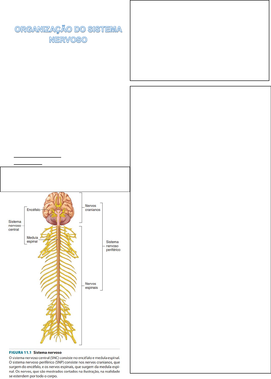 <p>2°P. APG S1P1 – Sistema Nervoso</p><p>Aluna: Amanda Martins Costa</p><p>Tema: Potencial de ação do sistema nervoso</p><p>O sistema nervoso é o principal sistema de</p><p>controle e comunicação do corpo. Cada</p><p>pensamento, ação, instinto e emoção refletem</p><p>a sua atividade. Suas células comunicam-se</p><p>por meio de sinais elétricos, que são rápidos e</p><p>específicos e, normalmente, produzem</p><p>respostas quase imediatas.</p><p> Objetivo SN: manter as condições</p><p>controladas dentro de limites que mantêm a</p><p>vida. (endócrino);</p><p> Função SN: regular as atividades do corpo</p><p>por meio de respostas rápidas utilizando</p><p>impulsos nervosos;</p><p> Ligação do SN com o SE: Através dos</p><p>impulsos nervosos do SN o SE libera</p><p>hormônios.</p><p>O SN é organizado em duas partes anatômicas:</p><p>1. sistema nervoso central (SNC);</p><p>2. sistema nervoso periférico (SNP).</p><p>SNC = consiste no encéfalo e na medula espinal.</p><p> Encéfalo = localizado dentro do crânio;</p><p> Medula espinal= localizada dentro do canal</p><p>vertebral formado pelas vértebras.</p><p>O encéfalo está conectado a medula espinal pelo</p><p>forame magno do osso occipital.</p><p>Função: Processar diferentes tipos de informação</p><p>sensitivas, fonte de pensamentos, emoções e</p><p>memórias. E estimular a contração dos músculos e</p><p>a liberação da secreção de glândulas.</p><p>SNP = consiste em todos os tecidos nervosos fora</p><p>do SNC, incluindo receptores sensoriais, nervos,</p><p>gânglios e plexos.</p><p> Receptores sensoriais: são as terminações</p><p>nervosas dos neurônios, ou separadas, células</p><p>especializadas que detectam temperatura, dor,</p><p>tato, pressão, luz, som, odor e outros estímulos.</p><p>Localizados na pele, músculos, articulações,</p><p>órgãos internos e órgãos sensoriais</p><p>especializados, como os olhos e as orelhas</p><p> Nervo: é um feixe de fibras nervosas, chamadas</p><p>axônios, e suas bainhas; conecta o SNC a</p><p>receptores sensoriais, músculos e glândulas.</p><p> Gânglio: é uma coleção de corpos celulares de</p><p>neurônios localizados fora do SNC. que são áreas</p><p>onde os corpos celulares dos neurônios ficam agrupados.</p><p> Plexo: é uma extensa rede de axônios e, em</p><p>alguns casos, corpos celulares de neurônios,</p><p>localizados fora do SNC.</p><p> O SNP está organizado em divisões:</p><p>1. Sensitiva (Sensorial), ou aferente, recebe</p><p>informações (“entrada”), ou seja, transmite</p><p>sinais elétricos (estímulos), chamados potenciais</p><p>de ação, dos receptores sensitivos para o SNC.</p><p>Fornecendo ao SNC informações sensitivas sobre:</p><p>os sentidos somáticos (sensações táteis, térmicas,</p><p>dolorosas e proprioceptivas) e sentidos especiais</p><p>(olfato, paladar, visão, audição e equilíbrio).</p><p>2. Motora ou eferente (“saída”) do SNP transmite</p><p>potenciais de ação (respostas) do SNC para os</p><p>efetores (músculos e glândulas)</p><p> Ou seja, a divisão sensorial do SNP detecta</p><p>estímulo e transmite informação na forma de</p><p>potenciais de ação para o SNC. O SNC receber</p><p>informações, processar e armazenar informações e</p><p>gerar respostas. A divisão motora do SNP conduz</p><p>potenciais de ação do SNC para músculos e</p><p>glândulas.</p><p>A divisão motora é dividida em duas subdivisões:</p><p>1. Sistema nervoso somático (SNS): transmite a</p><p>resposta do SNC apenas para os músculos</p><p>esqueléticos; com respostas motoras controladas</p><p>de forma consciente, a ação dessa parte do SNP é</p><p>voluntária.</p><p>2. Sistema nervoso autônomo (SNA): transmite a</p><p>resposta do SNC para: músculo liso, músculo</p><p>cardíaco e glândulas; nesses casos, como as</p><p>respostas motoras normalmente não estão sob</p><p>controle consciente, a ação do SNA é involuntária.</p><p> SNA é composto de duas partes:</p><p>1. a divisão simpática: é mais ativa durante</p><p>atividade física, ações de emergência - as</p><p>chamadas respostas de " luta ou fuga".</p><p>2. a divisão parassimpática: regula funções em</p><p>repouso, como digestão de alimentos ou</p><p>esvaziamento da bexiga urinária.</p><p>Os efetores recebem inervação de ambas as</p><p>partes e, geralmente, as duas divisões têm ações</p><p>opostas. Por exemplo, os neurônios da parte</p><p>simpática aumentam a frequência cardíaca, e os</p><p>neurônios da divisão parassimpática a diminuem.</p><p> Plexos entéricos são uma terceira parte do</p><p>SNA, que ajudam a regular a atividade do</p><p>músculo liso e das glândulas do sistema</p><p>digestório.</p><p>Sistema nervoso entérico (SNE): consiste em plexos</p><p>dentro da parede do trato digestório. Uma</p><p>característica única dos neurônios entéricos é que</p><p>eles monitoram e controlam o trato digestório</p><p>independentemente do SNC por meio de reflexos</p><p>locais. Entretanto, o SNC pode substituir funções</p><p>entéricas via ações parassimpáticas e simpáticas.</p><p>Por isso, o SNE é uma subdivisão independente do</p><p>SNP que é integrado com o SNA.</p><p>O SN é composto por 2 tipos de células: os</p><p>neurônios e as células de suporte (neuróglia).</p><p>Os neurônios recebem estímulos, conduzem</p><p>potencial de ação e transmitem sinais para</p><p>outros neurônios e órgãos efetores. Fornecendo</p><p>a maioria das funções exclusivas do SN, como</p><p>sentir, pensar, lembrar, controlar a atividade</p><p>muscular e regular as secreções glandulares.</p><p>A neuróglia ou células gliares, auxiliam, apoiam,</p><p>nutrem e protegem os neurônios, além de</p><p>executar outras funções. São menores e mais</p><p>numerosas do que o neurônios, ou seja, tem</p><p>mais neuróglia do que neurônios em várias</p><p>partes do encéfalo. (de 10 a 50 vezes mais)</p><p> Três funções básica