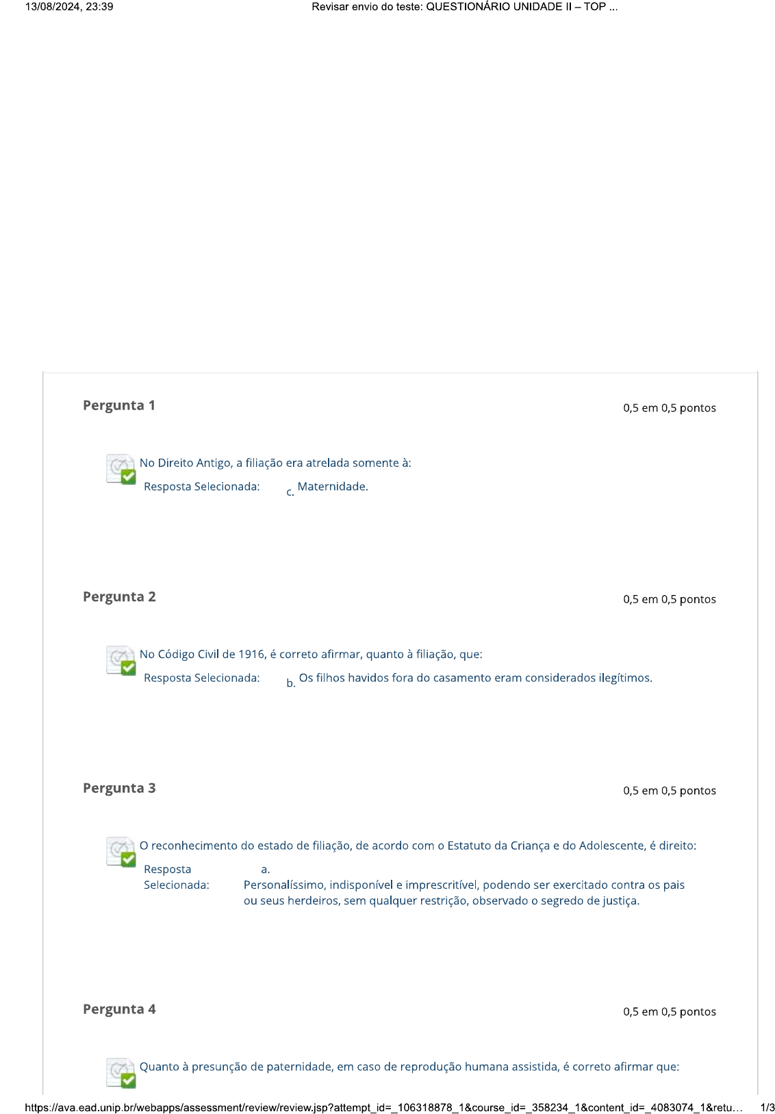 <p>13/08/2024, 23:39 Revisar envio do teste: QUESTIONÁRIO UNIDADE - TOP Pergunta 1 0,5 em 0,5 pontos No Direito Antigo, a filiação era atrelada somente à: Resposta Selecionada: C. Maternidade. Pergunta 2 0,5 em 0,5 pontos No Código Civil de 1916, é correto afirmar, quanto à filiação, que: Resposta Selecionada: b. Os filhos havidos fora do casamento eram considerados ilegítimos. Pergunta 3 0,5 em 0,5 pontos reconhecimento do estado de filiação, de acordo com o Estatuto da Criança e do Adolescente, é direito: Resposta a. Selecionada: Personalíssimo, indisponível e imprescritível, podendo ser exercitado contra os pais ou seus herdeiros, sem qualquer restrição, observado o segredo de justiça. Pergunta 4 0,5 em 0,5 pontos Quanto à presunção de paternidade, em caso de reprodução humana assistida, é correto afirmar que: 1/3</p><p>13/08/2024, 23:39 Revisar envio do teste: QUESTIONÁRIO UNIDADE - TOP Resposta Selecionada: Ocorre na fecundação homóloga, mesmo que falecido o marido. e. Pergunta 5 0,5 em 0,5 pontos Assinale a alternativa correta quanto à filiação. Resposta e. Selecionada: Ao lado da filiação biológica e jurídica temos a relação paterno-filial decorrente do vínculo de afeto, a filiação social. Pergunta 6 0,5 em 0,5 pontos Quanto aos alimentos, assinale a alternativa correta. Resposta Selecionada: São de interesse público. C. Pergunta 7 0,5 em 0,5 pontos Quanto às espécies de alimentos, assinale a alternativa incorreta. Resposta d. Selecionada: Indenizatórios possuem como causa o parentesco, a união estável ou o casamento. Pergunta 8 0,5 em 0,5 pontos Por força de lei, os alimentos são devidos entre: Resposta Selecionada: Ascendentes, descendentes, irmãos, ex-cônjuges e ex-conviventes. e. Pergunta 9 0,5 em 0,5 pontos Assinale a alternativa que não trata de uma das características da obrigação alimentar: 2/3</p><p>13/08/2024, 23:39 Revisar envio do teste: QUESTIONÁRIO UNIDADE - TOP Resposta Selecionada: Imutabilidade. e. Pergunta 10 0,5 em 0,5 pontos Quanto ao direito aos alimentos, não se pode afirmar que se trata de direito: Resposta Selecionada: Compensável. C. OK Terça-feira, 13 de Agosto de 2024 23h38min57s BRT 3/3</p>