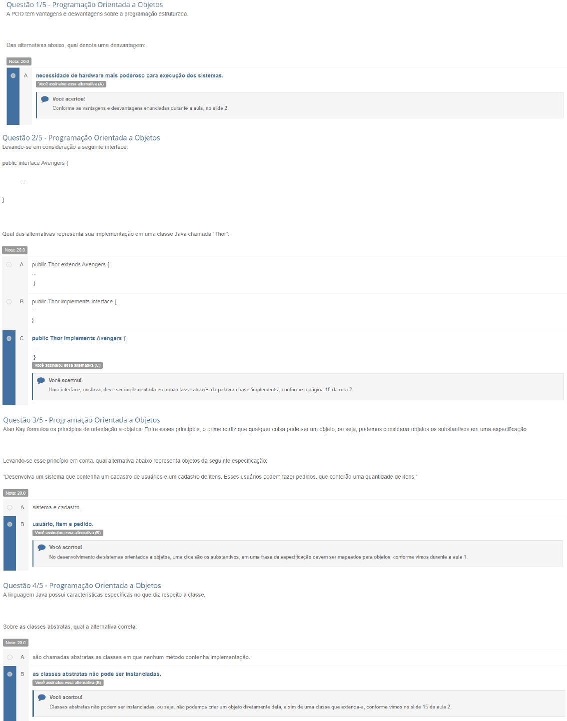 <p>Questão 1/5 - Programação Orientada a Objetos A POO tem vantagens e desvantagens sobre a programação estruturada. Das alternativas qual denota uma A necessidade de hardware mais poderoso para execução dos sistemas. Você assinalou essa alternativa (A) Você acertou! Conforme as vantagens e desvantagens enunciadas durante a no slide Questão 2/5 Programação Orientada a Objetos Levando-se em consideração a seguinte interface: public interface Avengers { } Qual das alternativas representa sua implementação em uma classe Java chamada "Thor": Nota A public Thor extends Avengers { } B public Thor implements interface { } C public Thor implements Avengers { } Você assinalou essa alternativa (C Você acertou! Uma interface. no deve ser implementada em uma classe através da palavra chave conforme a página 10 da rota 2. Questão 3/5 Programação Orientada a Objetos Alan Kay formulou os princípios de orientação a Entre esses princípios, primeiro diz que qualquer coisa pode ser um objeto, ou seja, podemos considerar objetos os substantivos em uma Levando-se esse princípio em conta, qual alternativa abaixo representa objetos da seguinte especificação: "Desenvolva um sistema que contenha um cadastro de usuários e um cadastro de Esses usuários podem fazer pedidos, que conterão uma quantidade de Nota: A sistema cadastro. B usuário. item e pedido. Você assinalou essa alternativa (B Você acertou! No desenvolvimento de sistemas orientados a objetos, uma dica são os em uma frase da especificação devem ser mapeados para objetos, conforme vimos durante a aula 1. Questão 4/5 - Programação Orientada a Objetos A linguagem Java possui características específicas no que diz respeito a Sobre as classes qual a alternativa correta: Nota: 20.0 A são chamadas abstratas as classes em que nenhum método contenha implementação. B as classes abstratas não pode ser instanciadas. Você assinalou essa alternativa (B Você acertou! Classes abstratas não podem ser instanciadas, ou seja, não podemos criar um objeto diretamente e sim de uma classe que conforme vimos no slide 15 da aula 2</p><p>Questão 5/5 Programação Orientada a Objetos Java é uma linguagem orientada a objetos. Para criarmos um objeto chamado "exemplo", pertencente à classe "Exemplo", qual das alternativas abaixo está correta: Nota: 20.0 A class Exemplo = new B Exemplo exemplo = new Exemplo(); Você assinalou essa alternativa (B) Você acertou! Para criarmos objetos, no Java, devemos sempre utilizar operador 'new', conforme vimos durante a parte prática 1 de nossa aula.</p>
