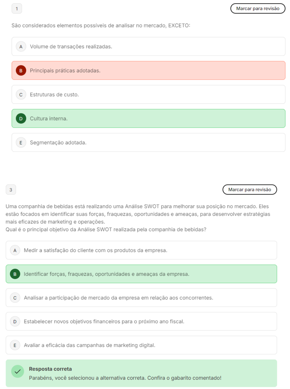 <p>1 Marcar para revisão São considerados elementos possíveis de analisar no mercado, EXCETO: A Volume de transações realizadas. B Principais práticas adotadas. C Estruturas de custo. D Cultura interna. E Segmentação adotada. 3 Marcar para revisão Uma companhia de bebidas está realizando uma Análise SWOT para melhorar sua posição no mercado. Eles estão focados em identificar suas forças, fraquezas, oportunidades e ameaças, para desenvolver estratégias mais eficazes de marketing e operações. Qual é o principal objetivo da Análise SWOT realizada pela companhia de bebidas? A Medir a satisfação do cliente com os produtos da empresa. B Identificar forças, fraquezas, oportunidades e ameaças da empresa. C Analisar a participação de mercado da empresa em relação aos concorrentes. D Estabelecer novos objetivos financeiros para próximo ano fiscal. E Avaliar a eficácia das campanhas de marketing digital Resposta correta Parabéns, você selecionou a alternativa correta. Confira o gabarito comentado!</p><p>2 Marcar para revisão Existem algumas fases de suma importância para que empreendedores e profissionais de marketing consigam prospectar possíveis cenários no ambiente de negócios, são eles: I. Análise estrutural do sistema e do ambiente. II. Geração de cenários alternativos. III. Alteração no ambiente externo. É correto que se afirma em: A I, apenas. B II, apenas. C III, apenas. D II e III, apenas. E e II, apenas. Resposta correta Parabéns, você selecionou a alternativa correta. Confira o gabarito comentado!</p><p>4 Marcar para revisão Sabe-se que acesso à informação é essencial para marketing. No entanto, é comum que as empresas coletem informações desnecessárias ou insuficientes, que é um erro. Considerando macroambiente no qual uma organização está envolvida, NÃO está relacionada a ele a força: A Econômica. B Tecnológica. C Sociocultural. D Nenhuma das alternativas. E Produtiva. 5 Marcar para revisão Uma empresa de cosméticos está explorando novas estratégias de marketing para melhorar sua posição no mercado. Eles estão considerando fatores como a crescente preocupação dos consumidores com a sustentabilidade e uso de ingredientes naturais em produtos de beleza. Com base no foco da empresa, qual aspecto do macroambiente está sendo mais enfatizado em suas estratégias de marketing? A Tendências tecnológicas na produção de cosméticos. B Mudanças legais e regulamentações do setor de cosméticos. C Concorrência e análise da posição de mercado. D Preocupações socioculturais com sustentabilidade e ingredientes naturais. E Variações econômicas e seu impacto no poder de compra.</p><p>6 Marcar para revisão Uma empresa de tecnologia está analisando seu macroambiente para identificar oportunidades e ameaças. Eles utilizam a Análise PEST para avaliar os fatores políticos, econômicos, sociais e tecnológicos que podem influenciar suas operações e estratégias de mercado. Qual das seguintes opções melhor descreve foco da Análise PEST utilizada pela empresa? A Avaliação de forças internas e fraquezas organizacionais. B Análise de tendências de consumo e comportamento do consumidor. C Estudo dos fatores políticos, econômicos, sociais e tecnológicos do macroambiente. D Identificação de competidores diretos e indiretos no mercado. E Avaliação de recursos financeiros e capacidades operacionais da empresa. 7 Marcar para revisão Uma rede de restaurantes está avaliando os efeitos das recentes mudanças econômicas no poder de compra dos consumidores. Essa análise ajudará a ajustar seus preços e menus de acordo com as necessidades e capacidades financeiras de seus clientes, garantindo competitividade e relevância no mercado. Qual é o principal objetivo dessa análise econômica realizada pela rede de restaurantes? A Implementar novas tecnologias para aprimorar a experiência do cliente. B Avaliar impacto das mudanças políticas no setor de alimentos. C Expansão para novos mercados internacionais. D Desenvolver uma nova campanha de marketing baseada em tendências de consumo. E Ajustar preços e menus de acordo com o poder de compra do consumidor. Resposta incorreta Opa! A alternativa correta é a letra E. Confira o gabarito comentado!</p><p>8 Marcar para revisão Mapear potenciais é um dos grandes diferenciais usado pela inteligência competitiva. Nesse sentido, assinale a alternativa INCORRETA sobre um processo sistemático de mapeamento para tomada de decisão. A Coleta e busca ética de dados. B Disseminação das informações para uso interno. C Análise, de forma filtrada e integrada, dos dados. D Busca por sistemas simples de banco de dados. E Descobrir as forças que regem os negócios. X Resposta incorreta Opa! A alternativa correta é a letra D. Confira o gabarito comentado!</p><p>9 Marcar para revisão Um fabricante de roupas está investigando comportamento do consumidor para ajustar suas estratégias de marketing. Eles estão particularmente interessados em como as tendências socioculturais estão afetando as preferências de moda dos consumidores. Qual aspecto do macroambiente fabricante de roupas está focando ao investigar as tendências socioculturais? A Fatores tecnológicos que influenciam a produção de roupas. B Tendências econômicas que afetam poder de compra dos consumidores. C Fatores socioculturais que afetam as preferências dos consumidores. D Regulamentações políticas e legais relacionadas à indústria da moda. E Competição de mercado e posicionamento de marca. X Resposta incorreta Opa! A alternativa correta é a letra C. Confira o gabarito comentado!</p><p>10 Marcar para revisão Conhecer os consumidores e estudar seus hábitos, seus valores, suas crenças e suas atitudes podem trazer diversos benefícios para as empresas, dentre eles, assinale a alternativa INCORRETA: A Ajuda na tomada de decisão dos gerentes. B Oferece conhecimento útil para a equipe de
