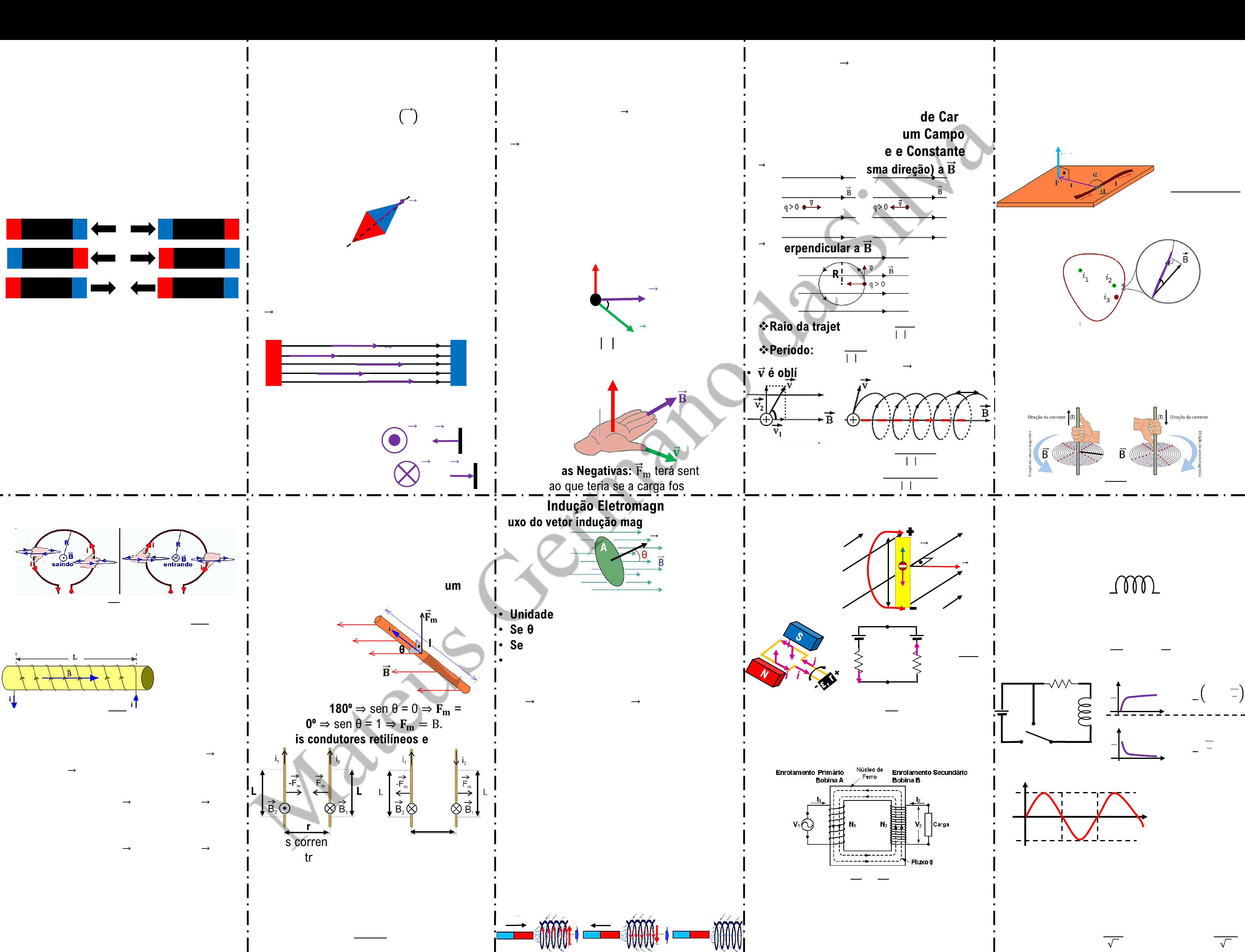 <p>Eletromagnetismo</p><p>Imãs ou Magnetos</p><p>• Polos Magnéticos: regiões de um ímã em</p><p>que as ações magnéticas são mais</p><p>intensas. Dois Polos:</p><p>❖Polo Norte Magnético: extremidade que</p><p>se volta para o polo norte geográfico</p><p>❖Polo Sul Magnético: extremidade que</p><p>aponta para o polo sul geográfico</p><p>• Atração e Repulsão: Polos magnéticos de</p><p>mesmo nome se repelem e polos</p><p>magnéticos de nomes diferentes se atraem.</p><p>❖No polo norte geográfico existe um polo</p><p>sul magnético. Da mesma forma, no polo</p><p>sul geográfico existe um polo norte</p><p>magnético.</p><p>• Lei das Interações entre Polos</p><p>Magnéticos: Dois polos magnéticos se</p><p>atraem ou se repelem na razão inversa do</p><p>quadrado da distância que os separa.</p><p>• Inseparabilidade dos polos de um ímã: É</p><p>impossível separar os polos magnéticos de</p><p>um ímã. Cada pedaço continuará sendo</p><p>sempre um dipolo magnético.</p><p>Campo Magnético de um Imã</p><p>• Região de influências que são significativas</p><p>tanto em outros ímãs como em alguns</p><p>materiais</p><p>• Vetor Indução Magnética 𝐁 :</p><p>❖Unidade da Intensidade: Tesla (T)</p><p>❖Direção: da reta r com a qual a agulha se</p><p>alinha.</p><p>❖Sentido: para onde aponta o polo norte</p><p>magnético da agulha.</p><p>• Linhas de Indução: saem do polo norte e</p><p>chegam ao polo sul externamente ao ímã.</p><p>Campo Magnético Uniforme:</p><p>• É aquele em que o vetor indução magnética</p><p>𝐁 tem o mesmo módulo, direção e sentido</p><p>em todos os pontos do meio.</p><p>• Outra Representação: linhas de indução</p><p>perpendiculares a um plano. Se o sentido</p><p>do campo for:</p><p>❖Para fora do plano:</p><p>❖Para dentro do plano:</p><p>𝐁</p><p>𝐁</p><p>𝐁</p><p>𝐁 𝐁</p><p>𝐁</p><p>Ação Do Campo Magnético Sobre Cargas</p><p>Elétricas</p><p>• Portadores de carga elétrica podem interagir</p><p>com campos magnéticos, submetendo-se a</p><p>uma força magnética Fm</p><p>• Campos Magnéticos Estacionários = o vetor</p><p>𝐁, é, em cada ponto do campo, invariável no</p><p>tempo.</p><p>• Carga elétrica em repouso ou em</p><p>movimento na mesma direção do campo :</p><p>não há atuação do campo magnético</p><p>estacionário</p><p>Carga elétrica em movimento de direção</p><p>diferente da do campo</p><p>𝐅𝐦 = 𝐪 . 𝐯. 𝐁. 𝐬𝐞𝐧 𝛉</p><p>Regra da Mão Direita Espalmada</p><p>• Para Cargas Positivas</p><p>• Para Cargas Negativas: Fm terá sentido</p><p>oposto ao que teria se a carga fosse positiva.</p><p>𝐁</p><p>𝐯</p><p>Ԧ𝐅𝐦</p><p>𝐁</p><p>Ԧ𝐅𝐦</p><p>𝐯</p><p>𝛉</p><p>+</p><p>p</p><p>R</p><p>Campo Magnético Uniforme e Constante</p><p>• Quando o vetor 𝐁, além de ser igual em</p><p>todos os pontos, não apresenta variações</p><p>com o passar do tempo.</p><p>Movimento de Portadores de Carga</p><p>Elétrica Lançados em um Campo</p><p>Magnético Uniforme e Constante</p><p>• 𝐯 é paralela (tem mesma direção) a 𝐁</p><p>• 𝐯 é perpendicular a 𝐁</p><p>❖Raio da trajetória: R =</p><p>m.v</p><p>q .B</p><p>❖Período: T =</p><p>2π.m</p><p>q .B</p><p>• 𝐯 é oblíqua (0° < θ < 90°) a 𝐁</p><p>❖Raio da trajetória: R =</p><p>m.v.sen θ</p><p>q .B</p><p>❖Comprimento p: p =</p><p>2π.m.v.cos θ</p><p>q .B</p><p>θ</p><p>ΔL</p><p>ΔL =</p><p>comprimento</p><p>de um trecho</p><p>elementar</p><p>A Origem do Campo Magnético II</p><p>C. magnético gerado por uma espira circular</p><p>• Intensidade: B =</p><p>μ.i</p><p>2.r</p><p>• Justapondo n espiras iguais: B =</p><p>n.μ.i</p><p>2.R</p><p>Campo magnético gerado por um solenoide</p><p>• Intensidade: B =</p><p>n.μ.i</p><p>L</p><p>Substâncias magnéticas</p><p>• Diamagnéticas: são repelidas por qualquer</p><p>polo de um imã. Quando submetida a Bext,</p><p>criam um Bint de sentido oposto. BR < Bext</p><p>• Paramagnéticas: são fracamente atraídas.</p><p>Quando submetida a Bext, criam um Bint de</p><p>sentido oposto. BResultante > Bext</p><p>• Ferromagnéticas: são fortemente atraídas.</p><p>Quando submetida a Bext, criam um Bint de</p><p>mesmo sentido. BResultante ≫ Bext</p><p>Eletroímã = barra de ferro doce no interior de</p><p>um solenoide que fica imantado quando</p><p>percorrido por uma corrente elétrica</p><p>Ponto de Curie = temperatura na qual o</p><p>material perde todas as propriedades</p><p>ferromagnéticas</p><p>R</p><p>∆𝐁 =</p><p>𝛍. 𝐢. ∆𝐋. 𝐬𝐞𝐧α</p><p>𝟒𝛑. 𝐫𝟐</p><p>ΔB</p><p>P r</p><p>ΔL</p><p>i</p><p>α</p><p>A Regra da mão</p><p>direita se aplica de</p><p>maneira de maneira</p><p>semelhante como</p><p>ocorre numa espira</p><p>ΣB. ∆L. cos θ = µ. i</p><p>A Origem do Campo Magnético I</p><p>• Cargas elétricas em movimento criam um</p><p>campo magnético na região do espaço que</p><p>as circunda (Experimento de Oersted).</p><p>Lei de Bio-Savart</p><p>• Determinação do campo magnético devido à</p><p>corrente elétrica</p><p>• Permeabilidade Absoluta: μ. Unidade: T.m/A</p><p>❖No vácuo: μ0 = 4π. 10−7T.m/A</p><p>Lei de Ampére</p><p>• Consideram-se positivas as correntes</p><p>elétricas que atravessam o percurso no</p><p>sentido da normal ao plano do percurso e</p><p>negativas, no caso contrário.</p><p>Campo magnético gerado por um fio retilíneo</p><p>muito longo (infinito)</p><p>• Intensidade: B =</p><p>μ.i</p><p>2.π.R</p><p>θ</p><p>Força Magnética sobre Correntes</p><p>Elétricas</p><p>Em um trecho elementar de um fio condutor</p><p>Fm = B. i. ∆l. sen θ</p><p>• Δl = comprimento do trecho elementar</p><p>Em um condutor retilíneo imerso em um</p><p>campo magnético uniforme</p><p>• Se θ = 0º ou 180º ⇒ sen θ = 0 ⇒ 𝐅𝐦 = 0</p><p>• Se θ = 90º ⇒ sen θ = 1 ⇒ 𝐅𝐦 = B. i. l</p><p>Entre dois condutores retilíneos e pa