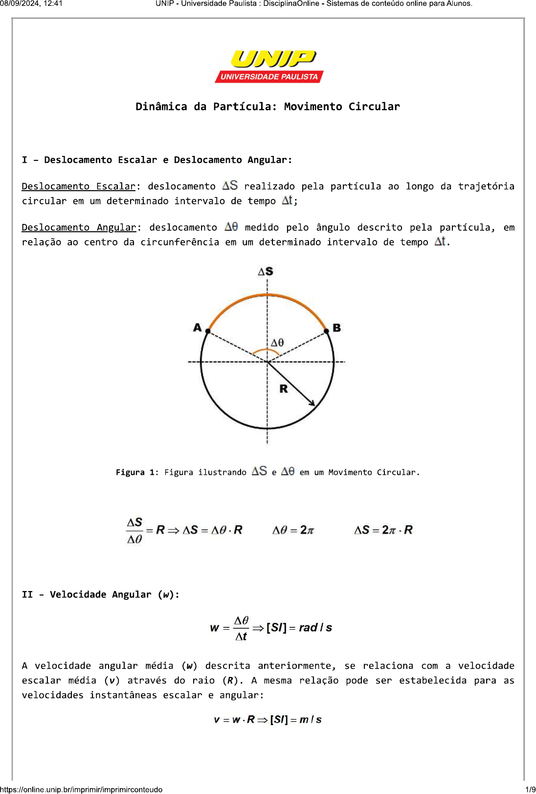 <p>08/09/2024, 12:41 UNIP - Universidade Paulista : DisciplinaOnline - Sistemas de conteúdo online para Alunos. UNIP UNIVERSIDADE PAULISTA Dinâmica da Partícula: Movimento Circular I - Deslocamento Escalar e Deslocamento Angular: Deslocamento Escalar: deslocamento AS realizado pela partícula ao longo da trajetória circular em um determinado intervalo de tempo At; Deslocamento Angular: deslocamento medido pelo ângulo descrito pela em relação ao centro da circunferência em um determinado intervalo de tempo At. AS A B R Figura 1: Figura ilustrando AS e em um Movimento Circular. AS = R AS II - Velocidade Angular (w) : W = At A velocidade angular média (w) descrita anteriormente, se relaciona com a velocidade escalar média (v) através do raio (R). A mesma relação pode ser estabelecida para as velocidades instantâneas escalar e angular: https://online.unip.br/imprimir/imprimirconteudo 1/9</p><p>08/09/2024, 12:41 UNIP Universidade Paulista : DisciplinaOnline - Sistemas de conteúdo online para Alunos. II - Aceleração Angular (a) e Aceleração Centrípeta (ac) : Aw At A aceleração angular média (a) descrita anteriormente, se relaciona com a aceleração escalar média (a) através do raio (R). A mesma relação pode ser estabelecida para as acelerações instantâneas escalar e angular: A aceleração centrípeta ocorre somente em movimentos curvilíneos. Sua direção é perpendicular à direção do vetor velocidade com sentido sempre apontado para o centro da trajetória. módulo da aceleração é definido por: III - Frequência (f) e Período (T) : A frequência representa o número de voltas que a partícula descreve por unidade de tempo: período representa o intervalo de tempo correspondente a uma volta completa: De acordo com as duas relações descritas anteriormente: Considerando uma volta completa: T IV Movimento Circular e Uniforme (MCU) : Características do MCU: a) trajetória circular; b) velocidade vetorial - constante em módulo e variável na direção e sentido; c) aceleração tangencial nula; d) aceleração - constante em módulo e variável na direção e sentido; 2/9</p><p>08/09/2024, 12:41 UNIP - Universidade Paulista : DisciplinaOnline - Sistemas de conteúdo online para Alunos. e) frequência e período - constantes. V V c V R V Exercício 1: Um disco rotativo paralelo ao solo é mostrado na figura a seguir. Um inseto de massa m = 1,0 g está pousado no disco a 12,5 cm do eixo de rotação. Sabendo-se que o coeficiente de atrito estático do inseto com a superfície do disco é 0,8, determine qual o valor mínimo da velocidade angular (no SI) necessária para arremessar o inseto para fora do disco: A) 4 rad/s B) 8 rad/s C) 3/9</p><p>2 rad/s D) 7 rad/s E) 6 rad/s Exercício 2: Uma pedra de 0,75 kg presa a uma corda gira em um círculo horizontal de 35 cm o conforme figura a seguir. Sabendo que o ângulo entre a corda e a vertical é de determine: a velocidade da pedra e a tensão na corda, respectivamente: Considere g = 9,8 0 L T R m mg A) 2,41 m/s</p><p>08/09/2024, 12:41 UNIP - Universidade Paulista : DisciplinaOnline - Sistemas de conteúdo online para Alunos. 8,49 N D) 3,41 m/s 18,49 N E) 0,41 m/s 7,49 N Exercício 3: Um indivíduo com 80 kg de massa, está andando em uma roda-gigante que descreve uma circunferência vertical de 10 m de raio a uma velocidade escalar constante de 6,1 m/s. Determine o período do movimento: A) T = 20,5 S B) T = 12,3 S C) T = 10,9 S D) T = 10,3 S E) 18,3 S Exercício 4: Um indivíduo com 80 kg de massa, está andando em uma roda-gigante que descreve uma circunferência vertical de 10 m de raio a uma velocidade escalar constante de 6,1 m/s. 5/9</p><p>08/09/2024, 12:41 UNIP Universidade Paulista : DisciplinaOnline - Sistemas de conteúdo online para Alunos. Determine o módulo da força normal exercida pelo assento sobre o indivíduo quando ambos passam pelo ponto mais alto da trajetória circular e pelo ponto mais baixo respectivamente: Considere g = 9,8 A) = 386,3 N = 1281,7 N B) FNa = 486,3 N FNb = 7 N C) = 586,3 N = 1181,7 N D) = 498,3 N FNb = 1381,7 N E) = 686,3 N = 1881,7 N Exercício 5: Um carrinho de montanha russa tem uma massa de 1200 kg quando está com a sua carga máxima. Quando o carrinho passa pelo alto de uma elevação circular com 18 m de raio, a velocidade escalar se mantém constante. Nesse instante, detemine o módulo da força normal e o sentido dessa força exercida pelo trilho sobre o carrinho se sua velocidade é de 11 Considere g = 9,8 6/9</p><p>08/09/2024, 12:41 UNIP - Universidade Paulista : DisciplinaOnline - Sistemas de conteúdo online para Alunos. A) N - sentido para cima B) FN N - sentido para baixo. C) = N - sentido para cima D) FN = N - sentido para cima E) N - sentido para baixo Exercício 6: Durante os treinos para uma corrida automobilística, um dos competidores completa a volta (3900 metros) no tempo de 1 min e 18 S. Nesse circuito, há uma curva com 200 m de raio, na qual o piloto consegue manter a velocidade de 108 km/h. Sabe-se que o piloto e carro somam 800 kg. Determine a velocidade média, desenvolvida pelo competidor, na volta descrita em km/h; e a resultante das forças, em newtons (N) que atuaram sobre o carro, no momento da curva, respectivamente. A) 160 km/h 3600 N B) 170 km/h 2600 N C) 180 km/h 7/9</p><p>08/09/2024, 12:41 UNIP - Universidade Paulista : DisciplinaOnline - Sistemas de conteúdo online para Alunos. 7600 N D) 180 km/h 3600 N E) 190 km/h 6600 N Exercício 7: Um automóvel deve contornar uma praça circular seguindo uma trajetória com raio de 100 m. Supondo que a rodovia é horizontal e que o coeficiente de atrito cinético entre os pneus e a estrada é 0,4, qual é a velocidade máxima, em km/h, que o carro poderá atingir para contornar a praça sem derrapar. Considere g = 10 A) 20 km/h B) 62 km/h C) 54 km/h D) 70 km/h E) 72 km/h Exercício 8: 8/9</p><p>08/09/2024, 12:41 UNIP - Universidade Paulista : DisciplinaOnline - Sistemas de conteúdo online par