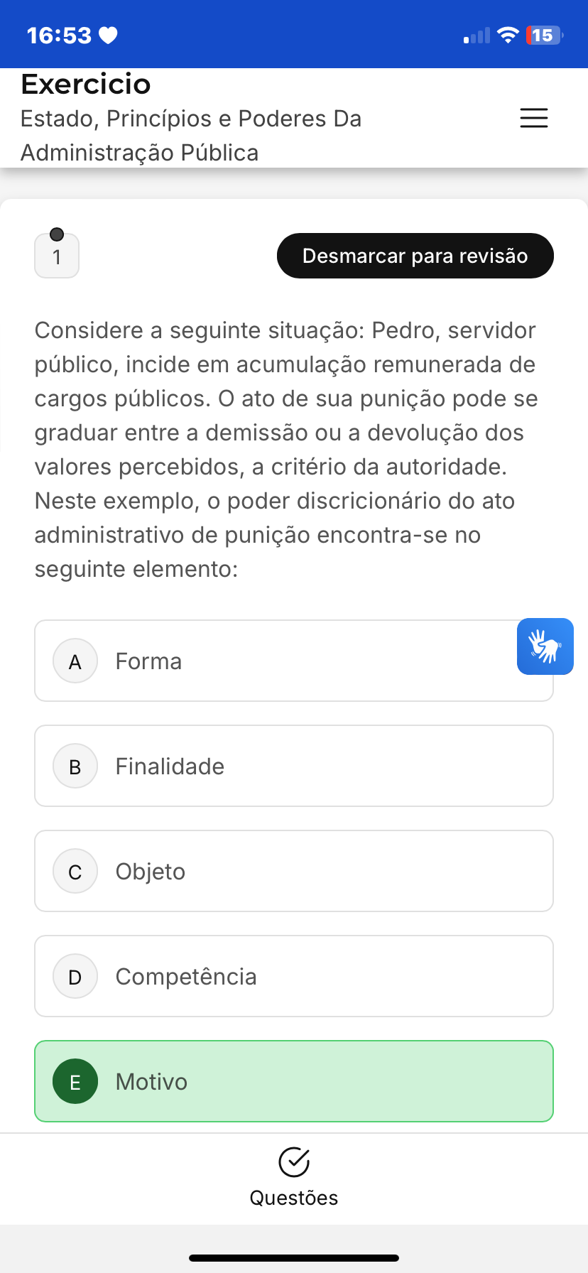 <p>16:53 15 Exercicio Estado, Princípios e Poderes Da Administração Pública 1 Desmarcar para revisão Considere a seguinte situação: Pedro, servidor público, incide em acumulação remunerada de cargos públicos. O ato de sua punição pode se graduar entre a demissão ou a devolução dos valores percebidos, a critério da autoridade. Neste exemplo, o poder discricionário do ato administrativo de punição encontra-se no seguinte elemento: A Forma B Finalidade C Objeto D Competência E Motivo Questões</p>