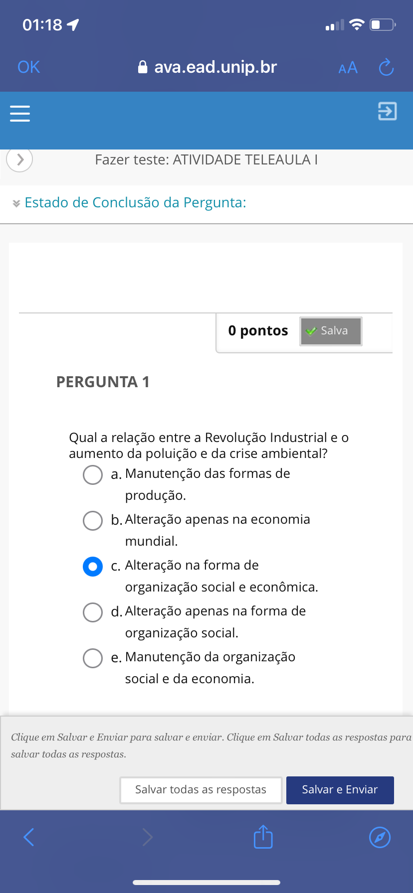 <p>01:18 OK ava.ead.unip.br AA Fazer teste: ATIVIDADE TELEAULA Estado de Conclusão da Pergunta: 0 pontos Salva PERGUNTA 1 Qual a relação entre a Revolução Industrial e o aumento da poluição e da crise ambiental? a. Manutenção das formas de produção. b. Alteração apenas na economia mundial. C. Alteração na forma de organização social e econômica. d. Alteração apenas na forma de organização social. e. Manutenção da organização social e da economia. Clique em Salvar e Enviar para salvar e enviar. Clique em Salvar todas as para salvar todas as respostas Salvar todas as respostas Salvar e Enviar</p>