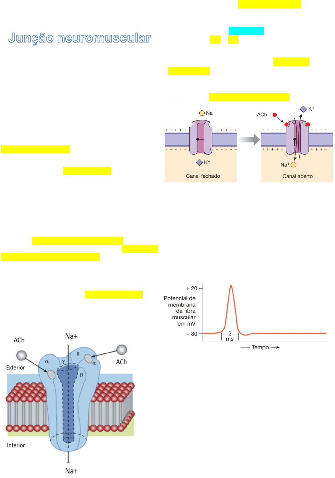 <p>2°P. APG S8P1 – Músculos</p><p>Tema: Limite muscular</p><p> As vias motoras somáticas, que controlam a</p><p>musculatura esquelética, diferem das vias</p><p>autonômicas tanto anatômica quanto</p><p>funcionalmente. Sabe-se que as vias motoras</p><p>somáticas são constituídas por um neurônio único</p><p>que se origina no SNC e projeta seu axônio até o</p><p>tecido-alvo, que é sempre um músculo esquelético</p><p>e são sempre excitatórias. Diferentemente das</p><p>vias autonômicas, que podem ser excitatórias ou</p><p>inibidoras.</p><p> A sinapse entre um neurônio motor somático e</p><p>uma fibra muscular esquelética é chamada de</p><p>junção neuromuscular (JNM).</p><p> Assim como todas as outras sinapses, a junção</p><p>neuromuscular tem 3 componentes:</p><p>1. O terminal axonal pré-sináptico do neurônio</p><p>motor, contendo vesículas sinápticas e</p><p>mitocôndrias;</p><p>2. A fenda sináptica;</p><p>3. A membrana pós-sináptica da fibra muscular</p><p>esquelética.</p><p> No terminal axonal há muitas mitocôndrias que</p><p>fornecem trifosfato de adenosina (ATP), a fonte de</p><p>energia que é usada para a síntese de transmissor</p><p>excitatório: a acetilcolina (ACh).</p><p> O receptor nicotínico da acetilcolina medeia a</p><p>neurotransmissão pós-sináptica na junção</p><p>neuromuscular e nos gânglios autônomos</p><p>periféricos. Sabe-se que o receptor nicotínico no</p><p>adulto é composto por cinco peptíde-os: 2</p><p>peptídeos α,1 peptídeo β, 1 peptídeo γ e 1</p><p>peptídeo δ.</p><p> A ativação de receptor nicotínico causa</p><p>despolarização da célula nervosa ou da membrana</p><p>da placa terminal neuromuscular, devido a ligação</p><p>de 2 moléculas de acetilcolina aos receptores nas</p><p>subunidades α-β e δ-α, o que determina a abertura</p><p>do canal.</p><p> O movimento subsequente de sódio (Na+) e de</p><p>potássio (K+) através do canal está associado a</p><p>uma despolarização graduada da membrana da</p><p>placa motora, sendo essa mudança de voltagem</p><p>denominada potencial da placa motora.</p><p> Se o potencial for pequeno, a permeabilidade e o</p><p>potencial da placa motora normalizam-se, dessa</p><p>forma, não há propagação de um impulso da região</p><p>da placa motora para o restante da membrana</p><p>muscular.</p><p> Entretanto, se o potencial da placa motora for</p><p>grande, a membrana muscular adjacente é</p><p>despolarizada e ocorre propagação de um</p><p>potencial de ação ao longo de toda a fibra</p><p>muscular.</p><p> Em relação aos aspectos quantitativos dos</p><p>potenciais musculares, o potencial de repouso da</p><p>membrana é de cerca de -80 a -90 milivolts nas fibras</p><p>musculares esqueléticas, o mesmo das grandes fibras</p><p>nervosas mielinizadas.</p><p> A duração do potencial de ação é de 1 a 5</p><p>milissegundos no músculo esquelético, cerca de cinco</p><p>vezes mais prolongado que nos grandes nervos</p><p>mielinizados.</p><p> A velocidade de condução é de 3 a 5 m/s, cerca de</p><p>1/13 da velocidade de condução nas grandes fibras</p><p>nervosas mielinizadas que excitam o músculo</p><p>esquelético.</p><p>A magnitude do potencial da</p><p>placa motora está diretamente</p><p>relacionada com a quantidade de</p><p>acetilcolina liberada.</p><p> No músculo esquelético, o influxo resultante de</p><p>sódio (Na+) que despolariza a fibra muscular,</p><p>dispara um potencial de ação que leva à contração</p><p>da célula muscular esquelética.</p><p> A ação da acetilcolina na placa motora terminal</p><p>do músculo esquelético é sempre excitatória,</p><p>produzindo contração muscular. Não há inervação</p><p>antagonista com a função de relaxar os músculos</p><p>esqueléticos.</p><p> Em vez disso, o relaxamento ocorre quando os</p><p>neurônios motores somáticos são inibidos dentro</p><p>do SNC, impedindo a liberação de ACh sobre as</p><p>células musculares esqueléticas.</p><p> A interrupção da transmissão sináptica na junção</p><p>neuromuscular tem efeitos devastadores sobre</p><p>todo o corpo. Sem a comunicação entre o neurônio</p><p>motor e o músculo, os músculos esqueléticos</p><p>responsáveis pelos movimentos e pela</p><p>manutenção da postura enfraquecem, da mesma</p><p>forma que os músculos esqueléticos envolvidos na</p><p>respiração.</p><p>Resumo</p><p>1. Os neurônios motores somáticos ramificam-se</p><p>perto dos seus alvos. Cada ramo divide-se em um</p><p>conjunto de terminais axonais alargados, os quais</p><p>se dispõem sobre a superfície da fibra muscular</p><p>esquelética (FIG. 11.10a).</p><p>2. A sinapse entre um neurônio motor somático e</p><p>uma fibra muscular esquelética é chamada de</p><p>junção neuromuscular (JNM) (Fig. 11.10b).</p><p>3. No lado pós-sináptico da junção neuromuscular,</p><p>a membrana da célula muscular situada em frente</p><p>ao terminal axonal se modifica formando a placa</p><p>motora terminal, uma série de dobras ou sulcos da</p><p>membrana que se parecem com calhas rasas (Fig.</p><p>11.10b, c).</p><p> Ao longo da borda superior de cada dobra, os</p><p>receptores nicotínicos para a acetilcolina (nAChr)</p><p>agrupam-se em uma zona ativa. Entre o axônio e</p><p>o músculo, a fenda sináptica é preenchida com</p><p>uma matriz fibrosa, cujas fibras colágenas mantêm</p><p>o terminal axonal e a placa motora terminal no</p><p>alinhamento adequado. A matriz também contém</p><p>acetilcolinesterase (AChE), a enzima que</p><p>4. Como ocorre em todos os neurônios, os</p><p>potenciais de ação que atingem o terminal axonal</p><p>provocam a abertura de canais de Ca2+</p><p>dependentes de voltagem presentes na membrana</p><p>plasmática.</p><p> O cálcio difunde-se para o interior da célula, a</p><p>favor do seu gradiente eletroquímico,</p><p>desencadeando a liberação da ACh contida nas</p><p>vesículas sinápticas.</p><p> A acetilcolina difunde-se pela 