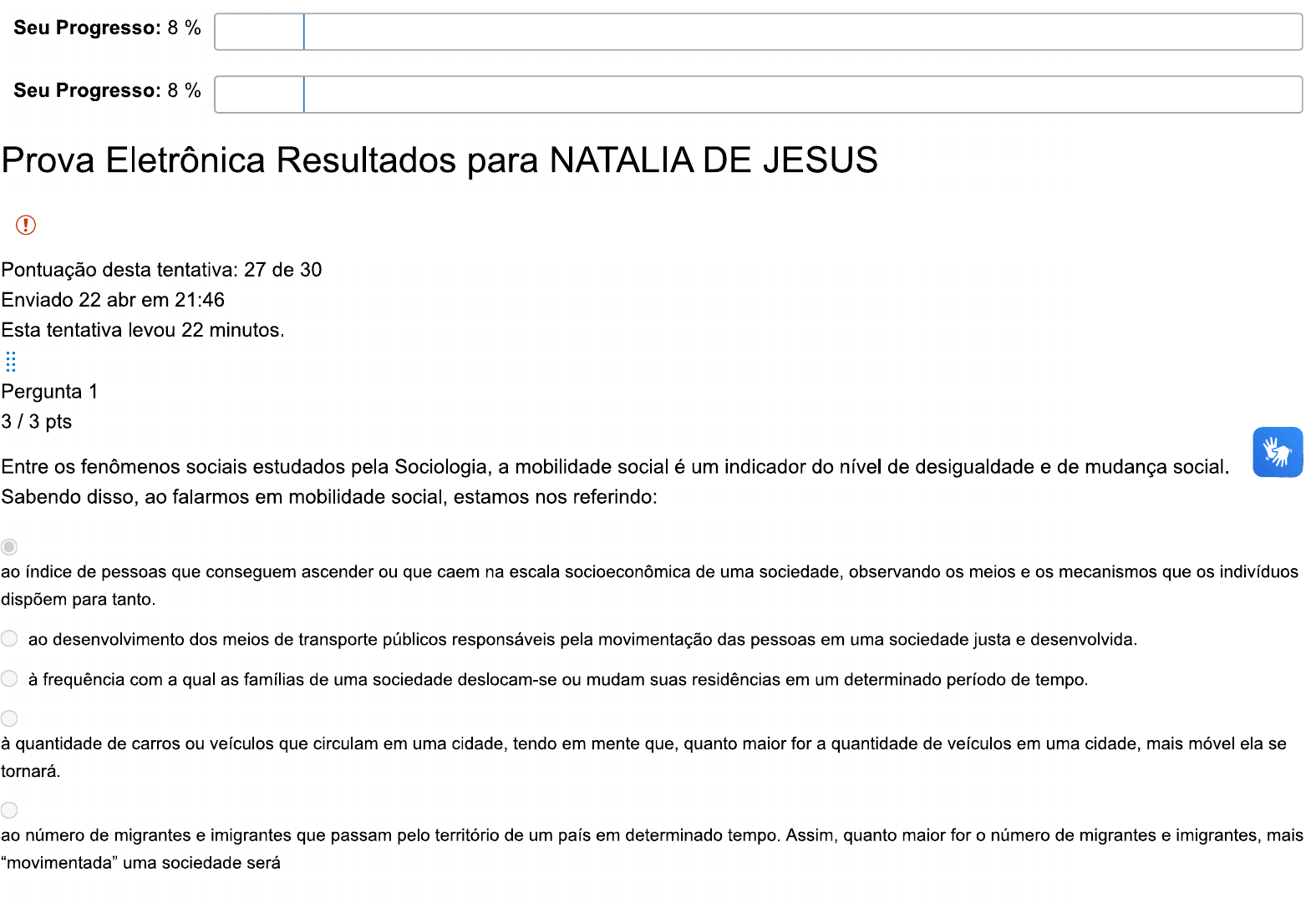 <p>Seu Progresso: 8 % Seu Progresso: 8 % Prova Eletrônica Resultados para NATALIA DE JESUS ! Pontuação desta tentativa: 27 de 30 Enviado 22 abr em 21:46 Esta tentativa levou 22 minutos. Pergunta 1 3/3 pts Entre os fenômenos sociais estudados pela Sociologia, a mobilidade social é um indicador do nível de desigualdade e de mudança social. Sabendo disso, ao falarmos em mobilidade social, estamos nos referindo: ao índice de pessoas que conseguem ascender ou que caem na escala socioeconômica de uma sociedade, observando os meios e os mecanismos que os indivíduos dispõem para tanto. ao desenvolvimento dos meios de transporte públicos responsáveis pela movimentação das pessoas em uma sociedade justa e desenvolvida. à frequência com a qual as famílias de uma sociedade deslocam-se ou mudam suas residências em um determinado período de tempo. à quantidade de carros ou veículos que circulam em uma cidade, tendo em mente que, quanto maior for a quantidade de veículos em uma cidade, mais móvel ela se tornará. ao número de migrantes e imigrantes que passam pelo território de um país em determinado tempo. Assim, quanto maior for o número de migrantes e imigrantes, mais "movimentada" uma sociedade será</p><p>Pergunta 2 3 / 3 pts Leia o fragmento do texto a seguir: Natureza e Cultura Diferenças entre o homem e o animal de Marco Maluf O fato de o homem ser dotado da criação simbólica o diferencia dos outros animais fazendo com que o ser humano se torne um ser histórico, um ser que constrói a sua própria história, ao contrário dos outros animais que não possuem história. O homem vive num contínuo processo de criação de valores, ou seja, forma ideias sobre o que é o certo ou o que é o errado, noções ou conceitos como o de justiça, por exemplo. Portanto, o homem é consciente dos seus próprios atos e, por isso, é responsável por eles. Os animais vivem em meio à natureza e se misturam com ela, vivem o instante presente. O ser humano, através do trabalho, transforma a natureza e cria a cultura. A cultura se encontra acumulada nas ciências, nas artes, nas religiões, etc., que são a grande produção da humanidade. A filosofia é também um produto do conhecimento humano e fornece as bases da civilização ocidental. Fonte: Disponível em: De acordo com o texto percebe-se o que diferencia o ser humano dos outros animais. Com base no texto, podemos entender que a diversida cultural. busca distinguir cada individuo, aproximando-os do estado de natureza onde inexistia uma sociedade organizada. contribui para a criação de diferentes signos, símbolos e valores que representam os indivíduos mais intimamente. constrói uma barreira entre as diferentes sociedades com sua multiplicidade de signos e valores, dificultando a relação entre os indivíduos. atenta contra uma cultura globalizada, impedindo o desenvolvimento da sociedade ao torná-la múltipla. altera os valores das sociedades provocando diversos conflitos entre os indivíduos, afastando-os, assim, da natureza humana. Pergunta 3 3/3 pts O Ensino Fundamental - Anos Finais - é considerado o período ideal para o professor explicar aos alunos que o Brasil foi um país escravocrata e que a abolição da escravidão não veio acompanhada de um processo de inclusão dos negros na sociedade brasileira. Bem como conhecer e debater sobre a cultura indígena, e as consequências da colonização dos povos que formaram a população brasileira até os dias atuais.</p><p>Para romper com teorias racistas e diminuir o preconceito, o MEC incluiu no currículo, temáticas que façam os alunos refletirem sobre a democracia racial e a formação cultural brasileira. Até bem pouco tempo atrás, o Brasil, conhecido internacionalmente por sua diversidade cultural e pela mistura de raças que formam o seu povo, não tinha as diferentes etnias representadas nos currículos escolares do País. Para tanto, duas Leis foram sancionadas, nos anos de 2003 e 2008, que tornaram obrigatório, no Ensino Fundamental e Médio, o estudo: dos Movimentos Sociais no Brasil. dos Direitos Humanos. da Evolução Cultural Brasileira. da Sociologia e da Filosofia. da História e Cultura afro-brasileira e indígena. Pergunta 4 3 / 3 pts Com bases nos estudos da disciplina, De acordo com a Lei 10.639/ 2003, nos estabelecimentos de: ensino fundamental e médio das escolas públicas, torna-se obrigatório o ensino sobre História e Cultura Afro. Ensino Superior torna-se obrigatório o ensino sobre as Relações ÉtnicoRaciais, excluindo esta obrigatoriedade no Ensino Básico. ensino fundamental e médio, oficiais e particulares, torna-se obrigatório o ensino sobre História e Cultura Afro-Brasileira. ensino médio e superior, oficiais e particulares, torna-se obrigatório o ensino sobre História e Cultura Afro-Brasileira. ensino fundamental, oficiais e particulares, torna-se obrigatório o ensino sobre História e Cultura Afro-Brasileira. Pergunta 5 3/3 pts Na modalidade de Educação Básica do Campo, a educação para a população rural está prevista com adequações necessárias às peculiaridades da vida no campo e de cada região. São características da educação do campo:</p><p>Organização escolar própria, combinando a adequação do calendário escolar às condições climáticas da zona urbana e às fases do ciclo agrícola. Formas de estruturação e metodologias pertinentes à realidade do campo, como a pedagogia da terra, pela qual se busca um trabalho pedagógico fundamentado no princípio das competências e habilidades, a fim de assegurar a inserção no mercado de trabalho das cidades, processo inevitável diante do êxodo rural. Construção de uma identidade escolar definida pela vinculação com as questões inerentes à sua realidade, com propostas pedagógicas que contemplam sua diversidade em todos os aspectos, tais como sociais, culturais, políticos, econômicos, de gênero, geração e etnia. Adequação das at