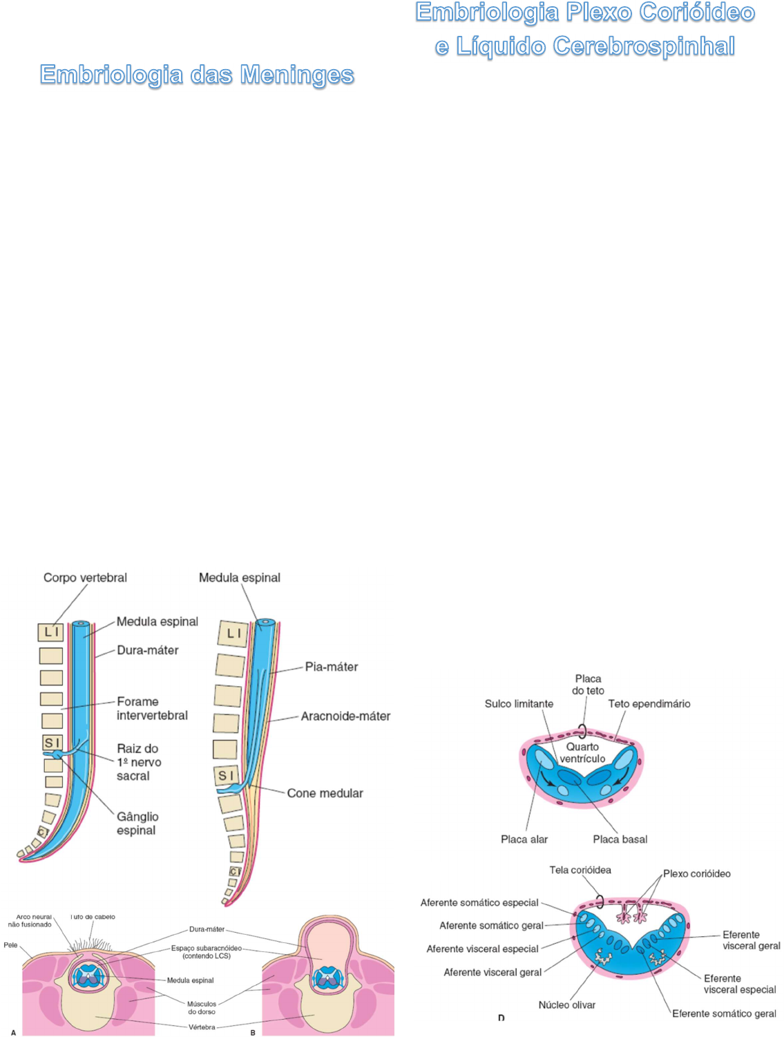 <p>2°P. APG S1P1 – Sistema Nervoso</p><p>Aluna: Amanda Martins Costa</p><p>Tema: Desenvolvimento do SN</p><p>As meninges (membranas que recobrem a</p><p>medula espinhal)</p><p> Se desenvolvem das células da crista neural</p><p>e do mesênquima entre o 20° e o 35° dias. As</p><p>células migram para circundar o tubo neural</p><p>(primórdio do encéfalo e da medula espinal) e</p><p>formam as meninges primitivas</p><p> A camada externa dessas membranas torna-</p><p>se espessa para formar a dura-máter,</p><p>formada pelo mesênquima que envolve o tubo</p><p>neural.</p><p> Camada interna, a pia-aracnoide, é</p><p>composta pela pia-máter e aracnoide-máter</p><p>(leptomeninges).</p><p> Espaços cheios de líquido aparecem nas</p><p>leptomeninges, que logo coalescem para</p><p>formar o espaço subaracnóideo</p><p> A origem da pia-máter e aracnoide a partir</p><p>de uma camada única é indicada no adulto</p><p>pelas trabéculas aracnoides, as quais são</p><p>delicadas e passam entre a pia e a aracnoide.</p><p> O fino teto ependimário do quarto ventrículo</p><p>é coberto externamente pela pia-máter, essa</p><p>membrana vascular, junto com o teto</p><p>ependimário, forma a tela corióidea.</p><p> Devido à proliferação ativa da pia-máter, a</p><p>tela corióidea invagina o quarto ventrículo,</p><p>onde se diferencia no plexo corióideo, os</p><p>dobramentos das artérias corióideas da pia.</p><p> Plexos semelhantes desenvolvem-se no</p><p>teto do terceiro ventrículo e nas paredes</p><p>mediais dos ventrículos laterais.</p><p> Os plexos corióideos secretam o líquido</p><p>ventricular, que se torna o líquido</p><p>cerebrospinal (LCS) à medida que adições</p><p>são feitas a ele a partir das superfícies do</p><p>encéfalo, medula espinal e camadas pia-</p><p>máter e aracnoide-máter das meninges;</p><p> O líquido cerebrospinal começa a se</p><p>formar durante a 5ª semana;</p><p> O teto do quarto ventrículo, começa a se</p><p>evaginar em 3 localizações, essas</p><p>evaginações se rompem para formar as</p><p>aberturas mediana (forame de Magendie) e</p><p>as aberturas lateral (forame de Luschka)</p><p>que permitem que o LCE entre no espaço</p><p>subaracnóideo.</p><p> As meninges são 3 revestimentos distintos</p><p>de tecido conjuntivo, situam-se entre os ossos</p><p>e os tecidos do SNC, que envolvem e</p><p>protegem a medula espinal e o encéfalo.</p><p>Estas membranas ajudam a estabilizar o</p><p>tecido neural e a protegê-lo do impacto contra</p><p>os ossos.</p><p>1. Dura-Máter:</p><p> A mais superficial;</p><p> É uma camada espessa e resistente de</p><p>tecido conjuntivo denso não modelado;</p><p> Se relaciona com o crânio e o canal vertebral</p><p>(segunda vértebra sacra)</p><p> Entre ela é as vértebras, existe um espaço</p><p>ocupado por gorduras e veias: espaço</p><p>extradural (epidural), utilizado para introdução</p><p>de anestésicos em algumas cirurgias.</p><p>2. Aracnoide-Máter:</p><p> Membrana intermediária, (camada média);</p><p> É avascular delgado constituído por células e</p><p>delicadas fibras elásticas e de colágeno;</p><p> É denominada aracnoide-máter por causa do</p><p>arranjo em formato de teia de aranha;</p><p> Fibras de colágeno e de algumas fibras</p><p>elásticas que se estendem entre a aracnoide-</p><p>máter e a pia-máter;</p><p> Entre a dura-máter e a aracnoide-máter</p><p>existe um espaço subdural estreito, que</p><p>contém líquido intersticial.</p><p>3. Pia-máter:</p><p> Mais interna;</p><p> Formada por uma fina camada e de tecido</p><p>conjuntivo transparente que adere à superfície</p><p>da medula espinal e do encéfalo; constituída</p><p>por finas células pavimentosas e cúbicas</p><p>entrelaçadas com feixes de fibras de colágeno</p><p>e algumas fibras elásticas;</p><p> É encontrado muitos vasos sanguíneos que</p><p>fornecem oxigênio e nutrientes para a medula</p><p>espinal.</p><p>RESUMO: As meninges são formadas pela</p><p>dura-máter, pia-máter e aracnóide.</p><p>A dura-máter é proveniente do</p><p>mesênquima que circunda o tubo neural.</p><p>E a Pia-máter e a aracnóide são derivadas</p><p>das células da crista neural.</p><p>Para a realização da punção lombar, primeiro é</p><p>aplicado um anestésico local, e uma agulha longa e oca</p><p>é inserida no espaço subaracnóideo para coletar líquido</p><p>cerebrospinal (LCS) para fins diagnósticos;</p><p>Durante esse procedimento, o paciente fica em</p><p>decúbito lateral com a coluna vertebral flexionada. A</p><p>flexão da coluna vertebral aumenta a distância entre os</p><p>processos espinhosos das vértebras, facilitando o</p><p>acesso ao espaço subaracnóideo.</p><p>A punção lombar de adultos é realizada entre as</p><p>vértebras L III e L IV ou entre L IV e L V porque essa</p><p>região proporciona acesso seguro ao espaço</p><p>subaracnóideo sem o risco de lesão da medula espinal.</p><p>Os ventrículos são dilatações do canal do tubo</p><p>neural. São quatro ventrículos encefálicos:</p><p>2 ventrículos laterais (o primeiro e o segundo),</p><p>o terceiro e o quarto.</p><p>1.- 2. Os ventrículos laterais são separados</p><p>entre si pelo septo pelúcido o qual se encontra</p><p>na linha mediana, imediatamente inferior ao</p><p>corpo caloso, e em geral são fundidos entre si.</p><p>3. O terceiro ventrículo, está localizada no</p><p>centro do diencéfalo, entre as duas metades do</p><p>tálamo. Comunica-se com os ventrículos</p><p>laterais por meio dos forames</p><p>interventriculares e, com o IVº ventrículo pelo</p><p>aqueduto do mesencéfalo.</p><p>4. O quarto ventrículo está situado na porção</p><p>inferior da ponte e superior do bulbo, na base</p><p>do cerebelo. percorre o interior do tronco</p><p>encefálico e conecta-se com o canal central da</p><p>medula espinal</p><p>Os ventrículos laterais são constituídos pelo</p><p>primeiro e segundo ventrículos. O terceiro e o</p><p>quarto ventríc
