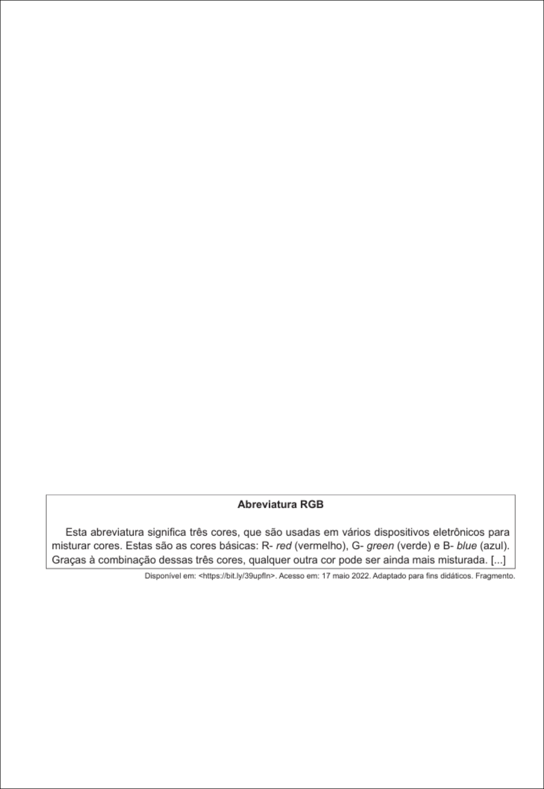 <p>Exercícios – Luz e cores</p><p>1) Qual a diferença entre corpos luminosos e corpos iluminados. Cite exemplos de cada um.</p><p>2) Por que não é possível enxergar em um ambiente totalmente escuro?</p><p>3) Quando a luz branca atravessa um prisma transparente, ela decompõe-se, tornando evidente o</p><p>espectro de cores que se unem para formá-la. O fenômeno descrito refere-se à:</p><p>a) dispersão da luz.</p><p>b) reflexão da luz.</p><p>c) absorção da luz.</p><p>d) refração da luz.</p><p>4) Uma flor vermelha, iluminada pela luz solar:</p><p>a) reflete a luz vermelha e absorve as demais.</p><p>b) absorve a luz vermelha e, em seguida, emite-a.</p><p>c) absorve a luz vermelha e reflete as demais.</p><p>d) reflete todas as luzes.</p><p>5) (UFPB) As folhas de uma árvore, quando iluminadas pela luz do Sol, mostram-se verdes</p><p>porque:</p><p>a) refletem somente a luz verde do espectro solar.</p><p>b) absorvem somente a luz verde do espectro solar.</p><p>c) a visão humana é mais sensível a essa cor.</p><p>d) refletem todas as cores do espectro solar, exceto o verde.</p><p>6) Classifique as afirmativas a seguir em verdadeiras (V) ou falsas (F).</p><p>a) ( ) Um objeto branco, iluminado com luz verde, reflete a cor azul.</p><p>b) ( ) Um objeto vermelho, iluminado com luz branca, reflete a cor vermelha.</p><p>c) ( ) Um objeto preto é aquele que absorve todas as cores.</p><p>d) ( ) Um material de cor branca não reflete nenhuma frequência de luz.</p><p>e) ( ) Um objeto vermelho, numa sala escura, quando iluminado com luz azul, parece preto.</p><p>7) Um pedaço de tecido vermelho, quando observado numa sala iluminada com luz azul, parece:</p><p>a) preto.</p><p>b) branco.</p><p>c) vermelho.</p><p>d) azul.</p><p>8) Leia o texto abaixo.</p><p>As cores mencionadas nesse texto são classificadas como</p><p>a) neutras.</p><p>b) primárias.</p><p>c) secundárias.</p><p>d) terciárias.</p><p>9) Marcos foi contratado para fazer a iluminação de um show. Durante um determinado momento</p><p>desse show, o cantor precisa ser iluminado pela cor amarela. Para isso, Marcos pode utilizar</p><p>dois canhões de luz com cores primárias diferentes que, ao serem misturadas, resultam na cor</p><p>amarela. Para conseguir iluminar esse cantor, Marcos precisa usar os canhões de luz com as</p><p>cores</p><p>a) azul e verde.</p><p>b) laranja e verde.</p><p>c) verde e vermelho.</p><p>d) vermelho e azul.</p><p>10) Mateus quer pintar um desenho, utilizando apenas cores secundárias. Para isso, ele dispõe de</p><p>quatro caixas de lápis de cor, com três lápis cada. As cores e as caixas que Mateus pode usar</p><p>estão apresentadas no quadro abaixo.</p><p>Qual caixa Mateus deve escolher para pintar seu desenho?</p><p>a) 1 b) 2 c) 3 d) 4</p><p>11) Marcela, recentemente, resolveu comercializar camisetas com estampas no estilo tie-dye.</p><p>Inicialmente, Marcela tem pouco recurso para arcar com as mais diversas cores de tinta para os</p><p>pedidos de seus clientes. Nesse sentido, as cores essenciais para o início desse novo projeto são</p><p>a) verde, azul e vermelho, que são cores primárias.</p><p>b) vermelho, azul e amarelo, que são cores primárias.</p><p>c) laranja, roxo e verde, que são cores secundárias.</p><p>d) vermelho, o azul e o amarelo, que são cores</p><p>secundárias.</p><p>12) Observe abaixo o desenho da bandeira do Brasil. Suponha que a bandeira esteja em um ambiente</p><p>escuro e seja iluminada por uma luz amarela. Quais serão as cores de cada elemento?</p><p>Retângulo –</p><p>Losango –</p><p>Círculo –</p><p>Estrelas e faixa branca –</p><p>Letras –</p><p>13) A margarida ao lado foi fotografada sob uma fonte de</p><p>luz branca. Assim, vemos suas pétalas na cor branca,</p><p>seu disco central na cor amarela e suas folhas na cor</p><p>verde. Identifique a cor que essas mesmas partes</p><p>teriam se fossem iluminadas por uma fonte de luz</p><p>monocromática vermelha.</p>