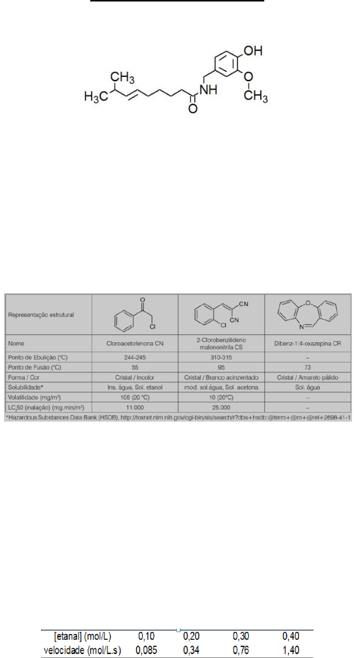 <p>Reações Orgânicas</p><p>01) (ACAFE 2016) O spray de pimenta é um tipo de agente lacrimogêneo que possui a capsaicina como princípio</p><p>ativo.</p><p>Fórmula estrutural da capsaicina</p><p>Baseado nas informações fornecidas e nos conceitos químicos é correto afirmar, exceto:</p><p>a) A capsaicina possui os grupos funcionais amida, fenol e éter.</p><p>b) A oxidação energética (K2Cr2O7 ou KMnO4 em meio ácido e quente) da capsaicina tem como produto majoritário um</p><p>composto contendo o grupo funcional aldeído.</p><p>c) Sob condições apropriadas a capsaicina pode sofrer ozonólise, formando compostos que apresentam a função</p><p>química aldeído.</p><p>d) Sob condições apropriadas, a capsaicina pode reagir com Br2 em uma reação de adição.</p><p>02) (ACAFE 2016) Para resolver a questão 02 considere os trechos retirados do artigo: Química e Armas Não Letais:</p><p>Gás Lacrimogêneo em Foco da revista Química Nova na Escola, volume 71, número 2. maio de 2015, p. 88-92.</p><p>Quadro 01: Representação estrutural e propriedades dos lacrimogêneos. Considere os pontos de fusão e ebulição medidos sob 1 atm</p><p>“[...] Os lacrimogêneos são constituídos por três compostos que são utilizados separadamente: CN (cloroacetofenona),</p><p>CS (2-clorobenzilideno malononitrila) e CR (dibenz-1:4-oxazepina) […]”.</p><p>Baseado nas informações fornecidas e nos conceitos químicos é correto afirmar, exceto:</p><p>a) Na reação do cloroacetofenona (CN) com o reagente de Tollens (solução de AgNO3 + NH3) aparecerá um depósito</p><p>de prata finamente dividida (espelho de prata).</p><p>b) O CN e o CS são compostos clorados, porém, de classes estruturais diferentes, sendo o CN da classe das cetonas</p><p>e o CS, uma nitrila.</p><p>c) Os três compostos orgânicos podem atuar como base de Lewis.</p><p>d) Sob temperatura de 65ºC e 1,0 atm os compostos orgânicos CS e CR encontram-se no estado sólido e CN líquido.</p><p>03) (ACAFE 2016) O etanal pode ser usado em fábricas de espelhos na redução de sais de prata que fixados no vidro</p><p>permitem a reflexão da imagem. A velocidade inicial de decomposição de etanal foi medida em diferentes</p><p>concentrações, conforme mostrado a seguir.</p><p>CH3CHO(g) → CH4(g) + CO(g)</p><p>Baseado nas informações fornecidas e nos conceitos químicos analise as afirmações a seguir.</p><p>l - A reação química abordada é de primeira ordem.</p><p>ll - A decomposição do etanal produz uma substância apolar e outra polar.</p><p>lll - O etanal possui a função química aldeído.</p><p>lV - Sob condições apropriadas a oxidação do etanal produz ácido acético.</p><p>Assinale a alternativa correta.</p><p>a) Todas as afirmações estão corretas.</p><p>b) Apenas II, III e IV estão corretas.</p><p>c) Apenas I e II estão corretas.</p><p>d) Apenas a afirmação III está correta.</p><p>04) (ACAFE 2018) Na química orgânica, o teste de Tollens pode ser utilizado para diferenciação de aldeídos e</p><p>cetonas. O teste consiste no aquecimento da amostra em solução de nitrato de prata com excesso de hidróxido</p><p>de amônio (reativo de Tollens). Caso a amostra contenha a função química aldeído, ocorrerá a formação de um</p><p>precipitado de prata (espelho de prata).</p><p>Baseado nos conceitos químicos e nas informações fornecidas analise as afirmações a seguir e assinale a</p><p>alternativa correta.</p><p>l Numa solução aquosa de glicose submetida ao teste de Tollens ocorrerá a formação do espelho de prata.</p><p>ll Numa amostra de formol submetida ao teste de Tollens ocorrerá a formação do espelho de prata.</p><p>lll Numa amostra de ácido metanóico submetida ao teste de Tollens ocorrerá a formação do espelho de prata.</p><p>a) Todas estão corretas.</p><p>b) Apenas a II está correta.</p><p>c) Nenhuma está correta.</p><p>d) Apenas I e II estão corretas.</p><p>05) (ACAFE 2018) Na química orgânica a síntese de Dumas consiste no aquecimento a seco de sal de ácido carboxílico</p><p>com cal sodada (mistura de hidróxido de sódio e óxido de cálcio) onde se dá a formação de um alcano majoritário. Por</p><p>exemplo, nessa síntese utilizando-se o acetato de sódio tem-se como produto o metano (alcano majoritário).</p><p>Assinale a alternativa que contém o alcano majoritário formado quando se utiliza o sal 2-metil- propanoato de sódio.</p><p>a) 2-metil-propano</p><p>b) etano.</p><p>c) propano</p><p>d) butano</p><p>06) (UPF 2016) Correlacione cada reação indicada na coluna 1 com o produto que deve ser formado nesta, indicado</p><p>na coluna 2.</p><p>A sequência correta de preenchimento dos parênteses, de cima para baixo, é:</p><p>a) 1 – 4 – 3 – 5 – 2.</p><p>b) 3 – 5 – 1 – 2 – 4.</p><p>c) 5 – 3 – 1 – 4 – 2.</p><p>d) 1 – 4 – 5 – 3 – 2.</p><p>e) 4 – 3 – 5 – 1 – 2.</p><p>07) (UPF 2017) A seguir, está representada a estrutura do éster responsável pelo flavor de abacaxi.</p><p>Marque a opção que indica corretamente os reagentes que podem ser usados para produzir esse éster via reação de</p><p>esterificação catalisada por ácido.</p><p>a) CH3(CH2)2COOH + CH3CH2OH</p><p>b) CH3CH2COOH + CH3CH2Cl</p><p>c) CH3CH2CH2CH2OH + CH3COOH</p><p>d) CH3(CH2)2COCH3 + CH3CH2CH2CH3</p><p>e) CH3(CH2)2CHO + CH3CH2OH</p><p>08) (UPF 2017) Observe a representação da reação de halogenação do benzeno e marque a opção que indica o tipo</p><p>de reação que o benzeno sofreu.</p><p>a) Adição.</p><p>b) Substituição.</p><p>c) Eliminação.</p><p>d) Rearranjo.</p><p>e) Isomeria.</p><p>09) (UNIJUÍ 2021) O etanol presente em bebidas alcóolicas quando ingerido sofre em biotransformação hepática, como</p><p>indicado abaixo. A enzima aldeído desidrogenase (AD) transforma o etanol em uma outa molécula (II) que, na</p><p>sequência é transformada em acetato pela enzima acetaldeído desidrogenase (ADH).</p><p>O grupo funcional d