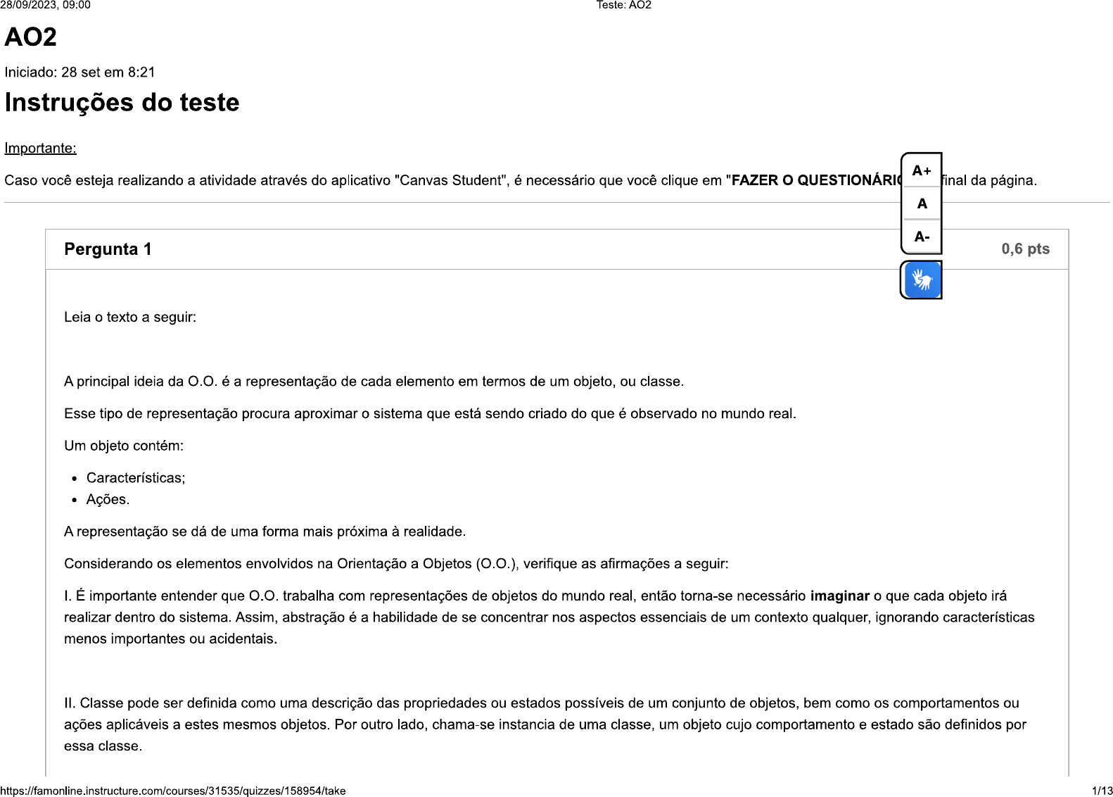 <p>28/09/2023, 09:00 Teste: AO2 AO2 Iniciado: 28 set em 8:21 Instruções do teste Importante: A+ Caso você esteja realizando a atividade através do aplicativo "Canvas Student", é necessário que você clique em "FAZER o QUESTIONÁRIO final da página. A A- Pergunta 1 0,6 pts Leia o texto a seguir: A principal ideia da O.O. é a representação de cada elemento em termos de um objeto, ou classe. Esse tipo de representação procura aproximar o sistema que está sendo criado do que é observado no mundo real. Um objeto Características; Ações. A representação se dá de uma forma mais próxima à realidade. Considerando os elementos envolvidos na Orientação a Objetos (O.O.), verifique as afirmações a seguir: I. É importante entender que O.O. trabalha com representações de objetos do mundo real, então torna-se necessário imaginar o que cada objeto irá realizar dentro do sistema. Assim, abstração é a habilidade de se concentrar nos aspectos essenciais de um contexto qualquer, ignorando características menos importantes ou acidentais. II. Classe pode ser definida como uma descrição das propriedades ou estados possíveis de um conjunto de objetos, bem como os comportamentos ou ações aplicáveis a estes mesmos objetos. Por outro lado, chama-se instancia de uma classe, um objeto cujo comportamento e estado são definidos por essa classe. https://famonline.instructure.com/courses/31535/quizzes/158954/take 1/13</p><p>28/09/2023, 09:00 Teste: AO2 III. Atributos são os elementos que definem a estrutura de uma classe. Também são conhecidos como variáveis de classe. Um atributo é um dado para o qual cada objeto tem seu próprio valor. Atributos são, basicamente, a estrutura de dados que vai representar a classe. É correto o que se afirma em: A+ e apenas. A e II, apenas. A- e III. e III, apenas. apenas. Pergunta 2 0,6 pts Leia o texto a seguir: Classe é um conceito que encapsula (abrange, abarca) abstrações de dados e procedimentos que descrevem o conteúdo e o comportamento de entidades do mundo real, representadas por objetos. Considerando que o comportamento das classes se dá por meio dos métodos a ela associadas. Avalie as afirmações a seguir: I. Os métodos são as mensagens enviadas a um objeto, que podem mudar o valor de um ou mais atributos, alterando o estado de um objeto. II. Métodos possuem a propriedade especial, que em tempo de execução, não acessam os dados armazenados em uma instância da classe, assim não são capazes de controlar o estado (valores) da instância. III. Os métodos determinam o comportamento dos objetos de uma classe e são análogos às funções ou procedimentos da programação estruturada. https://famonline.instructure.com/courses/31535/quizzes/158954/take 2/13</p><p>28/09/2023, 09:00 Teste: AO2 É correto o que se afirma em: apenas. e III, apenas. A+ e II, apenas. A e III apenas. A- I, e III. Pergunta 3 0,6 pts Leia o texto a seguir: Normalização é um processo para avaliar e corrigir estruturas e tabelas de modo a minimizar as redundâncias de dados, reduzindo, assim, a probabilidade de anomalias. A normalização atua por meio de uma série de estágios chamados formas normais. A 1FN descreve um formato de tabela em que todos os atributos de chave estão definidos, não há grupos de repetição e todos os atributos são dependentes da chave primária. Na 2FN, a tabela deve estar na 1FN e não incluir dependências parciais. Sendo assim, podemos ter como exemplo as seguintes tabelas (em formato de esquema relacional): Projeto (Proj_Num, Proj_Nome); Funcionario(Func_Num, Func_Nome, Func_Cargo, Func_SalHora); Designacao(Proj_Num, Func_Num, Desig_Horas) Fonte: Coronel, C.; Rob, P. Sistemas de Banco de Dados: projeto, implementação e administração. São Paulo, Cengage Learning, 2011. Avalie as asserções a seguir: https://famonline.instructure.com/courses/31535/quizzes/158954/take 3/13</p><p>28/09/2023, 09:00 Teste: AO2 I.As tabelas Projeto, Funcionário e Designação encontram-se na primeira forma normal, e, também, na segunda forma normal. PORQUE II. .Todos os atributos de chave estão definidos, não possuem grupos de repetição e todos os atributos são dependentes da chave primária. E, também, porque não inclui dependências parciais. A+ A respeito dessas asserções, assinale a opção correta: A As asserções e são proposições falsas. A- A asserção é uma proposição falsa, e a é uma proposição verdadeira. As asserções e são proposições verdadeiras, mas a não é uma justificativa da I. A asserção é uma proposição verdadeira, e a é uma proposição falsa. As asserções e são proposições verdadeiras, e a é uma justificativa da I. Pergunta 4 0,6 pts Leia o texto a seguir: Na atualidade, estamos diante de uma explosão de informações multimídias. Por exemplo, uma grande quantidade de imagens e vídeos está sendo criada e armazenada na internet, conversões de pinturas e figuras no formato impresso ou digital, bem como imagens de jornais e TV para facilitar o processamento, distribuição e preservação. Muitas imagens médicas estão sendo capturadas todos os dias e os satélites estão produzindo muito mais. Seria de pouca utilidade criar um simples repositório para essa quantidade cada vez maior de informações multimídia, por este motivo, elas precisam estar organizadas para recuperação rápida e sob demanda. Não apenas uma quantidade crescente de dados está sendo armazenada, mas também tipos de dados com características diferentes dos dados alfanuméricos. Buscando identificar as características de dados multimídia, avalie as afirmações a seguir: https://famonline.instructure.com/courses/31535/quizzes/158954/take 4/13</p><p>28/09/2023, 09:00 Teste: AO2 I. Dados multimídias, especialmente áudio e vídeo, são muito intensivos em dados; têm dimensão temporal e devem ser reproduzidos a uma taxa fixa; são representados em uma série de valores de amostra indiv