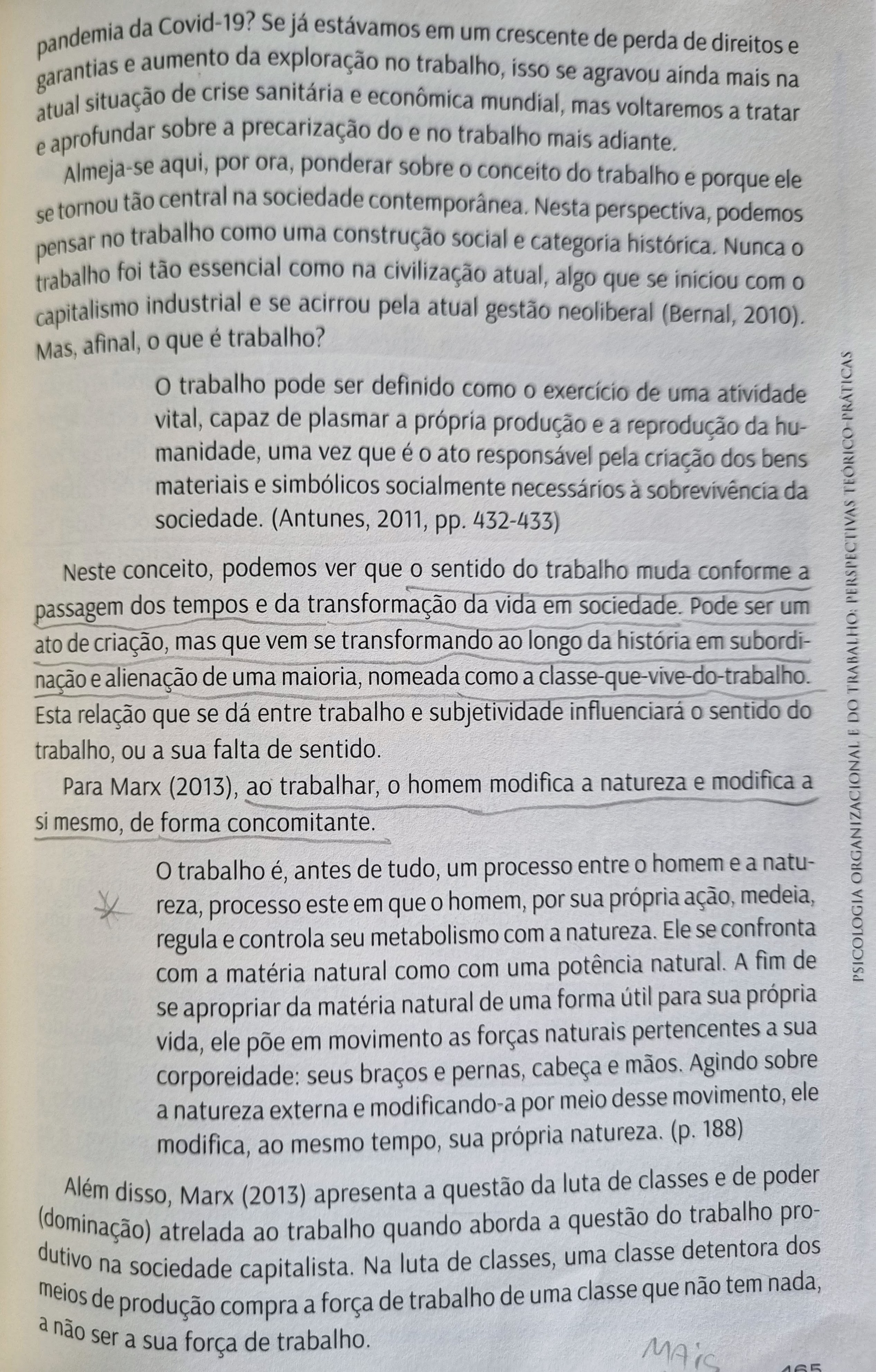 <p>pandemia da Covid-19? Se já estávamos em um crescente de perda de direitos e garantias e aumento da exploração no trabalho, isso se agravou ainda mais na atual situação de crise sanitária e econômica mundial, mas voltaremos a tratar e aprofundar sobre a precarização do e no trabalho mais Almeja-se aqui, por ora, ponderar sobre conceito do trabalho e porque ele se tornou tão central na sociedade Nesta perspectiva, podemos pensar no trabalho como uma construção social e categoria Nunca trabalho foi tão essencial como na civilização atual, algo que se iniciou com capitalismo industrial e se acirrou pela atual gestão neoliberal (Bernal, 2010). Mas, afinal, o que é trabalho? o trabalho pode ser definido como exercício de uma atividade vital, capaz de plasmar a própria produção e a reprodução da hu- manidade, uma vez que é o ato responsável pela criação dos bens materiais e simbólicos socialmente necessários à sobrevivência da sociedade. (Antunes, 2011, pp. 432-433) Neste conceito, podemos ver que sentido do trabalho muda conforme a passagem dos tempos e da transformação da vida em sociedade. Pode ser um ato de criação, mas que vem se transformando ao longo da história em subordi- nação e alienação de uma maioria, nomeada como a Esta relação que se dá entre trabalho e subjetividade influenciará sentido do trabalho, ou a sua falta de sentido. Para Marx (2013), ao trabalhar, homem modifica a natureza e modifica a si mesmo, de forma concomitante. trabalho é, antes de tudo, um processo entre o homem e a natu- reza, processo este em que homem, por sua própria ação, medeia, regula e controla seu metabolismo com a natureza. Ele se confronta com a matéria natural como com uma potência natural. A fim de se apropriar da matéria natural de uma forma útil para sua própria vida, ele em movimento as forças naturais pertencentes a sua corporeidade: seus braços e pernas, cabeça e mãos. Agindo sobre a natureza externa e modificando-a por meio desse movimento, ele modifica, ao mesmo tempo, sua própria natureza. (p. 188) Além disso, Marx (2013) apresenta a questão da luta de classes e de poder (dominação) atrelada ao trabalho quando aborda a questão do trabalho pro- dutivo na sociedade capitalista. Na luta de classes, uma classe detentora dos meios de produção compra a força de trabalho de uma classe que não tem nada, a não ser a sua força de trabalho.</p>