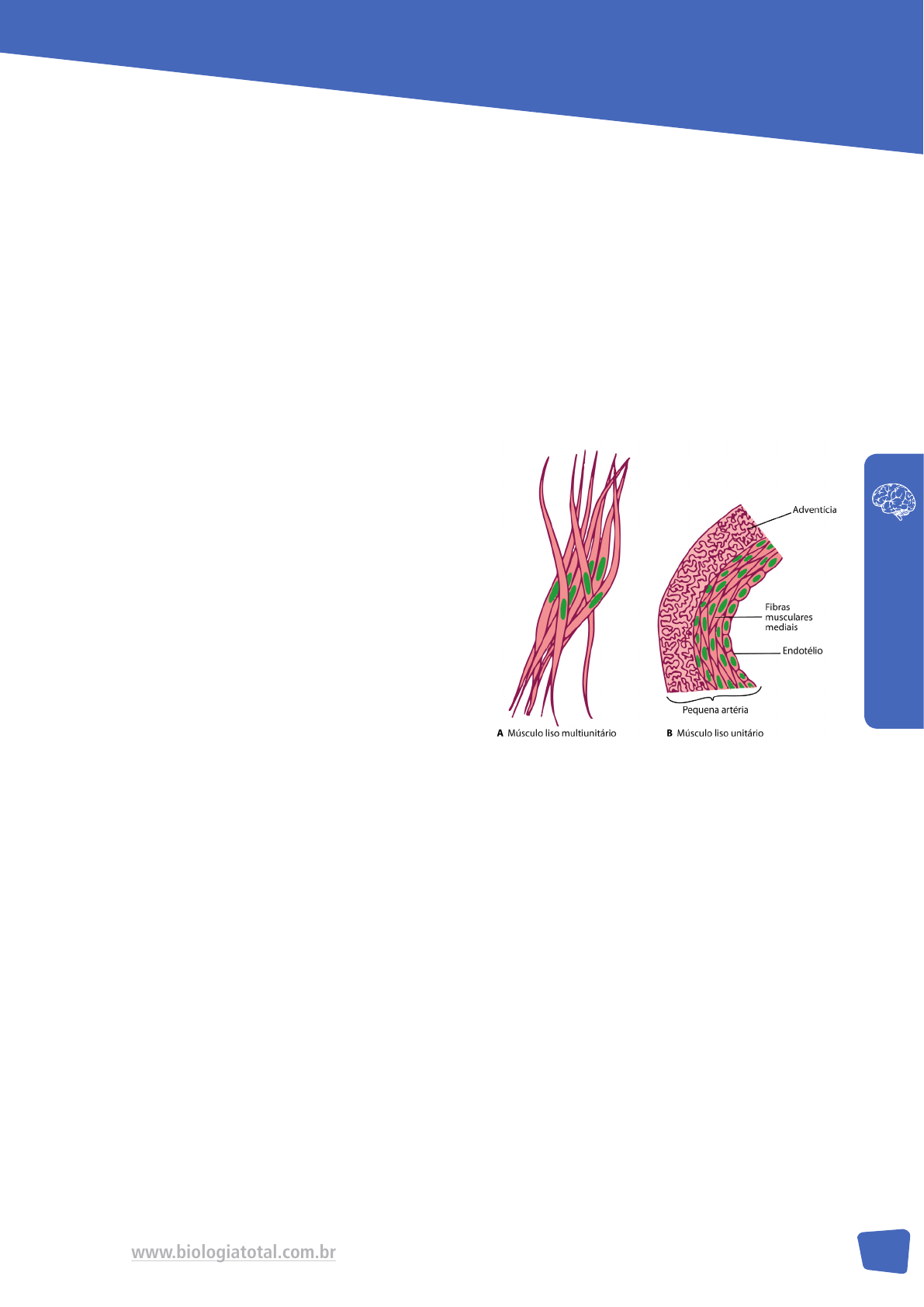 <p>19www.biologiatotal.com.br</p><p>FIS</p><p>IO</p><p>LO</p><p>GI</p><p>A</p><p>HU</p><p>MA</p><p>NA</p><p>CONTRAÇÃO DO MÚSCULO LISO</p><p>O músculo liso é composto por fibras bem</p><p>menores, tanto em comprimento quanto em</p><p>espessura, quando comparado com o músculo</p><p>esquelético. Suas fibras tem diâmetro de 1 a</p><p>5 micrômetros e de 20 a 500 micrômetros de</p><p>comprimento. Embora as fibras dos músculos</p><p>lisos estejam organizadas de forma bastante</p><p>diferente do que as do músculo esquelético,</p><p>as forças que promovem a interação entre os</p><p>filamentos de miosina e actina para gerar a</p><p>contração são as mesmas.</p><p>TIPOS DE MÚSCULO LISO</p><p>As características como dimensões físicas,</p><p>organização em feixes ou folhetos, resposta a</p><p>diferentes estímulos, característica da inervação</p><p>e função, varia nos músculos lisos de acordo com</p><p>órgão que ele compõe. Ele é classificado em dois</p><p>grandes grupos:</p><p>MÚSCULO LISO MULTIUNITÁRIO: formado</p><p>por fibras musculares separadas que operam</p><p>independentemente umas das outras. Essas fibras</p><p>podem ser inervadas por uma única terminação</p><p>nervosa. Elas tem a superfície isolada por uma</p><p>camada composta de colágeno e glicoproteínas.</p><p>O controle das fibras do músculo liso multiunitário</p><p>é exercido principalmente por sinais nervosos. O</p><p>músculo ciliar do olho, o músculo da íris do olho</p><p>e os músculos piloeretores, que causam a ereção</p><p>dos pelos, são exemplos desse tipo de músculo.</p><p>MÚSCULO LISO UNITÁRIO: Quando um grupo</p><p>de centenas a milhares de fibras contraem</p><p>juntas, como uma unidade, dizemos que são</p><p>pertencentes à classificação de músculo liso</p><p>unitário. As fibras estão organizadas em feixes</p><p>e suas membranas celulares estão aderidas</p><p>entre si, portanto, a força gerada por uma</p><p>fibra muscular pode ser repassada para outra.</p><p>Essas membranas celulares são ligadas por</p><p>muitas junções comunicantes o que permite a</p><p>livre passagem de íons de uma célula para a</p><p>seguinte e então o potencial de ação ou fluxo</p><p>de íons passe de uma fibra para a seguinte, isto</p><p>possibilita que elas se contraiam em conjunto.</p><p>Este tipo de músculo também pode ser chamado</p><p>de sincicial e visceral, pois é encontrado na</p><p>parede da maioria das vísceras, como intestino,</p><p>ductos biliares, útero e muitos vasos sanguíneos.</p><p>CONTRAÇÃO DO MÚSCULO LISO</p><p>A organização física do músculo liso apresenta</p><p>um grande número de filamentos de actina</p><p>ligados a corpos densos. Alguns destes estão</p><p>ligados à membrana celular e outros ficam</p><p>dispersos no interior da célula. Pontes de</p><p>proteínas intercelulares se conectam a alguns</p><p>corpos densos o que permite que a força</p><p>de contração aconteça entre uma célula e</p><p>outra. Entre os filamentos de actina estão</p><p>os filamentos de miosina. As extremidades</p><p>dos filamentos de miosina que irradiam dos</p><p>corpos densos se superpõem a um filamento de</p><p>miosina. Os corpos densos, no músculo liso, tem</p><p>função semelhante aos discos Z, no músculo</p><p>esquelético. No músculo liso a maioria dos</p><p>filamentos de miosina tem pontes cruzadas com</p><p>20</p><p>FIS</p><p>IO</p><p>LO</p><p>GI</p><p>A</p><p>HU</p><p>MA</p><p>NA</p><p>“polarização lateral”, isso quer dizer que, elas</p><p>estão organizadas de modo que as pontes de</p><p>um lado dobram em uma direção e as do outro</p><p>lado dobram na direção oposta. Dessa forma, a</p><p>miosina puxa um filamento de actina de cada</p><p>lado, mas em direções opostas. Como resultado,</p><p>as células do músculo liso conseguem se contrair</p><p>em até 80% do seu comprimento, muito mais</p><p>que o músculo esquelético.</p><p>REGULAÇÃO DA CONTRAÇÃO</p><p>PELOS ÍONS CÁLCIO</p><p>O primeiro estímulo necessário para o início</p><p>da contração muscular lisa, assim como para</p><p>a esquelética, é o aumento intracelular de</p><p>íons cálcio. Este aumento pode acontecer por</p><p>estimulação nervosa, hormonal, estiramento</p><p>da fibra ou alteração química na fibra. A</p><p>proteína reguladora das células musculares</p><p>lisas é a calmodulina e ela inicia a contração</p><p>ativando as pontes cruzadas da miosina. A</p><p>partir deste estímulo os íons cálcio se ligam à</p><p>proteína calmodulina. O complexo formado</p><p>por calmodulina e cálcio ativa a miosina</p><p>quinase, uma enzima fosforiladora, e fosforila</p><p>uma das cadeias leves de cada miosina.</p><p>Esta cadeia é chamada cadeia reguladora, e</p><p>quando fosforilada permite que a cabeça se</p><p>ligue repetidamente ao filamento de actina</p><p>promovendo trações interruptas, que levam à</p><p>contração muscular. Se ela não está fosforilada</p><p>a conexão e desconexão da cabeça da miosina</p><p>com o filamento de actina não acontece. Assim</p><p>que a concentração de íon cálcio diminui abaixo</p><p>de um nível crítico, a ativação cessa. A cabeça</p><p>da miosina é desfosforilada por outra enzima</p><p>chamada fosfatase da miosina. Com isso, o ciclo</p><p>é interrompido e a contração para. Podemos</p><p>concluir então que o tempo para o relaxamento</p><p>da contração é regulado pela quantidade dessa</p><p>enzima ativa na célula.</p><p>Externo Ca++</p><p>Ca++Ca++RS</p><p>Ca++</p><p>Calmodulina</p><p>- Calmodulina</p><p>Fosfatase</p><p>Ativa</p><p>MLCK</p><p>Inativa</p><p>MLCK</p><p>MLC</p><p>Desfosforilada</p><p>MLC</p><p>Fosforilada</p><p>RelaxamentoContração</p><p>JUNÇÕES NEUROMUSCULARES</p><p>DO MÚSCULO LISO</p><p>Fibras nervosas autônomas inervam o músculo</p><p>liso. Elas se ramificam do topo de um feixe de</p><p>fibras musculares e não fazem contato direto</p><p>com a membrana das fibras musculares lisas.</p