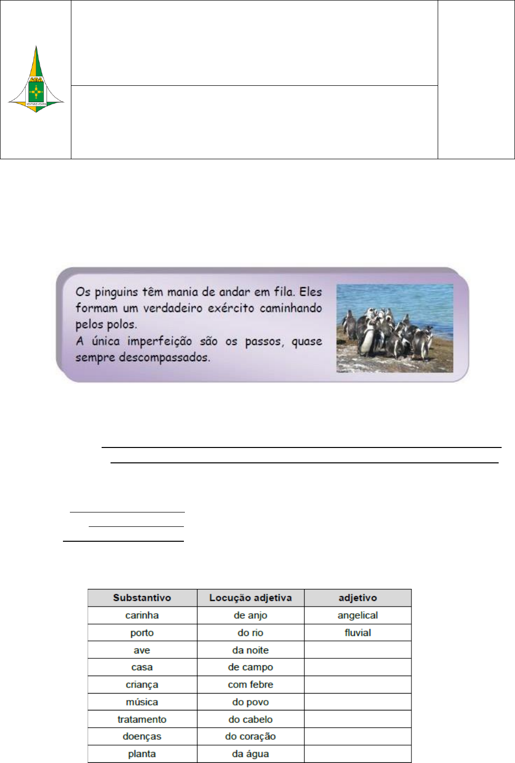 <p>GOVERNO DO DISTRITO FEDERAL</p><p>SECRETARIA DE ESTADO DE EDUCAÇÃO DO DISTRITO FEDERAL</p><p>COORDENAÇÃO REGIONAL DE ENSINO DO PLANO PILOTO</p><p>CENTRO DE ENSINO FUNDAMENTAL 07 DE BRASÍLIA</p><p>CEF7</p><p>Brasília</p><p>Estudante: ______________________________________________________________</p><p>Professor/a: ___________________________ Disciplina: _________________________</p><p>Ano/turma: ____________________ Bimestre: 3º bimestre Data:____/____/ 2024</p><p>ESTUDO DIRIGIDO DE LÍNGUA PORTUESA - 6º ANO</p><p>1. Leia.</p><p>De acordo com a ilustração, escreva o substantivo que dá nome ao animal citado no texto e uma</p><p>palavra que atribua característica a ele.</p><p>• Substantivo:</p><p>• Característica:</p><p>2. Complete com as características dos substantivos retirados do texto:</p><p>exército:</p><p>imperfeição:</p><p>passos:</p><p>3. Observe o quadro abaixo e complete-o com os adjetivos adequados. Veja os exemplos.</p><p>4. Leia a tirinha abaixo:</p><p>a) Que palavras provocam a confusão no primeiro quadrinho? Explique.</p><p>___________________________________________________________________________________</p><p>___________________________________________________________________________________</p><p>___________________________________________________________________________________</p><p>b) Dê o significado de cada uma dessas palavras.</p><p>__________________________________________________________________________________</p><p>__________________________________________________________________________________</p><p>__________________________________________________________________________________</p><p>c) Copie da tirinha os dois adjetivos que indicam nacionalidade, lugar de origem.</p><p>___________________________________________________________________________________</p><p>5. Leia as frases abaixo, circule os artigos e classifique-os colocando:</p><p>(A) artigo definido (B) artigo indefinido</p><p>a) Uns alunos chegaram mais cedo à escola ( ).</p><p>b) O bem sempre vencerá o mal ( ).</p><p>c) Preciso de uma explicação para o fato ( ).</p><p>d) Chegaram as encomendas ( ).</p><p>e) Nesta loja vendem-se uns artigos importados ( ).</p><p>6. Faça 02 orações contendo artigo definido e 02 orações contendo artigo indefinido.</p><p>__________________________________________________________________________________</p><p>__________________________________________________________________________________</p><p>__________________________________________________________________________________</p><p>__________________________________________________________________________________</p><p>7. Entre parênteses, aparecem dois pronomes demonstrativos. Escolha o que preenche corretamente</p><p>a lacuna:</p><p>a) Não me preocupa ____________ mancha que tenho no rosto. (esta – essa)</p><p>b) Marcela, é bom ____________ livro que está com você? (este – esse)</p><p>c) Ricardo, é seu ____________ caderno aí perto de sua carteira? (esse – aquele)</p><p>d) _________ técnico aqui ao meu lado vai explicar o funcionamento da máquina. (este – esse)</p><p>e) Tatiana, ____________ guarda-chuva lá no canto é seu? (esse – aquele)</p><p>f) Senhores jurados, ____________ documento aqui é a maior prova da inocência! (este – esse)</p><p>8. Classifique o pronome destacado de acordo com os seguintes códigos:</p><p>( 1 ) pessoal</p><p>( 2 ) possessivo</p><p>( 3 ) demonstrativo</p><p>( 4 ) indefinido</p><p>( 5 ) interrogativo</p><p>a) ( ) Quem entende essa criança?</p><p>b) ( ) Você já leu este livro?</p><p>c) ( ) Qual é a atriz principal da peça?</p><p>d) ( ) Estes estudantes são muito unidos.</p><p>e) ( ) Ela sempre gostou de ler.</p><p>f) ( ) Nosso povo está despertando.</p><p>g) ( ) Aquele jornal é bom?</p><p>h) ( ) Ninguém vai enfrentar esse problema?</p><p>9. Leia o trecho:</p><p>Encontraram-se na área de serviço. Cada um com seu pacote de lixo. É a primeira vez que se falam.</p><p>- Bom dia!</p><p>- Bom dia!</p><p>- A senhora é do 610.</p><p>- E o senhor do 612.</p><p>- É...</p><p>- Me chame de você.</p><p>- A senhora.... ou melhor, você não tem família?</p><p>- Tenho. Mas não aqui.</p><p>a) No diálogo, como a mulher gostaria de ser tratada? Por quê?</p><p>_________________________________________________________________________________</p><p>_________________________________________________________________________________</p><p>b) Assinale a alternativa que mostra o que ocorre quando é trocado o pronome SENHORA pelo</p><p>pronome VOCÊ.</p><p>( ) A pessoa torna-se mais legal.</p><p>( ) A pessoa fica mais nova.</p><p>( ) Cria-se maior proximidade entre as pessoas.</p><p>( ) A popularidade cresce.</p>