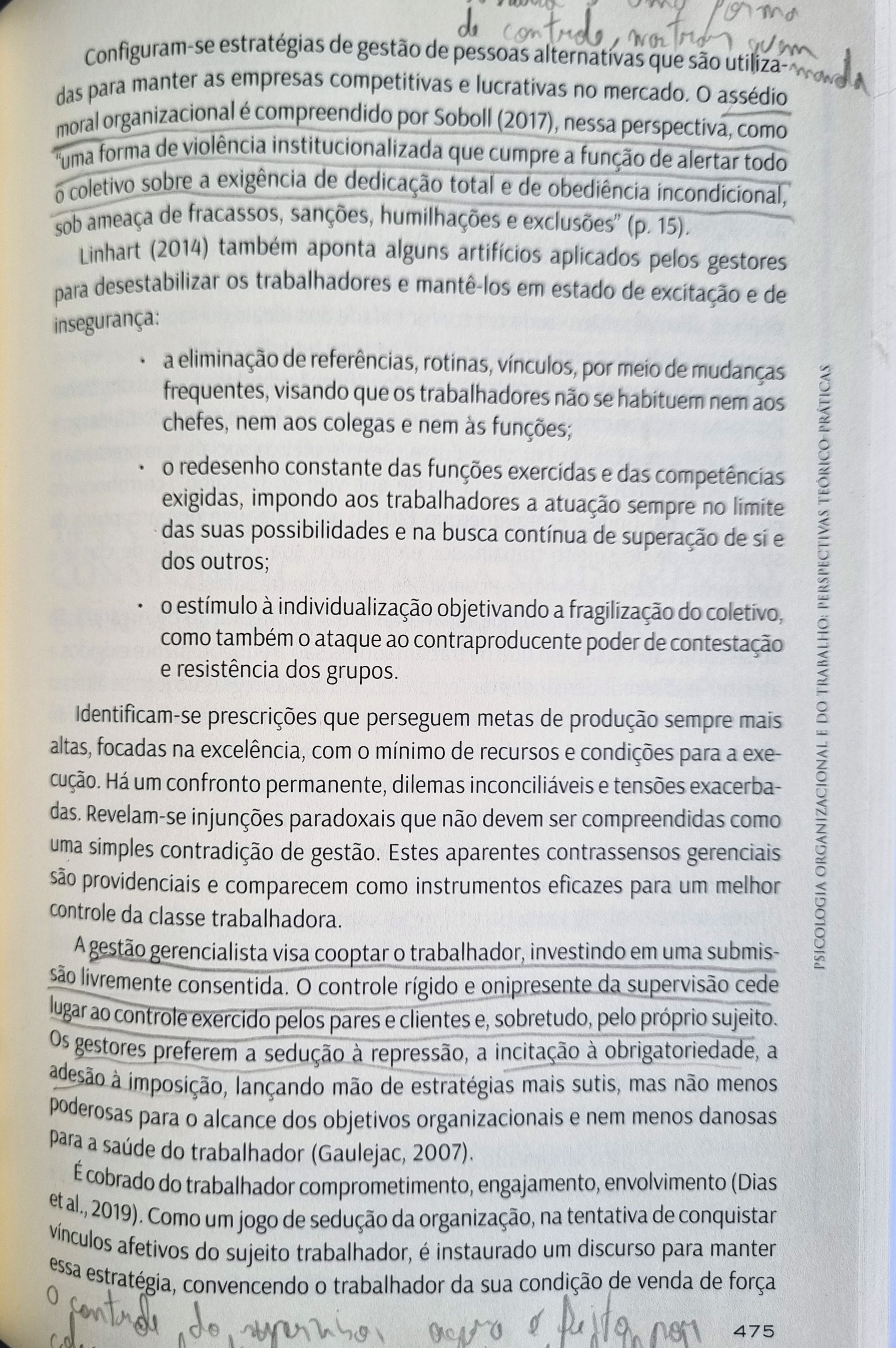 <p>estratégias de gestão de pessoas alternativas que são das para manter as empresas competitivas e lucrativas no o assédio moral organizacional é compreendido por Soboll (2017), nessa perspectiva, como forma de violência institucionalizada que cumpre a função de alertar todo 0 coletivo sobre a exigência de dedicação total e de obediência incondicional, sob ameaça de fracassos, sanções, humilhações e exclusões" (p. Linhart (2014) também aponta alguns artifícios aplicados pelos gestores para desestabilizar os trabalhadores e mantê-los em estado de excitação e de a eliminação de referências, rotinas, vínculos, por meio de mudanças frequentes, visando que os trabalhadores não se habituem nem aos chefes, nem aos colegas e nem às funções; o redesenho constante das funções exercidas e das competências exigidas, impondo aos trabalhadores a atuação sempre no limite das suas possibilidades e na busca contínua de superação de si e dos outros; estímulo à individualização objetivando a fragilização do coletivo, como também o ataque ao contraproducente poder de contestação e resistência dos grupos. Identificam-se prescrições que perseguem metas de produção sempre mais DO altas, focadas na excelência, com mínimo de recursos e condições para a exe- Há um confronto permanente, dilemas inconciliáveis e tensões exacerba- Revelam-se injunções paradoxais que não devem ser compreendidas como uma simples contradição de gestão. Estes aparentes contrassensos gerenciais são providenciais e comparecem como instrumentos eficazes para um melhor controle da classe trabalhadora. A gestão gerencialista visa cooptar o trabalhador, investindo em uma submis- são livremente consentida. O controle rígido e onipresente da supervisão cede lugar ao controle exercido pelos pares e clientes e, sobretudo, pelo próprio sujeito. Os gestores preferem a sedução à repressão, a incitação à obrigatoriedade, a adesão à imposição, lançando mão de estratégias mais sutis, mas não menos poderosas para o alcance dos objetivos organizacionais e nem menos danosas para a saúde do trabalhador (Gaulejac, 2007). É cobrado do trabalhador comprometimento, engajamento, envolvimento (Dias 2019). Como um jogo de sedução da organização, na tentativa de conquistar vinculos afetivos do sujeito trabalhador, é instaurado um discurso para manter 0 essa convencendo o trabalhador da sua condição de venda de força 475</p>