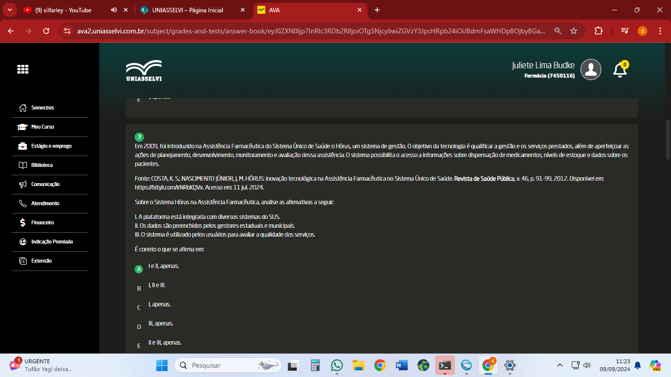 <p>(9) silfarley YouTube UNIASSELVI Página Inicial AVA + X C Juliete Lima Budke 1 UNIASSELVI Farmácia (7450116) Semestres Meu Curso 3 emprego Em 2009, foi introduzido na Assistência Farmacêutica do Sistema de Saúde um sistema de gestão. objetivo da tecnologia é qualificar a gestão e OS serviços prestados, além de as ações de planejamento, desenvolvimento, monitoramento e avaliação dessa assistência sistema possibilita acesso a informações sobre dispensação de medicamentos níveis de estoque e dados sobre OS Bibiloteca pacientes. Fonte: COSTA K NASCIMENTO I M inovação tecnológica na Assistência Farmacêutica no Sistema Único de Saúde Revista de Saúde 46 2012. Disponível em: Comunicação Acesso 11 jul. 2024. Atendimento Sobre Sistema na Assistência analise as afirmativas a A plataforma está integrada com diversos sistemas do SUS. $ Financeiro Os dados são preenchidos pelos gestores estaduais e municipais III. sistema é utilizado pelos usuários para avaliar a qualidade dos I Indicação É correto que se afirma em + Extensão le II, III. L apenas. D III, apenas. E III URGENTE 11:23 Pesquisar ^ Tufão Yagi deixa.. 09/09/2024</p>
