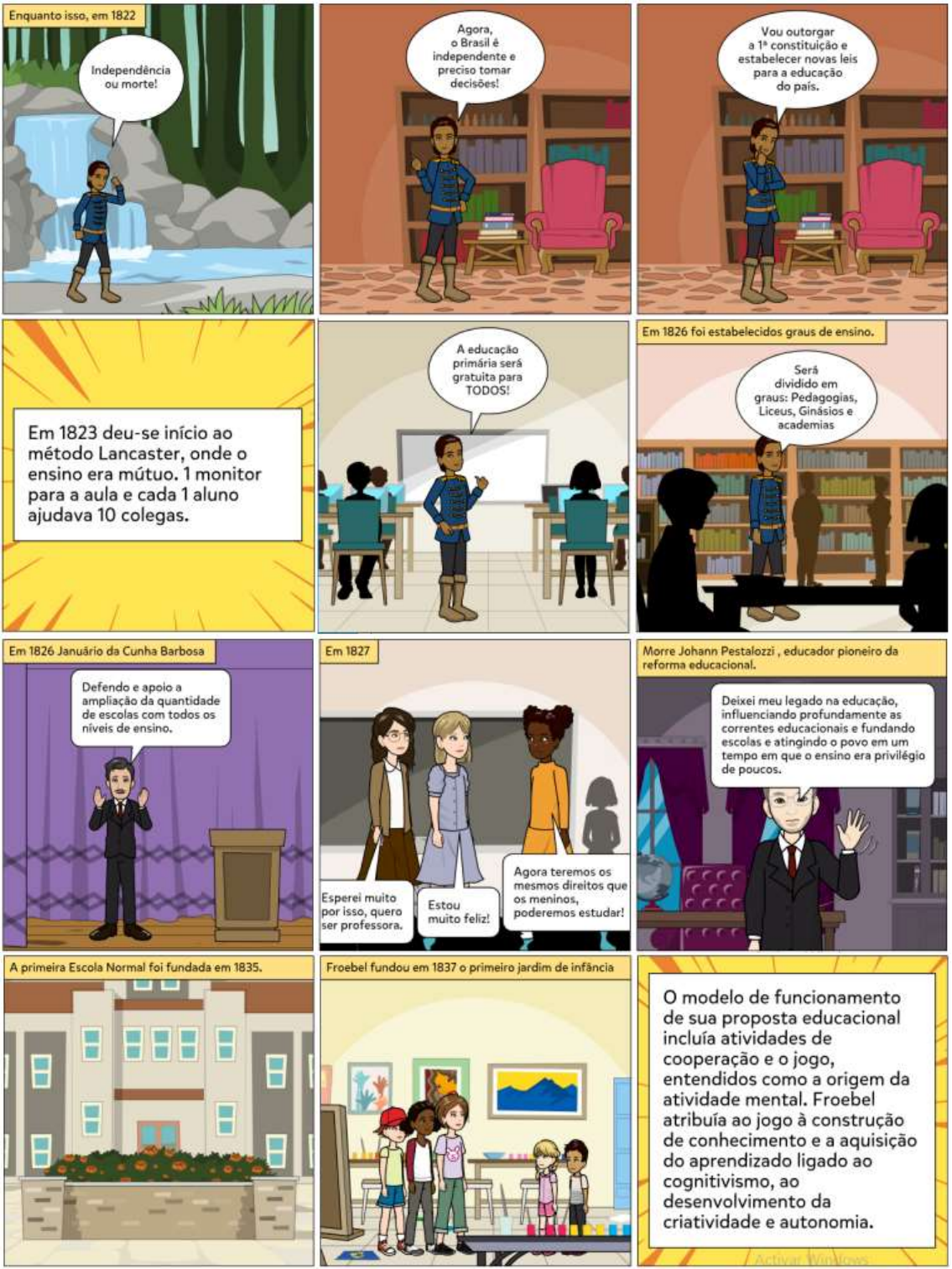 <p>Enquanto isso, em 1822 Agora, Vou outorgar o Brasil é a constituição e independente e estabelecer novas leis Independência preciso tomar para a educação ou morte! decisões! do país. Em 1826 foi estabelecidos graus de ensino. A educação será gratuita para dividido em TODOS! graus: Pedagogias, Liceus, Ginásios e Em 1823 deu-se início ao academias método Lancaster, onde o ensino era mútuo. 1 monitor para a aula e cada 1 aluno ajudava 10 colegas. Em 1826 da Cunha Barbosa Em 1827 Morre Johann educador pioneiro da reforma educacional. Defendo e apoio a ampliação da quantidade Deixei meu legado na educação, de escolas com todos os influenciando profundamente as níveis de correntes educacionais e fundando escolas e atingindo o povo em um tempo em que o ensino era privilégio de poucos. Agora teremos os mesmos direitos que Esperei muito Estou os meninos, por isso, quero muito feliz! poderemos estudar! ser professora. A primeira Escola Normal foi fundada em 1835. Froebel fundou em 1837 primeiro jardim de o modelo de funcionamento de sua proposta educacional incluía atividades de cooperação e jogo, entendidos como a origem da atividade mental. Froebel atribuía ao jogo à construção de conhecimento e a aquisição do aprendizado ligado ao cognitivismo, ao desenvolvimento da criatividade e autonomia.</p><p>Enfatizou o lúdico e a Para Froebel as crianças eram Para ele a educação deve musicalização, elaborou como plantinhas e canções e jogos para educar professor basear-se na evolução natural jardineiro. das atividades da criança. sensações e emoções, enfatizou o valor educativo da objetivo do ensino é sempre atividade manual, extrair mais do homem do que colocar mais e mais dentro confeccionou brinquedos para a aprendizagem da aritmética dele e criança não deve ser iniciada em nenhum novo e da geometria, além de propor que as atividades assunto enquanto não estiver educativas madura para ele. o verdadeiro desenvolvimento advém de conversas e poesias e o cultivo da horta pelas crianças. atividades espontâneas. No Rio de Janeiro, em 1837 era inaugurado Colégio D. Este um resumo do ensino no Pedro Informa que foi criado o Ministério de instrução pública, onde criaremos escolas técnicas Tchau e desenvolveremos o ensino pessoal! profissionalizante. DAYANA, FABIANA, PAMELA, SILVIA E SUZANA</p>