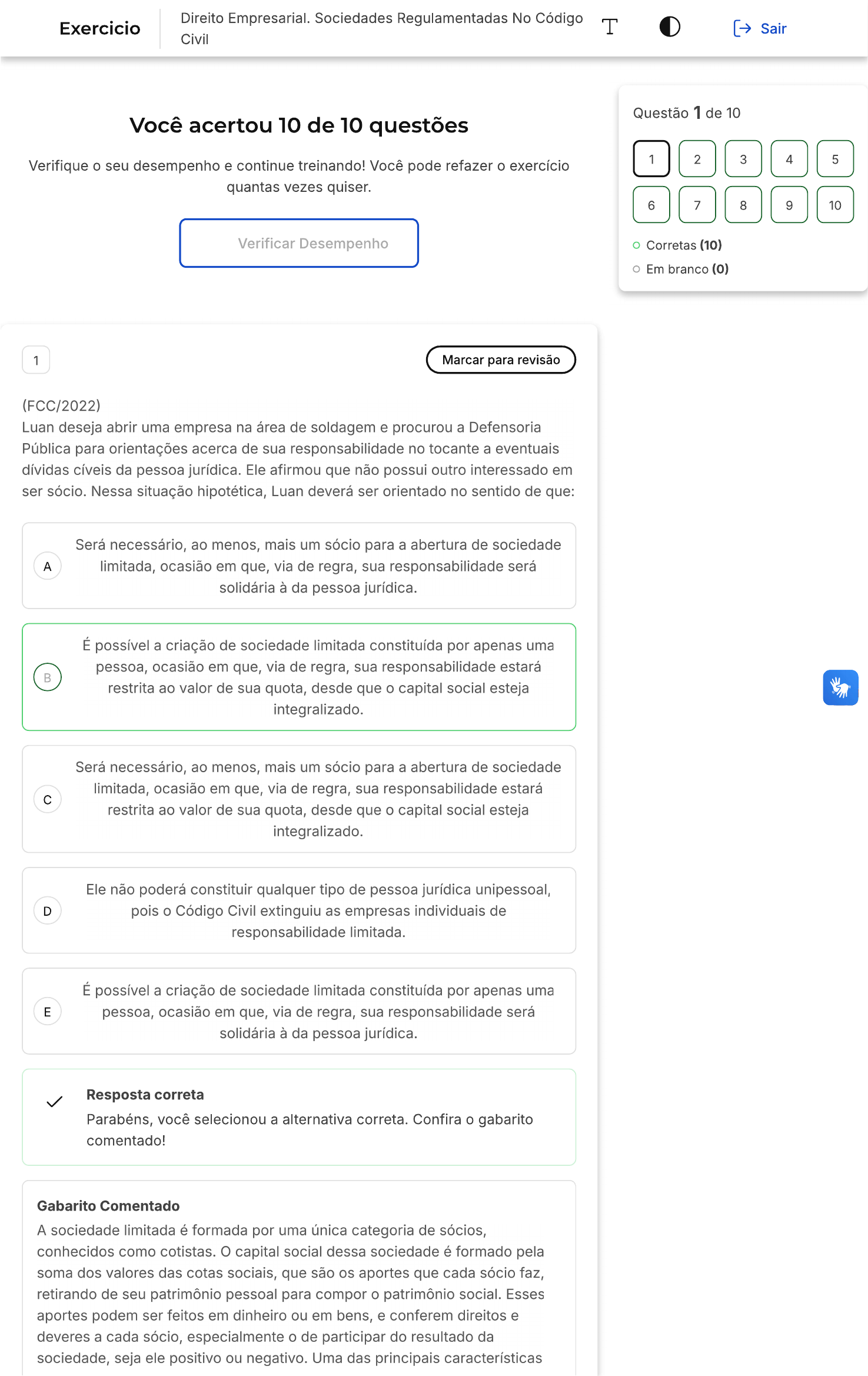 <p>Direito Empresarial. Sociedades Regulamentadas No Código Exercicio T Sair Civil Questão 1 de 10 Você acertou 10 de 10 questões 1 2 3 4 5 Verifique o seu desempenho e continue treinando! Você pode refazer o exercício quantas vezes quiser. 6 7 8 9 10 Verificar Desempenho Corretas (10) 1 Marcar para revisão (FCC/2022) Luan deseja abrir uma empresa na área de soldagem e procurou a Defensoria Pública para orientações acerca de sua responsabilidade no tocante a eventuais dívidas cíveis da pessoa jurídica. Ele afirmou que não possui outro interessado em ser sócio. Nessa situação hipotética, Luan deverá ser orientado no sentido de que: Será necessário, ao menos, mais um sócio para a abertura de sociedade A limitada, ocasião em que, via de regra, sua responsabilidade será solidária à da pessoa jurídica. É possível a criação de sociedade limitada constituída por apenas uma pessoa, ocasião em que, via de regra, sua responsabilidade estará B restrita ao valor de sua quota, desde que o capital social esteja integralizado. Será necessário, ao menos, mais um sócio para a abertura de sociedade limitada, ocasião em que, via de regra, sua responsabilidade estará C restrita ao valor de sua quota, desde que o capital social esteja integralizado. Ele não poderá constituir qualquer tipo de pessoa jurídica unipessoal, D pois o Código Civil extinguiu as empresas individuais de responsabilidade limitada. É possível a criação de sociedade limitada constituída por apenas uma E pessoa, ocasião em que, via de regra, sua responsabilidade será solidária à da pessoa jurídica. Resposta correta Parabéns, você selecionou a alternativa correta. Confira o gabarito comentado! Gabarito Comentado A sociedade limitada é formada por uma única categoria de sócios, conhecidos como cotistas. capital social dessa sociedade é formado pela soma dos valores das cotas que são os aportes que cada sócio faz, retirando de seu patrimônio pessoal para compor o patrimônio social. Esses aportes podem ser feitos em dinheiro ou em bens, e conferem direitos e deveres a cada sócio especialmente o de participar do resultado da sociedade, seja ele positivo ou negativo. Uma das principais características</p><p>dessa sociedade, que é o modelo mais utilizado no Brasil, é a limitação da responsabilidade de cada sócio ao valor de suas cotas na sociedade, embora todos sejam solidariamente responsáveis pela integralização do capital social. Por isso, também é chamada de sociedade por cotas de responsabilidade limitada. Com a Lei de Liberdade Econômica (LLE, Lei 13.874/19), foi oficializada no Brasil a existência da "sociedade de um". Isso significa que o empresário não precisa mais buscar um sócio apenas para constar no papel e abrir uma sociedade. Ele pode criar uma sociedade limitada ao capital social que for indicado e atuar por meio dela, sem a necessidade de terceiros. Portanto, no caso de Luan, é possível a criação de uma sociedade limitada constituída por apenas ele, e sua responsabilidade estará restrita ao valor de sua quota, desde que o capital social esteja integralizado. 2 Marcar para revisão Em relação à teoria da empresa, podemos dizer que: código comercial brasileiro não está mais em vigor, desde a publicação A do Código Civil de 2002 direito comercial perdeu a importância em razão das mudanças B trazidas pelo Código Civil de 2002 A teoria da empresa substituiu a teoria dos atos de comércio, C transferindo a ênfase da atividade comercial para as sociedades empresárias e não mais na figura do comerciante. A teoria da empresa reconhece que o principal ator das relações D econômicas é o comerciante que organiza a produção dos fatores e promove a circulação de riquezas A teoria da empresa reconhece que toda atividade econômica realizada é E uma atividade empresária pois produz lucro e gera riquezas. Resposta correta Parabéns, você selecionou a alternativa correta. Confira o gabarito comentado! Gabarito Comentado A alternativa correta é a C. A teoria da empresa substituiu a teoria dos atos de comércio, que era focada na figura do comerciante. Com a nova teoria, a ênfase passou a ser nas sociedades empresárias. Isso significa que o foco não está mais no indivíduo que realiza a atividade comercial, mas na organização que realiza essa atividade. Portanto, a teoria da empresa trouxe uma nova perspectiva para o direito comercial, focando na atividade empresarial como um todo, e não apenas nos atos individuais de comércio. 3 Marcar para revisão</p><p>Todo contrato social deve ser registrado na Junta Comercial ou no Registro Civil de Pessoas Jurídicas para produzir seus efeitos jurídicos, atribuindo capacidade jurídica às mesmas, com exceção: A Da Sociedade em conta de participação B Da Sociedade comum C Da Empresa Individual de responsabilidade limitada D Do Microempreendedor individual E Da Sociedade Simples Resposta correta você selecionou a alternativa correta. Confira o gabarito comentado! Gabarito Comentado A Sociedade em Conta de Participação (SCP) é uma exceção à regra de que todo contrato social deve ser registrado para produzir efeitos jurídicos. Isso ocorre porque a SCP é uma sociedade não personificada, ou seja, não tem personalidade jurídica própria e, portanto, não precisa ser registrada. A SCP é caracterizada pela participação de sócios que contribuem com bens ou serviços para a execução de determinado negócio, sem que haja a necessidade de registro do contrato social. Portanto, a alternativa correta é a "A". 4 Marcar para revisão Existem diversos tipos de arranjos possíveis para o desenvolvimento de uma atividade empresarial. Leia as assertivas abaixo identificando-as como verdadeiras ou falsas e depois marque a opção que contém a ordem correta: ( ) A atividade empresarial não pode ser exercida por nenhum tipo de servidor público, seja da esfera federal, estadual ou mun
