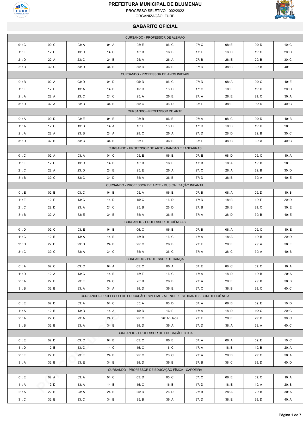 <p>pcimarkpci MjgwNDowMTRjOmNjODE6NDAyNTo3NDczOjE0ZTg6NDA4MzpkYTdi:V2VkLCAxMCBKdWwgMjAyNCAyMToxODowNSAtMDMwMA==</p><p>www.pciconcursos.com.br</p><p>PREFEITURA MUNICIPAL DE BLUMENAU</p><p>PROCESSO SELETIVO - 002/2022</p><p>ORGANIZAÇÃO: FURB</p><p>GABARITO OFICIAL</p><p>CURSANDO - PROFESSOR DE ALEMÃO</p><p>01: C 02: C 03: A 04: A 05: E 06: C 07: C 08: E 09: D 10: C</p><p>11: E 12: D 13: C 14: C 15: B 16: B 17: E 18: D 19: C 20: D</p><p>21: D 22: A 23: C 24: B 25: A 26: A 27: B 28: E 29: B 30: C</p><p>31: B 32: C 33: D 34: B 35: D 36: B 37: D 38: B 39: B 40: E</p><p>CURSANDO - PROFESSOR DE ANOS INICIAIS</p><p>01: B 02: A 03: D 04: D 05: D 06: C 07: D 08: A 09: C 10: E</p><p>11: E 12: E 13: A 14: B 15: D 16: D 17: C 18: E 19: D 20: D</p><p>21: A 22: A 23: C 24: C 25: A 26: E 27: A 28: E 29: C 30: A</p><p>31: D 32: A 33: B 34: B 35: C 36: D 37: E 38: E 39: D 40: C</p><p>CURSANDO - PROFESSOR DE ARTE</p><p>01: A 02: D 03: E 04: E 05: B 06: B 07: A 08: C 09: D 10: B</p><p>11: A 12: C 13: B 14: A 15: E 16: D 17: D 18: B 19: D 20: E</p><p>21: A 22: A 23: B 24: A 25: C 26: A 27: D 28: D 29: B 30: C</p><p>31: D 32: B 33: C 34: B 35: E 36: B 37: E 38: C 39: A 40: C</p><p>CURSANDO - PROFESSOR DE ARTE - BANDAS E FANFARRAS</p><p>01: C 02: A 03: A 04: C 05: E 06: E 07: E 08: D 09: C 10: A</p><p>11: E 12: D 13: C 14: B 15: B 16: E 17: B 18: A 19: B 20: E</p><p>21: C 22: A 23: D 24: E 25: E 26: A 27: C 28: A 29: B 30: D</p><p>31: B 32: C 33: C 34: D 35: A 36: B 37: D 38: B 39: A 40: E</p><p>CURSANDO - PROFESSOR DE ARTE - MUSICALIZAÇÃO INFANTIL</p><p>01: E 02: E 03: C 04: B 05: A 06: E 07: B 08: A 09: D 10: B</p><p>11: E 12: E 13: C 14: D 15: C 16: D 17: D 18: B 19: E 20: D</p><p>21: C 22: D 23: A 24: C 25: B 26: D 27: B 28: B 29: C 30: E</p><p>31: B 32: A 33: E 34: E 35: A 36: E 37: A 38: D 39: B 40: E</p><p>CURSANDO - PROFESSOR DE CIÊNCIAS</p><p>01: D 02: C 03: E 04: E 05: C 06: E 07: B 08: A 09: C 10: E</p><p>11: C 12: B 13: A 14: B 15: B 16: C 17: A 18: A 19: B 20: D</p><p>21: D 22: D 23: D 24: B 25: C 26: B 27: E 28: E 29: A 30: E</p><p>31: C 32: C 33: A 34: C 35: A 36: C 37: A 38: C 39: A 40: B</p><p>CURSANDO - PROFESSOR DE DANÇA</p><p>01: A 02: C 03: C 04: A 05: C 06: A 07: E 08: C 09: C 10: A</p><p>11: D 12: A 13: C 14: B 15: E 16: C 17: A 18: D 19: B 20: A</p><p>21: A 22: E 23: E 24: C 25: B 26: B 27: A 28: E 29: B 30: B</p><p>31: B 32: B 33: A 34: A 35: D 36: E 37: C 38: B 39: C 40: C</p><p>CURSANDO - PROFESSOR DE EDUCAÇÃO ESPECIAL - ATENDER ESTUDANTES COM DEFICIÊNCIA</p><p>01: E 02: D 03: A 04: C 05: A 06: D 07: A 08: B 09: E 10: D</p><p>11: A 12: B 13: B 14: A 15: D 16: E 17: A 18: D 19: C 20: C</p><p>21: A 22: C 23: A 24: C 25: C 26: Anulada 27: E 28: E 29: D 30: C</p><p>31: B 32: B 33: A 34: E 35: D 36: A 37: D 38: A 39: A 40: C</p><p>CURSANDO - PROFESSOR DE EDUCAÇÃO FÍSICA</p><p>01: E 02: D 03: C 04: B 05: C 06: E 07: A 08: A 09: E 10: C</p><p>11: D 12: E 13: C 14: C 15: C 16: C 17: A 18: B 19: B 20: A</p><p>21: E 22: E 23: E 24: B 25: C 26: C 27: A 28: B 29: C 30: A</p><p>31: A 32: B 33: E 34: E 35: D 36: B 37: B 38: C 39: D 40: D</p><p>CURSANDO - PROFESSOR DE EDUCAÇÃO FÍSICA - CAPOEIRA</p><p>01: E 02: A 03: A 04: C 05: D 06: C 07: C 08: E 09: C 10: A</p><p>11: A 12: D 13: A 14: E 15: C 16: B 17: D 18: E 19: A 20: B</p><p>21: A 22: B 23: A 24: B 25: D 26: D 27: B 28: A 29: B 30: A</p><p>31: C 32: E 33: C 34: B 35: B 36: A 37: D 38: E 39: D 40: A</p><p>Página 1 de 7</p><p>pcimarkpci MjgwNDowMTRjOmNjODE6NDAyNTo3NDczOjE0ZTg6NDA4MzpkYTdi:V2VkLCAxMCBKdWwgMjAyNCAyMToxODowNSAtMDMwMA==</p><p>www.pciconcursos.com.br</p><p>PREFEITURA MUNICIPAL DE BLUMENAU</p><p>PROCESSO SELETIVO - 002/2022</p><p>ORGANIZAÇÃO: FURB</p><p>GABARITO OFICIAL</p><p>CURSANDO - PROFESSOR DE EDUCAÇÃO FÍSICA - JUDÔ</p><p>01: E 02: D 03: B 04: A 05: B 06: C 07: E 08: B 09: D 10: C</p><p>11: B 12: E 13: D 14: D 15: D 16: B 17: B 18: A 19: B 20: B</p><p>21: D 22: D 23: B 24: C 25: B 26: E 27: C 28: A 29: D 30: C</p><p>31: E 32: C 33: A 34: A 35: E 36: B 37: D 38: B 39: B 40: D</p><p>CURSANDO - PROFESSOR DE EDUCAÇÃO FÍSICA - KARATÊ</p><p>01: D 02: E 03: E 04: C 05: D 06: B 07: A 08: A 09: A 10: E</p><p>11: C 12: E 13: A 14: D 15: C 16: B 17: B 18: C 19: E 20: C</p><p>21: A 22: C 23: E 24: C 25: B 26: D 27: B 28: A 29: C 30: E</p><p>31: D 32: E 33: B 34: B 35: D 36: D 37: B 38: A 39: B 40: C</p><p>CURSANDO - PROFESSOR DE EDUCAÇÃO FÍSICA - LINGUAGEM DO MOVIMENTO</p><p>01: D 02: A 03: D 04: B 05: D 06: D 07: A 08: D 09: B 10: B</p><p>11: E 12: C 13: E 14: C 15: E 16: A 17: B 18: E 19: D 20: C</p><p>21: D 22: D 23: E 24: A 25: A 26: A 27: D 28: C 29: C 30: C</p><p>31: A 32: E 33: C 34: E 35: E 36: D 37: C 38: D 39: C 40: C</p><p>CURSANDO - PROFESSOR DE EDUCAÇÃO FÍSICA - PARADESPORTO ESCOLAR</p><p>01: E 02: D 03: A 04: D 05: A 06: E 07: E 08: B 09: C 10: C</p><p>11: B 12: C 13: E 14: E 15: A 16: E 17: D 18: E 19: E 20: A</p><p>21: C 22: A 23: B 24: D 25: C 26: A 27: A 28: B 29: C 30: C</p><p>31: A 32: A 33: D 34: A 35: B 36: A 37: C 38: E 39: B 40: B</p><p>CURSANDO - PROFESSOR DE EDUCAÇÃO INFANTIL</p><p>01: B 02: E 03: E 04: C 05: C 06: E 07: E 08: B 09: B 10: B</p><p>11: A 12: A 13: C 14: A 15: B 16: A 17: D 18: C 19: E 20: E</p><p>21: B 22: C 23: C 24: A 25: E 26: A 27: E 28: A 29: D 30: E</p><p>31: A 32: C 33: A 34: E 35: C 36: A 37: E 38: Anulada 39: C 40: E</p><p>CURSANDO - PROFESSOR DE ENSINO RELIGIOSO</p><p>01: E 02: B 03: B 04: C 05: B 06: C 07: C 08: A 09: D 10: A</p><p>11: E 12: C 13: C 14: B 15: D 16: B 17: E 18: A 19: D 20: A</p><p>21: D 22: B 23: D 24: B 25: E 26: B 27: E 28: B 29: D 30: D</p><p>31: A 32: C 33: A 34: E 35: C 36: C 37: C 38: E 39: A 40: C</p><p>CURSANDO - PROFESSOR DE GEOGRAFIA</p><p>01: E 02: C 03: A 04: D 05: D 06: C 07: B 08: B 09: B 10: B</p><p>11: B 12: E 13: D 14: B 15: B 16: A 17: D 18: A 19: E 20: B</p><p>21: B 22: C 23: A 24: A 25: E 26: A 27: E 28: D 29: B 30: E</p><p>31: C 32: E 33: D 34: E 35: C 36: A 37: E 38: B 39: C 40: B</p><p>CURSANDO - PROFESSOR DE HISTÓRI