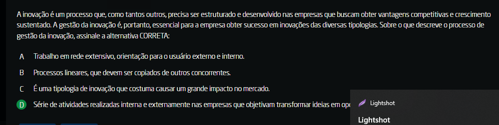 <p>A inovação é um processo que, como tantos outros, precisa ser estruturado e desenvolvido nas empresas que buscam obter vantagens competitivas e crescimento sustentado. A gestão da inovação é portanto, essencial para a empresa obter sucesso em inovações das diversas tipologias. Sobre que descreve processo de gestão da inovação, assinale a alternativa CORRETA: A Trabalho em rede extensivo, orientação para usuário externo e interno. B Processos lineares, que devem ser copiados de outros concorrentes. C É uma tipologia de inovação que costuma causar um grande impacto no mercado. D Série de atividades realizadas interna e externamente nas empresas que transformar ideias em op Lightshot Lightshot</p>