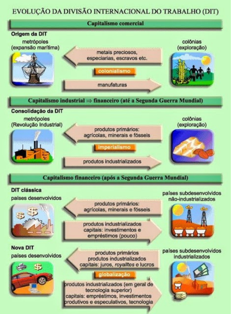 <p>A evolução do Capitalismo e a Divisão Internacional do Trabalho</p><p>A DIT (Divisão Internacional do Trabalho) é o nome dado para a divisão produtiva em âmbito internacional. A Divisão Internacional do Trabalho direciona uma especialização produtiva global, já que cada país fica designado a produzir um determinado produto ou partes do mesmo, dependendo dos incentivos oferecidos em cada país. Esse processo se expandiu na mesma proporção que o capitalismo. Nesse sentido, um exemplo que pode ser usado é a montagem de um automóvel realizada na Argentina, porém com componentes oriundos de diferentes países, como parte elétrica e eletrônica de Taiwan, borrachas da Indonésia e assim por diante. Isso ocorre porque cada país oferece certos atrativos. Desta forma, o custo do produto final será menor, aumentando os lucros das empresas.</p><p>Os países emergentes ou em desenvolvimento que obtiveram uma industrialização tardia e que possuem economias ainda frágeis e passíveis de crises econômicas oferecem aos países industrializados um leque de benefícios e incentivos para a instalação de indústrias, tais como a isenção parcial ou total de impostos, mão-de-obra abundante, entre outros. Por conta disso, a Divisão Internacional do Trabalho provoca desigualdades. Os países emergentes ou em desenvolvimento, como México, Argentina, Brasil e outros, adquirem tecnologias a preços altos, enquanto que a maior parte dos produtos exportados pelos países citados não atingem preços satisfatórios, favorecendo os países ricos.</p><p>Num primeiro momento, entre os séculos XVI e XVIII, a DIT tradicional era composta por dois grupos de países: o das metrópoles e o das colônias. Com isso, a lógica de comércio era bem simples (e desigual): as colônias vendiam matéria-prima por um preço baixo para as metrópoles, que os transformavam em produtos de maior valor agregado e os revendiam, acumulando mais capital. Tal panorama durou um longo período, mesmo com a independência de muitas colônias.</p><p>Até a década de 50, os bens manufaturados eram oriundos restritamente dos países industrializados, como Estados Unidos, Canadá, Japão e nações europeias. Os países já industrializados tinham suas respectivas produções primeiramente destinadas ao abastecimento do mercado interno, e depois, o restante direcionado ao fornecimento de mercadorias industrializadas aos países subdesenvolvidos que ainda não haviam ingressado efetivamente no processo de industrialização.</p><p>Até aquela época, os países subdesenvolvidos tinham a incumbência de gerar matéria-prima com a finalidade de fornecê-la aos países industrializados. Após a Segunda Guerra Mundial, muitas empresas, sobretudo norte-americanas, começaram a instalar filiais em diferentes países do mundo. Isso foi intensificado com o processo da globalização, que transformou muitos países subdesenvolvidos, que no passado eram meros produtores primários, em exportadores também de produtos industrializados, alterando as relações comerciais que predominavam até então. Ou seja, surgiu uma Nova DIT, mais complexa do que a anterior.</p><p>Apesar da modificação apresentada na configuração econômica, os países da América Latina, Ásia e África, ainda ocupam destaque na produção de produtos primários. O que os mantêm como produtores primários é principalmente o modo como os países subdesenvolvidos foram industrializados. Grande parte das empresas e indústrias existentes em países pobres é de nações desenvolvidas e ricas. Diante desse fato, uma das características da Nova DIT é a remessa de capitais: a maioria dos lucros adquiridos durante o ano não permanecem no território no qual a empresa se encontra, e sim, migram para o país de origem da mesma. Em outras palavras, as empresas transnacionais normalmente buscam os interesses próprios sem considerar as causas sociais, econômicas e ambientais de onde suas empresas estão instaladas.</p><p>O processo de desenvolvimento do capitalismo</p><p>Na história da humanidade é possível observar distintos modelos de organização dos meios sociais, econômicos e políticos, que exerceram grande influência no modo de viver das sociedades e na organização do espaço geográfico. Dentre esses sistemas, aquele que mais realizou transformações no espaço e nas sociedades foi o capitalismo, a partir de um paulatino processo de desenvolvimento, sendo na atualidade o sistema hegemônico mundial, apesar de ter sofrido algumas transformações ao longo do tempo. De qualquer modo, o capitalismo possui um conjunto de características que o definem de modo geral. A mais importante delas está correlacionada ao maior objetivo do sistema, que é o lucro, ou seja, a reprodução do capital, que vai justificar todas as outras características. Outra marca importante é a estrutura de propriedade baseada na propriedade privada, na qual os meios de produção (terras, equipamentos, matérias-primas etc.) pertencem aos agentes econômicos, podendo ser privados ou estatais. Além disso, existe um predomínio do trabalho assalariado e de uma sociedade dividida em classes, de acordo com a concentração de renda. Considerando seu processo de desenvolvimento, costuma-se dividir o capitalismo em quatro fases: Comercial, Industrial, Financeiro-Monopolista e Informacional.</p><p>Capitalismo Comercial (Fim do século XV até a primeira metade do século XVIII)</p><p>Substituindo o Feudalismo, a primeira etapa do capitalismo foi marcada pela expansão marítima das potências da Europa Ocidental da época (Grandes Navegações), em busca de novas rotas de comércio, sobretudo para as Índias. O objetivo dessas nações era acabar com o monopólio das cidades italianas (como Veneza e Gênova) no comércio com o Oriente pelo Mediterrâneo. Esse processo resultou no descobrimento de novas terras e na apropriação de vastos territórios (colonialismo), além 