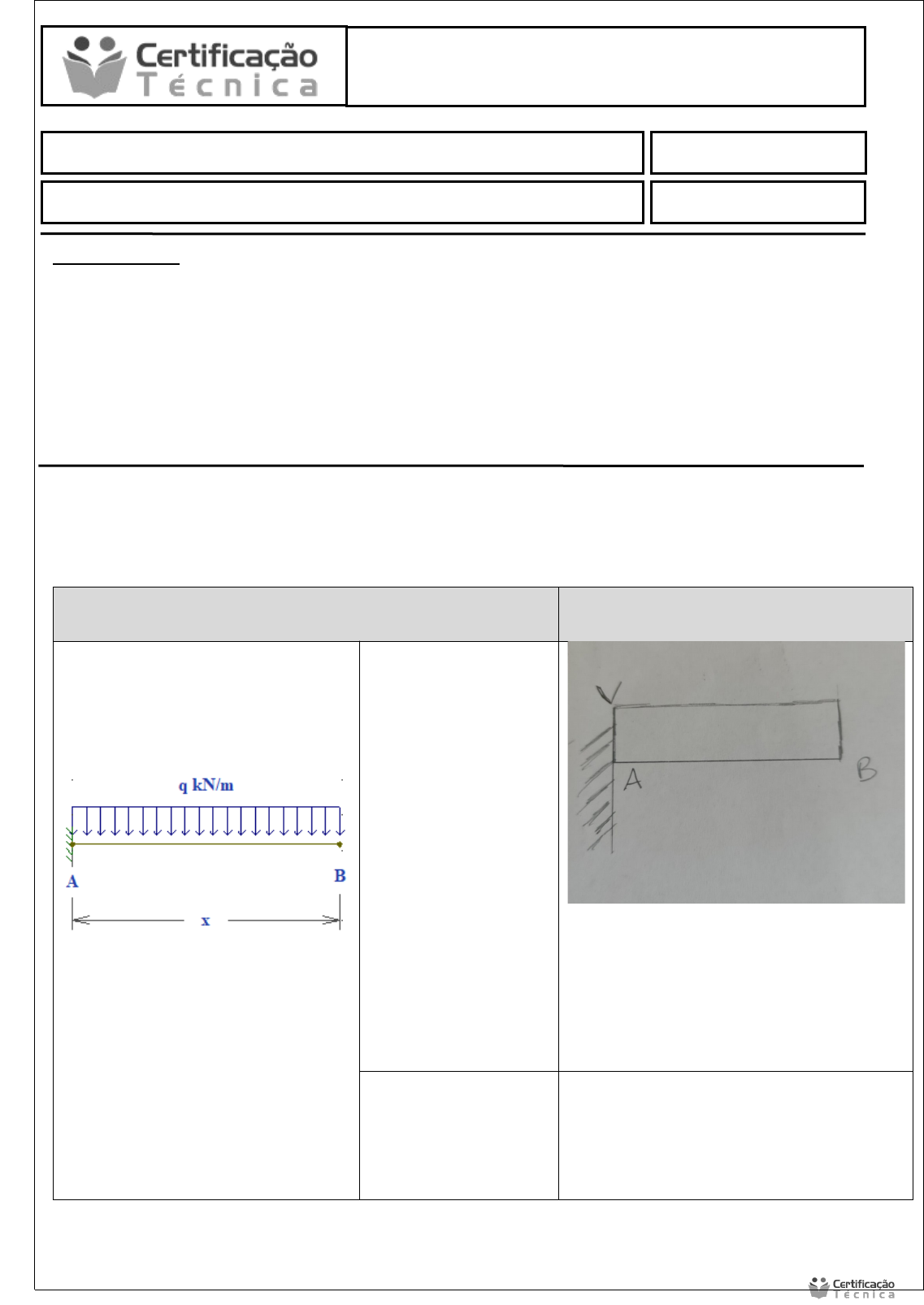 <p>Estabilidade - EDI</p><p>Data: / / 201_.</p><p>Aluno (a):</p><p>Atividade Prática e de Pesquisa</p><p>NOTA:</p><p>INSTRUÇÕES:</p><p>· Esta Avaliação contém 2 (duas) questões, totalizando 10 (dez) pontos;</p><p>· Baixe o arquivo disponível com a Atividade de Pesquisa;</p><p>· Você deve preencher dos dados no Cabeçalho para sua identificação:</p><p>· Nome / Data de entrega.</p><p>· As respostas devem ser digitadas abaixo de cada pergunta;</p><p>· Ao terminar grave o arquivo com o nome Atividade Prática;</p><p>· Envio o arquivo pelo sistema no local indicado;</p><p>· Em caso de dúvidas consulte o seu Tutor.</p><p>1. Para cada situação abaixo, preencha o quadro desenvolvendo o passo a passo para encontrar os esforços e momento. Desenhe os diagramas que se pede:</p><p>a)</p><p>Situação</p><p>Diagramas</p><p>Esforços Cortante;</p><p>VA – P = 0</p><p>VA = + P</p><p>-V + VA = 0</p><p>V = +VA</p><p>V – P = 0</p><p>V = + P</p><p>Momento Fletor;</p><p>VA – P . L = 0</p><p>VA = P . L</p><p>-MA – M = 0</p><p>M = -MA</p><p>M – P.(L-x) = 0</p><p>M = P.(L – x)</p><p>b)</p><p>Situação</p><p>Diagramas</p><p>Esforços Cortante;</p><p>HÁ = 0</p><p>VA + VB – (q kN/m . x) = 0</p><p>VA + VB = q kN/M . x</p><p>Momento Fletor;</p><p>HA – H1 = 0</p><p>HA = H1</p><p>Estabilidade - EDI</p><p>Estabilidade - EDI</p><p>image2.jpeg</p><p>image3.jpeg</p><p>image4.png</p><p>image5.jpeg</p><p>image6.jpeg</p><p>image1.png</p><p>image7.png</p>