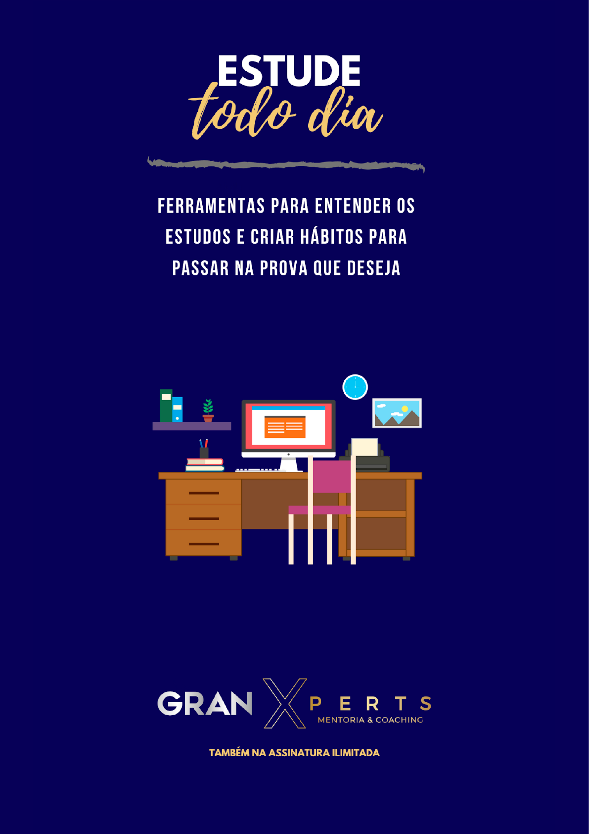 <p>2 www.grancursosonline.com.br</p><p>ESTUDE TODO DIA</p><p>Ferramentas para entender os estudos e criar hábitos para passar na prova que deseja</p><p>2 www.grancursosonline.com.br</p><p>NO INÍCIO, VOCÊ NÃO SABE NADA. ......................................................................................................3</p><p>A ESCOLHA DA ÁREA ..............................................................................................................................4</p><p>GUIA COMPLETO DAS QUESTÕES PARA CONCURSOS .....................................................................8</p><p>SIMULADOS ...............................................................................................................................................11</p><p>O TREINO PARA A BATALHA ..................................................................................................................................................... 11</p><p>TIPOS DE PLANEJAMENTO DE ESTUDOS E O BÁSICO DO PLANEJAMENTO ..............................13</p><p>HÁBITOS DO CONCURSEIRO FUTURO APROVADO ...........................................................................17</p><p>REVISÃO – O GUIA ....................................................................................................................................19</p><p>ROTINA MATADORA COM QUATRO HORAS POR DIA .......................................................................21</p><p>IMPORTÂNCIA DO PLANO DE ESTUDOS .............................................................................................24</p><p>REDAÇÃO NOTA 10 ...................................................................................................................................26</p><p>ESTUDO REVERSO – AS VANTAGENS DESSA TÉCNICA ...................................................................30</p><p>COMO NÃO ERRAR DUAS VEZES EM SEUS ESTUDOS......................................................................32</p><p>ADAPTAÇÃO DOS SEUS ESTUDOS! ......................................................................................................34</p><p>O QUE NÃO É MEDIDO NÃO É GERENCIADO ......................................................................................36</p><p>COMO OBSERVAR SEUS ESTUDOS PARA ALTERAR SEUS ESTUDOS (PARA MELHOR) ............38</p><p>UM PASSO PARA TRÁS (PARA PEGAR IMPULSO) .............................................................................40</p><p>REVISÃO DO PLANEJAMENTO .................................................................................................................................................. 40</p><p>NÃO CONTE SEUS OBJETIVOS ...............................................................................................................42</p><p>O USO DAS REDES SOCIAIS NOS ESTUDOS PARA CONCURSOS PÚBLICOS.................................44</p><p>SUMÁRIO</p><p>3 www.grancursosonline.com.br</p><p>ESTUDE TODO DIA</p><p>Ferramentas para entender os estudos e criar hábitos para passar na prova que deseja</p><p>NO INÍCIO, VOCÊ NÃO SABE NADA</p><p>Não sabe qual área escolher; não sabe o que é uma hora líquida; não sabe o que é lei</p><p>seca. Não tem nenhuma noção sobre a diferença entre jurisprudência e doutrina.</p><p>Tudo parece grego (embora boa parte seja latim), e o caminho parece árduo demais.</p><p>E é nessa jornada que surgem as soluções para os problemas. Quando você não sabe</p><p>por onde seguir, começa a se perguntar, e sua percepção se aguça para as possíveis saídas.</p><p>O Gran Cursos sempre atua como parceiro dos alunos, e não medimos esforços para trazer</p><p>o nosso melhor e te auxiliar na jornada. Foi pensando nisso que surgiu o Estude Todo Dia.</p><p>O Estude Todo Dia foi formatado como curso para poder te guiar pelo caminho da apro-</p><p>vação. Virou ebook para respeitar a máxima da preferência por modalidades – enquanto uma</p><p>pessoa prefere o vídeo, outras vão preferir o texto (lembre-se que não há evidência científica</p><p>que suporte os famosos “Estilos de Aprendizagem”, linhagem que defende que algumas pes-</p><p>soas são “mais auditivas” e outras são “mais visuais” quando se trata de aprender).</p><p>A ideia era trazer textos para poder te guiar. Nenhum deles representa necessariamente</p><p>a visão do Gran Cursos como instituição, mas, sim, nossas próprias idiossincrasias, nossos</p><p>pontos de vista e o reflexo das nossas experiências.</p><p>Pela leitura, você vai perceber que há vários caminhos. Mais do que um mapa, o que</p><p>temos aqui é um quebra-cabeças, em que cada GranXpert colocou uma ou mais peças bus-</p><p>cando te mostrar possibilidades.</p><p>Esperamos que o texto seja útil, que sua experiência nos estudos seja incrível e que você</p><p>possa contar com o Gran Cursos Online em toda a sua jornada.</p><p>Grande abraço,</p><p>Fernando Mesquita</p><p>Diretor de Mentoria e Coaching – GranXperts</p><p>Gran Cursos Online</p><p>4 www.grancursosonline.com.br</p><p>ESTUDE TODO DIA</p><p>Ferramentas para entender os estudos e criar hábitos para passar na prova que deseja</p><p>A ESCOLHA DA ÁREA</p><p>Quando decidimos ser servidores públicos, com tudo o que isso implica, o primeiro passo</p><p>já foi dado: a escolha sobre qual caminho seguir, a decisão de fazer parte do serviço público.</p><p>Essa decisão deverá, portanto, ser guiada pela vontade de dar um rumo diferente à nossa</p><p>própria história.</p><p>Por esse sonho é que devemos ser guiados e, para tanto, devemos traçar metas, verda-</p><p>deiros planos de ação que serão os instrumentos os quais proporcionarão esse movimento,</p><p>essa transformação: o transporte do estado atual ao estado onde se quer chegar, onde se</p><p>quer estar e ser.</p><p>Assim, ante o seu propósito, devem ser colocadas em prática todas as ações para que o</p><p>primeiro passo não seja sonhar por sonhar; é i