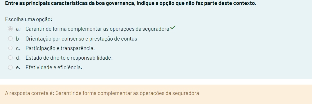 <p>Entre as principais características da boa governança, indique a opção que não faz parte deste contexto. Escolha uma opção: a. Garantir de forma complementar as operações da seguradora b. Orientação por consenso e prestação de contas C. Participação e transparência. d. Estado de direito e responsabilidade. e. Efetividade e eficiência. A resposta correta é: de forma complementar as operações da seguradora</p>