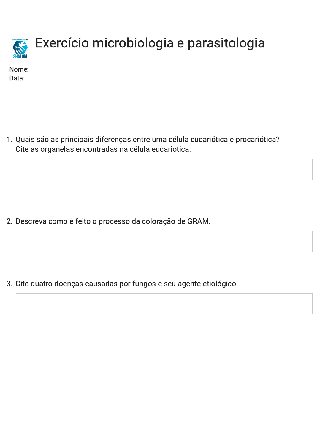 <p>Exercício microbiologia e parasitologia</p><p>Nome:</p><p>Data:</p><p>Quais são as principais diferenças entre uma célula eucariótica e procariótica?</p><p>Cite as organelas encontradas na célula eucariótica.</p><p>1.</p><p>Descreva como é feito o processo da coloração de GRAM.2.</p><p>Cite quatro doenças causadas por fungos e seu agente etiológico.3.</p><p>Este conteúdo não é criado nem endossado pela Microsoft. Os dados que você enviar serão enviados ao</p><p>proprietário do formulário.</p><p>Microsoft Forms</p><p>A simbiose é uma associação dispensável de sobrevivência que pode ser vantajosa para</p><p>ambos.</p><p>Comensalismo é quando uma espécie tira proveito do hospedeiro mais sem lhe causar</p><p>prejuízo.</p><p>Cooperação é a associação indispensável para a sobrevivência e pode ser vantajosa para o</p><p>parasita.</p><p>Comensalismo é a junção de ambas espécies sendo que o hospedeiro é menos prejudicado</p><p>do que o parasita.</p><p>Julgue as alternativas e escolha a correta. 4.</p><p>Quais são as formas de transmissão dos parasitas para os seres humanos. 5.</p>