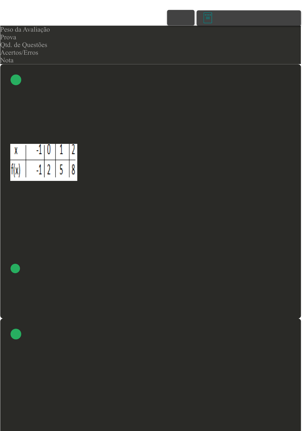 <p>Prova Impressa</p><p>GABARITO | Avaliação II - Individual (Cod.:988746)</p><p>Peso da Avaliação 2,00</p><p>Prova 86414639</p><p>Qtd. de Questões 10</p><p>Acertos/Erros 9/1</p><p>Nota 9,00</p><p>Interpolação linear é uma ramificação da matemática que se caracteriza por uma função linear</p><p>(polinômio de primeiro grau), a qual representa em resultados aproximados uma função f(x).</p><p>Considerando a tabela a seguir e considerando a função linear como f(x)= ax+b, qual o valor estimado</p><p>de f(1,25)?</p><p>Assinale a alternativa CORRETA:</p><p>A f(1,25) = 5,5</p><p>B f(1,25) = 6,25</p><p>C f(1,25) = 5,75</p><p>D f(1,25) = 6,5</p><p>Para destacar a importância de trabalhar com sistemas de equações não lineares, vamos levantar a</p><p>situação em que existe a necessidade de realizar a análise do comportamento de um regime</p><p>permanente do circuito não linear, quando os valores de tensão através dos resistores podem ser</p><p>obtidos através da resolução de um sistema de equações não lineares, e o problema se reduz a</p><p>encontrar uma raiz para o sistema de equações. Uma segunda situação permite mencionar que, no</p><p>sistema aéreo, os controladores de voo trabalham com radares e, quando dois destes radares estão</p><p>localizados em posições conhecidas, eles podem determinar a distância de suas localizações até uma</p><p>aeronave que está se aproximando dentro do espaço aéreo. Neste caso, também temos um sistema de</p><p>equações não lineares, e a solução está em calcular o valor das raízes das equações. Assim, efetue os</p><p>seguintes cálculos: Dado o sistema de equações não lineares:</p><p>VOLTAR</p><p>A+ Alterar modo de visualização</p><p>1</p><p>2</p><p>09/09/24, 18:50 Avaliação II - Individual</p><p>about:blank 1/8</p><p>Assinale a alternativa CORRETA:</p><p>A O Método de Newton é apropriado para calcular o erro relativo das variáveis com referência às</p><p>raízes de ambas as funções.</p><p>B As derivadas parciais das duas funções que compõem o sistema apresentam ponto de</p><p>descontinuidade.</p><p>C No sistema, as variáveis x e y assumem o mesmo valor.</p><p>D As duas funções que compõem o sistema apresentam ponto de descontinuidade.</p><p>Interpolação linear é uma ramificação da matemática que se caracteriza por uma função linear</p><p>(polinômio de primeiro grau), a qual representa em resultados aproximados uma função f(x).</p><p>Considerando a tabela a seguir e considerando a função linear como f(x)= ax+b, qual o valor estimado</p><p>de f(0,25)?</p><p>Assinale a alternativa CORRETA:</p><p>A f(0,25) = 0,75</p><p>3</p><p>09/09/24, 18:50 Avaliação II - Individual</p><p>about:blank 2/8</p><p>B f(0,25) = 2,75</p><p>C f(0,25) = 0,5</p><p>D f(0,25) = 2,5</p><p>Uma equação não linear é uma equação que contenha termos da forma x², x³, termos com raiz entre</p><p>outros. Um sistema de equações é dito não linear se pelo menos uma das equações não é linear. Para</p><p>resolver um sistema não linear, usamos processos interativos. Considere o sistema linear: f(x,y)=0</p><p>g(x,y)=0 onde, f ou g são funções não lineares. Com relação aos processos interativos usados para</p><p>encontrar a solução dos sistemas não lineares, analise as sentenças a seguir:</p><p>I- Para aplicar o método da Interação Linear, precisamos encontrar as funções F e G (chamadas de</p><p>funções de interação) que satisfazem F(x,y) = x e G(x,y) = y de tal forma que sejam contínuas e suas</p><p>derivadas parciais também são contínuas.</p><p>II- Para aplicar o método de Newton, temos que considerar que f e g sejam contínuas, mas não é</p><p>necessário que suas derivadas primeiras e segundas sejam também contínuas.</p><p>III- Para o método de Interação Linear, podemos considerar qualquer ponto inicial (x0, y0), não é</p><p>preciso estar próximo da solução.</p><p>IV- Para o método de Newton, temos que considerar o ponto inicial (x0, y0) próximo da solução.</p><p>Assinale a alternativa CORRETA:</p><p>A As sentenças I e IV estão corretas.</p><p>B As sentenças I e III estão corretas.</p><p>C As sentenças II e IV estão corretas.</p><p>D As sentenças II e III estão corretas.</p><p>4</p><p>09/09/24, 18:50 Avaliação II - Individual</p><p>about:blank 3/8</p><p>Interpolação linear é uma ramificação da matemática que se caracteriza por uma função linear</p><p>(polinômio de primeiro grau), a qual representa em resultados aproximados uma função f(x).</p><p>Considerando a tabela a seguir e considerando a função linear como f(x)= ax+b, qual o valor estimado</p><p>de f (1,8)?</p><p>Assinale a alternativa CORRETA:</p><p>A f(1,8) = 6,8</p><p>B f(1,8) = 7,2</p><p>C f(1,8) = 7,8</p><p>D f(1,8) = 7,4</p><p>No universo da Matemática, tudo que estudamos tem uma razão e aplicabilidade. Da teoria à</p><p>prática, os logaritmos são trabalhados em diversas áreas do conhecimento. O trabalho com uma</p><p>função logarítmica tem como objetivo facilitar os cálculos, bem como ampliar os conhecimentos em</p><p>assuntos específicos, como: a) na Química, quando o trabalho envolve radioatividade, para determinar</p><p>o tempo de desintegração de uma substância radioativa é utilizada a fórmula: Q=qo.e^(-r-t). Nesta</p><p>fórmula, Q representa a massa da substância, qº a massa inicial, r a taxa de redução da radioatividade</p><p>e a variável t o tempo. Equações com essa tipologia podem ser resolvidas com o auxílio da teoria dos</p><p>logaritmos; b) no ano de 1935, os sismólogos Charles Francis Richter e Beno Gutenberg</p><p>desenvolveram uma escala para quantificar o nível de energia liberada por um sismo. A escala</p><p>Richter, que também é conhecida por escala de magnitude local, é uma função logarítmica. Assim, é</p><p>possível quantificar em Joules a quantidade de energia liberada por um movimento tectônico; c) na</p><p>Medicina, qu