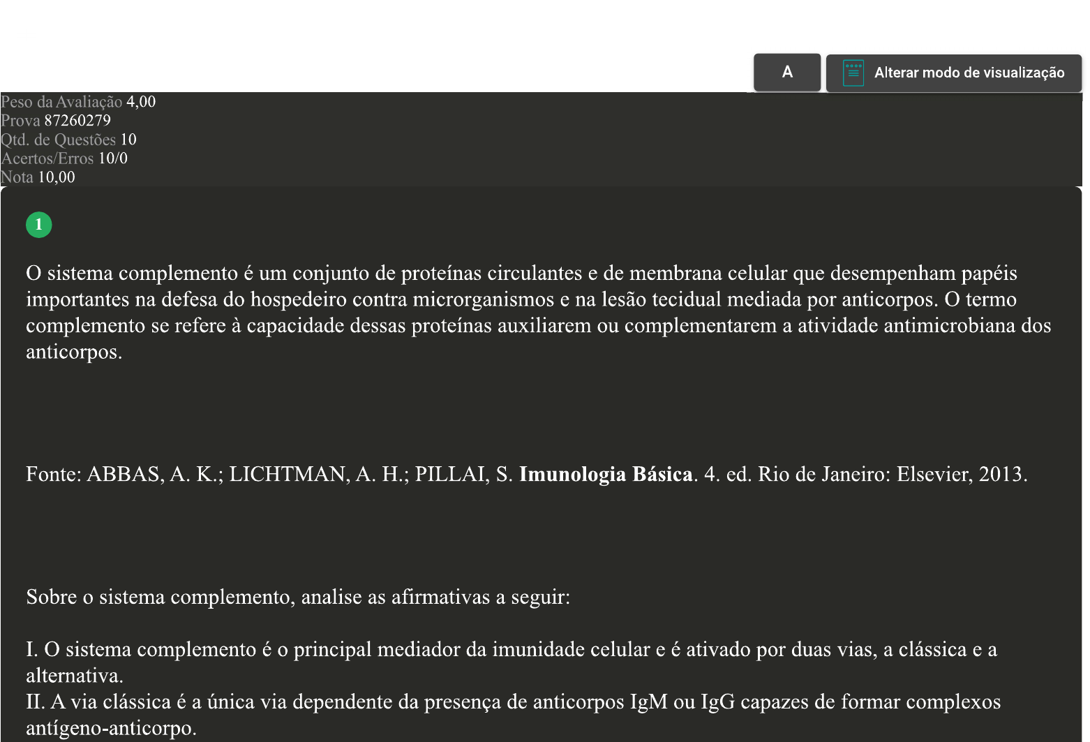 <p>A Alterar modo de visualização Peso da Avaliação 4,00 Prova 87260279 Qtd. de Questões 10 Acertos/Erros 10/0 Nota 10,00 1 O sistema complemento é um conjunto de proteínas circulantes e de membrana celular que desempenham papéis importantes na defesa do hospedeiro contra microrganismos e na lesão tecidual mediada por anticorpos. O termo complemento se refere à capacidade dessas proteínas auxiliarem ou complementarem a atividade antimicrobiana dos anticorpos. Fonte: ABBAS, A. K.; LICHTMAN, A. H.; PILLAI, S. Imunologia Básica. 4. ed. Rio de Janeiro: Elsevier, 2013. Sobre sistema complemento, analise as afirmativas a seguir: I. O sistema complemento é principal mediador da imunidade celular e é ativado por duas vias, a clássica e a alternativa. II. A via clássica é a única via dependente da presença de anticorpos IgM ou IgG capazes de formar complexos</p><p>III. A via alternativa não depende de anticorpos para ser ativada, e sua função está relacionada com rápido combate de infecções bacterianas. IV. A via das lectinas é ativada contra infecções bacterianas e fúngicas, sendo ativada após os macrófagos realizarem a fagocitose de bactérias, vírus e outros antígenos. É correto que se afirma em: A II, III e IV, apenas. B III e IV, apenas. C I, II e III, apenas. D II e III, apenas. 2 Antes de viajar para a região norte do país, um viajante consultou um médico que recomendou a vacinação contra a febre amarela. Assim, caso entrasse em contato com vírus durante a viagem, não desenvolveria a doença.</p><p>Considerando as informações apresentadas e seu conhecimento sobre tema, avalie as asserções a seguir e a relação proposta entre elas. I. O médico, a partir da vacina, espera estimular a resposta imune adaptativa do indivíduo, estimulando os linfócitos T e B. PORQUE II. Os linfócitos T e B ao serem estimulados, produzirão anticorpos contra vírus e uma memória imunológica, que reconhecerá de forma rápida e específica antígeno que corpo encontrou previamente na vacina, iniciando a resposta imunológica. A respeito dessas asserções, assinale a opção correta: A A asserção I é uma proposição verdadeira, e a II é uma proposição falsa. B A asserção I é uma proposição falsa, e a II é uma proposição verdadeira.</p><p>C As asserções I e II são proposições verdadeiras, e a II é uma justificativa correta da I. D As asserções I e II são proposições verdadeiras, mas a II não é uma justificativa correta da I. 3 [Laboratório Virtual - Coloração de Gram] A técnica de Coloração de Gram recebeu este nome em homenagem a seu descobridor, médico dinamarquês Hans Cristian Joaquim Gram, em 1884. Ele percebeu que as bactérias adquiriram cores diferentes quando tratadas com diferentes corantes, permitindo classificá-las em dois grupos: as que ficavam roxas, que foram chamadas de Gram-positivas, e as que ficavam vermelhas, chamadas de Gram- negativas. Sobre a aplicabilidade do uso da técnica de Gram, assinale a alternativa CORRETA: A Esse método de coloração dificulta a identificação do agente etiológico, já que possibilita a visualização das características morfológicas e tintoriais dos vírus infecciosos. B Saber preparar e realizar a coloração de Gram é um pré-requisito para desenvolvimento de competências e habilidades experimentais que possibilitam diagnóstico das infecções por bactérias.</p><p>C Na taxonomia de procariontes, a coloração de Gram dificulta a classificação morfológica das bactérias, sendo necessário utilizar óleo de imersão para objetiva de 100x. D As colorações Gram-positiva e Gram-negativa de bactérias permitem a visualização da morfologia geral das células bacterianas, classificando-as exclusivamente em bastonetes. 4 [Laboratório Virtual Conhecendo um Microscópio] Conhecer as partes que compõem um microscópio óptico, bem como saber manusear adequadamente esse equipamento, possibilita realizar observações incríveis, com um aumento de até 2 mil vezes. Esse aumento possibilita visualizar bactérias diminutas, além de vários outros tipos de microrganismos. Sobre as partes de um microscópio óptico, associe os itens, utilizando código a seguir: I- Micrométrico. II- Mesa ou platina.</p><p>III- - Aumento de 400x. ( ) Serve de base para a lâmina e é movimentada verticalmente ao girar macrométrico ou micrométrico. ( ) Possibilita realizar ajuste fino do foco. ( ) Quando se utiliza a objetiva de 40x e ocular de 10x. Agora, assinale a alternativa que apresenta a sequência CORRETA. - III - II. B III - II - - I. C II - - I - III.</p><p>D I - II - III. 5 Uma das propriedades mais marcantes do sistema imune é a sua capacidade de reagir a uma enorme variedade de microrganismos, mas não contra cada antígeno próprio do indivíduo. Esta não responsividade aos antígenos (próprios), também chamada de tolerância imunológica, é mantida apesar do fato de que os mecanismos moleculares pelos quais os receptores dos linfócitos gerados não são tendenciosos para excluir os receptores para antígenos próprios. Fonte: ABBAS, A. K.; LICHTMAN, A. H.; PILLAI, Imunologia Básica. 4. ed. Rio de Janeiro: Elsevier, 2013. Sobre a tolerância imunológica, assinale a alternativa correta: Na tolerância imunológica, antígeno próprio do organismo é exposto e apresentado aos linfócitos A desencadeando uma resposta linfocitária.</p><p>Na tolerância imunológica, reconhecimento das é baseado em processos de alta afinidade que B devem estimular a desativação dos linfócitos. C Na tolerância imunológica, os antígenos do próprio corpo não devem estimular a ativação dos linfócitos. D Na tolerância imunológica como carboidratos, lipídeos e proteínas são reconhecidas e eliminadas. 6 O corpo humano é habitado por milhares de diferentes espécies bacterianas algumas vivendo de forma transitória, outras em uma relação parasitária permanente. Do mesmo modo,