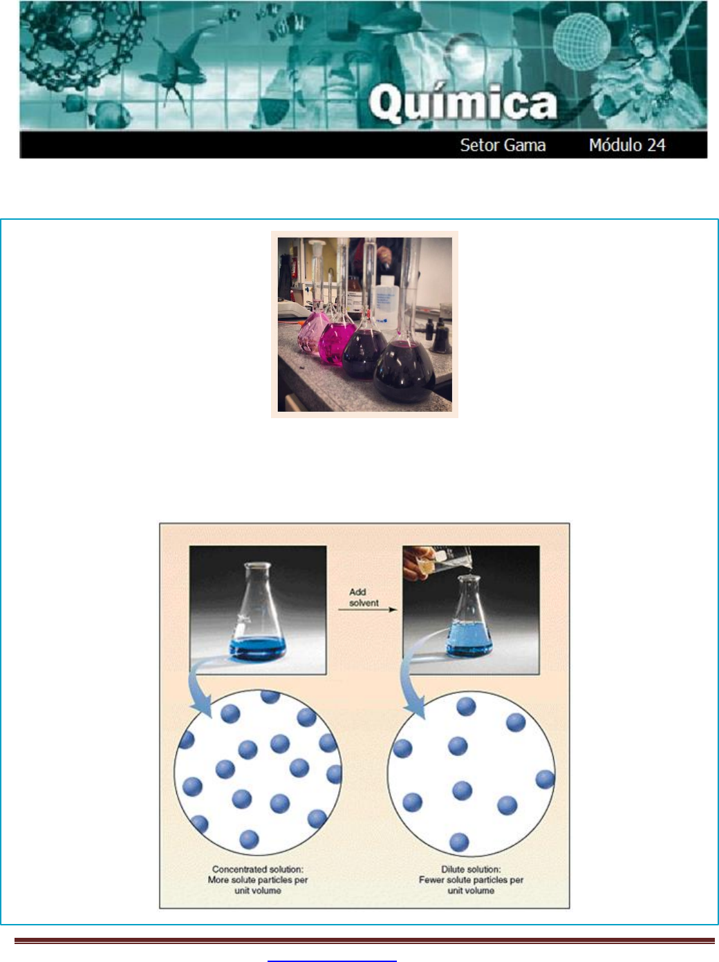 <p>Portal de Estudos em Química (PEQ) – www.profpc.com.br Página 1</p><p>Operações com soluções 1: Diluição</p><p>Diluir uma solução significa acrescentar solvente a esta solução.</p><p>Com isto, veremos que:</p><p>a) A quantidade de soluto (massa e mol) permanece constante.</p><p>b) O volume da solução aumenta.</p><p>c) A concentração (ℳ, τ, C) diminui.</p><p>Portal de Estudos em Química (PEQ) – www.profpc.com.br Página 2</p><p>EXERCÍCIOS DE APLICAÇÃO</p><p>01 Qual volume de água deveremos adicionar a 60cm3 de solução de NaCℓ de concentração 40g/L, tal que a</p><p>concentração diminua para 5,0 g/L?</p><p>02 A 100mL de solução 0,5M de H2SO4 adicionou-se 400mL de água. Qual a concentração final em mol/L?</p><p>03 Qual volume de água deverá evaporar de 600mL de solução 0,1M de glicose, tal que a concentração</p><p>aumente para 0,3M?</p><p>04 Como deverá ser diluída uma solução para que a concentração diminua de 1,0 mol/L para 0,2mol/L?</p><p>05 Qual será a nova porcentagem em massa de H2SO4 se acrescentarmos 600g de água destilada a 400g de</p><p>“água de bateria” contendo 38% do ácido?</p><p>06 (FEI-SP) Um químico necessita usar 50 mL de uma solução aquosa de NaOH 0,20 mol/L. No estoque está</p><p>disponível apenas um frasco contendo 2,0 L de NaOH(aq) 2,0 mol/L.</p><p>Qual o volume da solução de soda cáustica 2,0 M que deve ser retirado do frasco para que, após sua diluição, se</p><p>obtenha 50 mL de solução aquosa de NaOH 0,20 mol/L?</p><p>Que volume aproximado foi adicionado de água?</p><p>07 (FMMT-MT) Um estudante de química foi solicitado para preparar 250 mL de uma solução molar de ácido</p><p>clorídrico. No rótulo do ácido clorídrico encontram-se as informações d = 1,19 g/cm3; porcentagem do ácido =</p><p>36% Determine o volume de solução inicial de ácido, bem como o volume de água utilizado nesta diluição.</p><p>Dados: H = 1 u ; Cl = 35 u</p><p>08 (Unicamp-SP) Um dos grandes problemas das navegações do século XVI referia-se à limitação de água</p><p>potável que era possível transportar numa embarcação. Imagine uma situação de emergência em que restaram</p><p>apenas 300 litros (L) de água potável (considere-a completamente isenta de eletrólitos). A água do mar não é</p><p>apropriada para o consumo devido à grande concentração de NaCℓ (25g/L), porém o soro fisiológico (10g</p><p>NaCℓ/L) é. Se os navegantes tivessem conhecimento da composição do soro fisiológico, poderiam usar água</p><p>potável para diluir água do mar de modo a obter o soro e assim teriam um volume maior de líquido para beber.</p><p>a) Que volume total de soro seria obtido com a diluição se todos os 300 litros de água potável fossem usados</p><p>para este fim?</p><p>b) Considerando-se a presença de 50 pessoas na embarcação e admitindo-se uma distribuição equitativa do</p><p>soro, quantos gramas de NaCℓ teriam sido ingeridos por cada pessoa?</p><p>c) Uma maneira que os navegadores usavam para obter água potável adicional era recolher água de chuva.</p><p>Considerando-se que a água da chuva é originária, em grande parte, da água do mar, como se explica que ela</p><p>possa ser usada como água potável?</p><p>09 (UFSC-SC) Qual a massa de Na2SO4, em gramas, necessária para preparar 100 mL de uma solução 3,50</p><p>molar? Qual o volume de água, em mL, necessário para diluir 10 mL desta solução, transformando-a em 1,75</p><p>molar?</p><p>Dados: Massas molares (g/mol): Na=23,0; S=32,0; O=16,0</p><p>null</p><p>Portal de Estudos em Química (PEQ) – www.profpc.com.br Página 3</p><p>EXERCÍCIOS PROPOSTOS</p><p>10 (UFMG-MG) Uma mineradora de ouro, na Romênia, lançou 100000m3 de água e lama contaminadas com</p><p>cianeto, CN-(aq), nas águas de um afluente do segundo maior rio da Hungria.</p><p>A concentração de cianeto na água atingiu, então, o valor de 0,0012 mol/litro. Essa concentração é muito mais</p><p>alta que a concentração máxima de cianeto que ainda permite o consumo doméstico da água, igual a 0,01</p><p>miligrama/litro.</p><p>Considerando-se essas informações, para que essa água pudesse servir ao consumo doméstico, ela deveria ser</p><p>diluída, aproximadamente:</p><p>a) 32000 vezes. b) 3200 vezes. c) 320 vezes. d) 32 vezes.</p><p>11 Que volume de água deve ser adicionado a 400 mL de solução de concentração igual a 5,0 g/L a fim de que</p><p>sua concentração fique igual a 2,0 g/L?</p><p>12 Adicionaram-se 50 mL de água a 150 mL de solução 0,8 M de H2SO4. Qual será a concentração final em</p><p>mols/L?</p><p>13 100 g de H2SO4 de 60% em massa são adicionados a 400 g de água. Calcule a porcentagem em massa de</p><p>H2SO4 na solução obtida.</p><p>14 Como deve ser diluída uma solução aquosa de NaOH a fim de que seu título se reduza a 2/5 do inicial?</p><p>15 Que volume de solução de HNO3 de 63% em massa e densidade igual a 1,4 g/mL é necessário para se</p><p>obterem 5,0 litros de solução decimolar de HNO3?</p><p>16 (Fuvest-SP) Se adicionarmos 80 mL de água a 20 mL de uma solução 0,20 M de hidróxido de potássio,</p><p>obteremos uma solução de concentração molar igual a:</p><p>a) 0,010 b) 0,020 c) 0,025 d) 0,040 e) 0,050</p><p>17 (UFRN-RN) O volume de água, em mL, que deve ser adicionado a 80 mL de solução aquosa 0,1 M de ureia,</p><p>para que a solução resultante seja 0,08 M, deve ser igual a:</p><p>a) 0,8 b) 1 c) 20 d) 80 e) 100</p><p>18 Que volume de solução 0,75 M de H2SO4 pode ser obtido pela diluição de 300 mL de solução molar de</p><p>H2SO4?</p><p>Portal de Estudos em Química (PEQ) – www.profpc.com.br Página 4</p><p>19 (PUC-RS) Instrução: Responder à questão com base no esquema a seguir, que representa um conjunto de</p><p>soluções de sulfato de cobre. As soluções foram obtidas, sempre diluindo-se com água, sucessivamente, 5 mL da</p><p>solução anterior para se obter 10 mL da nova sol