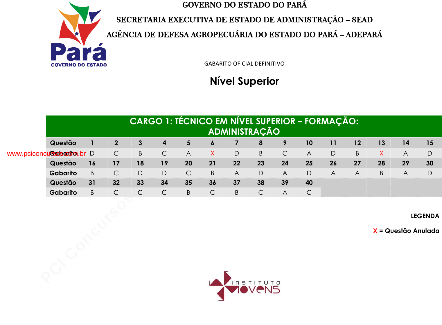 <p>pcimarkpci MjgwNDowZDRiOjk0ZDM6MmEwMDozMDE3OmM5NDU6OTdjYjo0ZWVm:TW9uLCAwOSBTZXAgMjAyNCAyMDo0NToxMSAtMDMwMA==</p><p>www.pciconcursos.com.br</p><p>GOVERNO DO ESTADO DO PARÁ</p><p>SECRETARIA EXECUTIVA DE ESTADO DE ADMINISTRAÇÃO – SEAD</p><p>AGÊNCIA DE DEFESA AGROPECUÁRIA DO ESTADO DO PARÁ – ADEPARÁ</p><p>GABARITO OFICIAL DEFINITIVO</p><p>Nível Superior</p><p>CARGO 1: TÉCNICO EM NÍVEL SUPERIOR – FORMAÇÃO:</p><p>ADMINISTRAÇÃO</p><p>Questão 1 2 3 4 5 6 7 8 9 10 11 12 13 14 15</p><p>Gabarito D C B C A X D B C A D B X A D</p><p>Questão 16 17 18 19 20 21 22 23 24 25 26 27 28 29 30</p><p>Gabarito B C D D C B A D A D A A B A D</p><p>Questão 31 32 33 34 35 36 37 38 39 40</p><p>Gabarito B C C C B C B C A C</p><p>LEGENDA</p><p>X = Questão Anulada</p><p>www.pciconcursos.com.br</p><p>pcimarkpci MjgwNDowZDRiOjk0ZDM6MmEwMDozMDE3OmM5NDU6OTdjYjo0ZWVm:TW9uLCAwOSBTZXAgMjAyNCAyMDo0NToxMSAtMDMwMA==</p><p>www.pciconcursos.com.br</p><p>GOVERNO DO ESTADO DO PARÁ</p><p>SECRETARIA EXECUTIVA DE ESTADO DE ADMINISTRAÇÃO – SEAD</p><p>AGÊNCIA DE DEFESA AGROPECUÁRIA DO ESTADO DO PARÁ – ADEPARÁ</p><p>GABARITO OFICIAL DEFINITIVO</p><p>Nível Superior</p><p>CARGO 2: TÉCNICO EM NÍVEL SUPERIOR – FORMAÇÃO:</p><p>ARQUITETURA</p><p>Questão 1 2 3 4 5 6 7 8 9 10 11 12 13 14 15</p><p>Gabarito D C B C A X D B C A D B X A D</p><p>Questão 16 17 18 19 20 21 22 23 24 25 26 27 28 29 30</p><p>Gabarito D C B A D A C B A C C D B A D</p><p>Questão 31 32 33 34 35 36 37 38 39 40</p><p>Gabarito B C A B D C B C A C</p><p>LEGENDA</p><p>X = Questão Anulada</p><p>www.pciconcursos.com.br</p><p>pcimarkpci MjgwNDowZDRiOjk0ZDM6MmEwMDozMDE3OmM5NDU6OTdjYjo0ZWVm:TW9uLCAwOSBTZXAgMjAyNCAyMDo0NToxMSAtMDMwMA==</p><p>www.pciconcursos.com.br</p><p>GOVERNO DO ESTADO DO PARÁ</p><p>SECRETARIA EXECUTIVA DE ESTADO DE ADMINISTRAÇÃO – SEAD</p><p>AGÊNCIA DE DEFESA AGROPECUÁRIA DO ESTADO DO PARÁ – ADEPARÁ</p><p>GABARITO OFICIAL DEFINITIVO</p><p>Nível Superior</p><p>CARGO 3: TÉCNICO EM NÍVEL SUPERIOR – FORMAÇÃO:</p><p>CIÊNCIA DA COMPUTAÇÃO OU TECNOLOGIA EM PROCESSAMENTO DE DADOS</p><p>Questão 1 2 3 4 5 6 7 8 9 10 11 12 13 14 15</p><p>Gabarito D C B C D B C A D D B X A D B</p><p>Questão 16 17 18 19 20 21 22 23 24 25 26 27 28 29 30</p><p>Gabarito B D A B D A C B C A D B D A A</p><p>Questão 31 32 33 34 35 36 37 38 39 40</p><p>Gabarito B C D C B C B C A C</p><p>LEGENDA</p><p>X = Questão Anulada</p><p>www.pciconcursos.com.br</p><p>pcimarkpci MjgwNDowZDRiOjk0ZDM6MmEwMDozMDE3OmM5NDU6OTdjYjo0ZWVm:TW9uLCAwOSBTZXAgMjAyNCAyMDo0NToxMSAtMDMwMA==</p><p>www.pciconcursos.com.br</p><p>GOVERNO DO ESTADO DO PARÁ</p><p>SECRETARIA EXECUTIVA DE ESTADO DE ADMINISTRAÇÃO – SEAD</p><p>AGÊNCIA DE DEFESA AGROPECUÁRIA DO ESTADO DO PARÁ – ADEPARÁ</p><p>GABARITO OFICIAL DEFINITIVO</p><p>Nível Superior</p><p>CARGO 4: TÉCNICO EM NÍVEL SUPERIOR – FORMAÇÃO:</p><p>CIÊNCIAS CONTÁBEIS</p><p>Questão 1 2 3 4 5 6 7 8 9 10 11 12 13 14 15</p><p>Gabarito D C B C A X D B C A D B X A D</p><p>Questão 16 17 18 19 20 21 22 23 24 25 26 27 28 29 30</p><p>Gabarito A C C C C A B X B A B B C D D</p><p>Questão 31 32 33 34 35 36 37 38 39 40</p><p>Gabarito A B D A B C B C A C</p><p>LEGENDA</p><p>X = Questão Anulada</p><p>www.pciconcursos.com.br</p><p>pcimarkpci MjgwNDowZDRiOjk0ZDM6MmEwMDozMDE3OmM5NDU6OTdjYjo0ZWVm:TW9uLCAwOSBTZXAgMjAyNCAyMDo0NToxMSAtMDMwMA==</p><p>www.pciconcursos.com.br</p><p>GOVERNO DO ESTADO DO PARÁ</p><p>SECRETARIA EXECUTIVA DE ESTADO DE ADMINISTRAÇÃO – SEAD</p><p>AGÊNCIA DE DEFESA AGROPECUÁRIA DO ESTADO DO PARÁ – ADEPARÁ</p><p>GABARITO OFICIAL DEFINITIVO</p><p>Nível Superior</p><p>CARGO 5: TÉCNICO EM NÍVEL SUPERIOR – FORMAÇÃO:</p><p>ENGENHARIA CIVIL</p><p>Questão 1 2 3 4 5 6 7 8 9 10 11 12 13 14 15</p><p>Gabarito D C B C A X D B C A D B X A D</p><p>Questão 16 17 18 19 20 21 22 23 24 25 26 27 28 29 30</p><p>Gabarito A C A B C C D C A B D A B C C</p><p>Questão 31 32 33 34 35 36 37 38 39 40</p><p>Gabarito C D D B A C B C A C</p><p>LEGENDA</p><p>X = Questão Anulada</p><p>www.pciconcursos.com.br</p><p>pcimarkpci MjgwNDowZDRiOjk0ZDM6MmEwMDozMDE3OmM5NDU6OTdjYjo0ZWVm:TW9uLCAwOSBTZXAgMjAyNCAyMDo0NToxMSAtMDMwMA==</p><p>www.pciconcursos.com.br</p><p>GOVERNO DO ESTADO DO PARÁ</p><p>SECRETARIA EXECUTIVA DE ESTADO DE ADMINISTRAÇÃO – SEAD</p><p>AGÊNCIA DE DEFESA AGROPECUÁRIA DO ESTADO DO PARÁ – ADEPARÁ</p><p>GABARITO OFICIAL DEFINITIVO</p><p>Nível Superior</p><p>CARGO 6: TÉCNICO EM NÍVEL SUPERIOR – FORMAÇÃO:</p><p>ENGENHARIA QUÍMICA</p><p>Questão 1 2 3 4 5 6 7 8 9 10 11 12 13 14 15</p><p>Gabarito D C B C A X D B C A D B X A D</p><p>Questão 16 17 18 19 20 21 22 23 24 25 26 27 28 29 30</p><p>Gabarito B A A C B C C A A C C C A D D</p><p>Questão 31 32 33 34 35 36 37 38 39 40</p><p>Gabarito A B D C D C B C A C</p><p>LEGENDA</p><p>X = Questão Anulada</p><p>www.pciconcursos.com.br</p><p>pcimarkpci MjgwNDowZDRiOjk0ZDM6MmEwMDozMDE3OmM5NDU6OTdjYjo0ZWVm:TW9uLCAwOSBTZXAgMjAyNCAyMDo0NToxMSAtMDMwMA==</p><p>www.pciconcursos.com.br</p><p>GOVERNO DO ESTADO DO PARÁ</p><p>SECRETARIA EXECUTIVA DE ESTADO DE ADMINISTRAÇÃO – SEAD</p><p>AGÊNCIA DE DEFESA AGROPECUÁRIA DO ESTADO DO PARÁ – ADEPARÁ</p><p>GABARITO OFICIAL DEFINITIVO</p><p>Nível Superior</p><p>CARGO 7: TÉCNICO EM NÍVEL SUPERIOR – FORMAÇÃO:</p><p>ESTATÍSTICA</p><p>Questão 1 2 3 4 5 6 7 8 9 10 11 12 13 14 15</p><p>Gabarito D C B C A X D B C A D B X A D</p><p>Questão 16 17 18 19 20 21 22 23 24 25 26 27 28 29 30</p><p>Gabarito C D C B D D A B B D B C C D A</p><p>Questão 31 32 33 34 35 36 37 38 39 40</p><p>Gabarito B A B D C C B C A C</p><p>LEGENDA</p><p>X = Questão Anulada</p><p>www.pciconcursos.com.br</p><p>pcimarkpci MjgwNDowZDRiOjk0ZDM6MmEwMDozMDE3OmM5NDU6OTdjYjo0ZWVm:TW9uLCAwOSBTZXAgMjAyNCAyMDo0NToxMSAtMDMwMA==</p><p>www.pciconcursos.com.br</p><p>GOVERNO DO ESTADO DO PARÁ</p><p>SECRETARIA EXECUTIVA DE ESTADO DE ADMINISTRAÇÃO – SEAD</p><p>AGÊNCIA DE DEFESA AGROPECUÁRIA DO ESTADO DO PARÁ – ADEPARÁ</p><p>GABARITO O