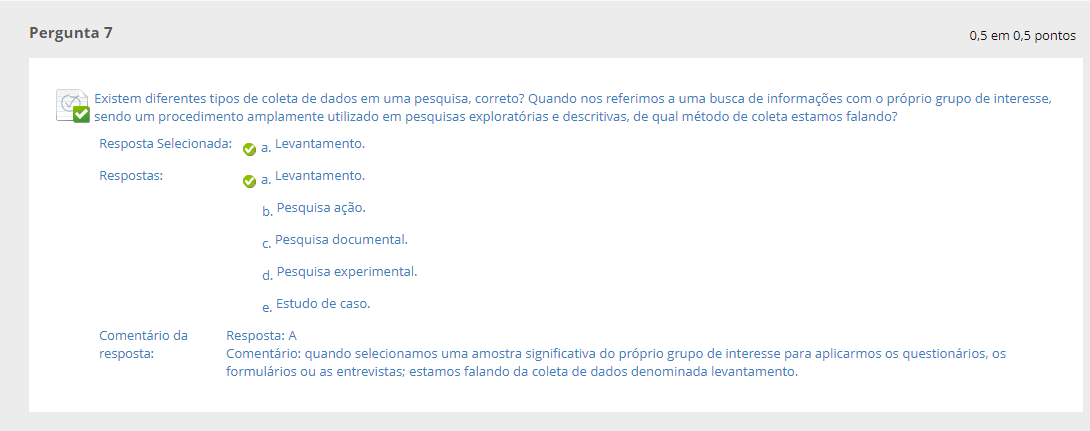 <p>Pergunta 7 em 0,5 pontos Existem diferentes tipos de coleta de dados em uma pesquisa, correto? Quando nos referimos a uma busca de informações com próprio grupo de interesse. sendo um procedimento amplamente utilizado em pesquisas exploratórias e descritivas, de qual método de coleta estamos falando? Resposta Selecionada: a. Levantamento. Respostas: a b. Pesquisa ação. C. Pesquisa d. Pesquisa experimental. e. Estudo de caso. Comentário da Resposta: A resposta: Comentário: quando selecionamos uma amostra significativa do próprio grupo de interesse para aplicarmos os questionários, os formulários ou as entrevistas; estamos falando da coleta de dados denominada levantamento.</p>