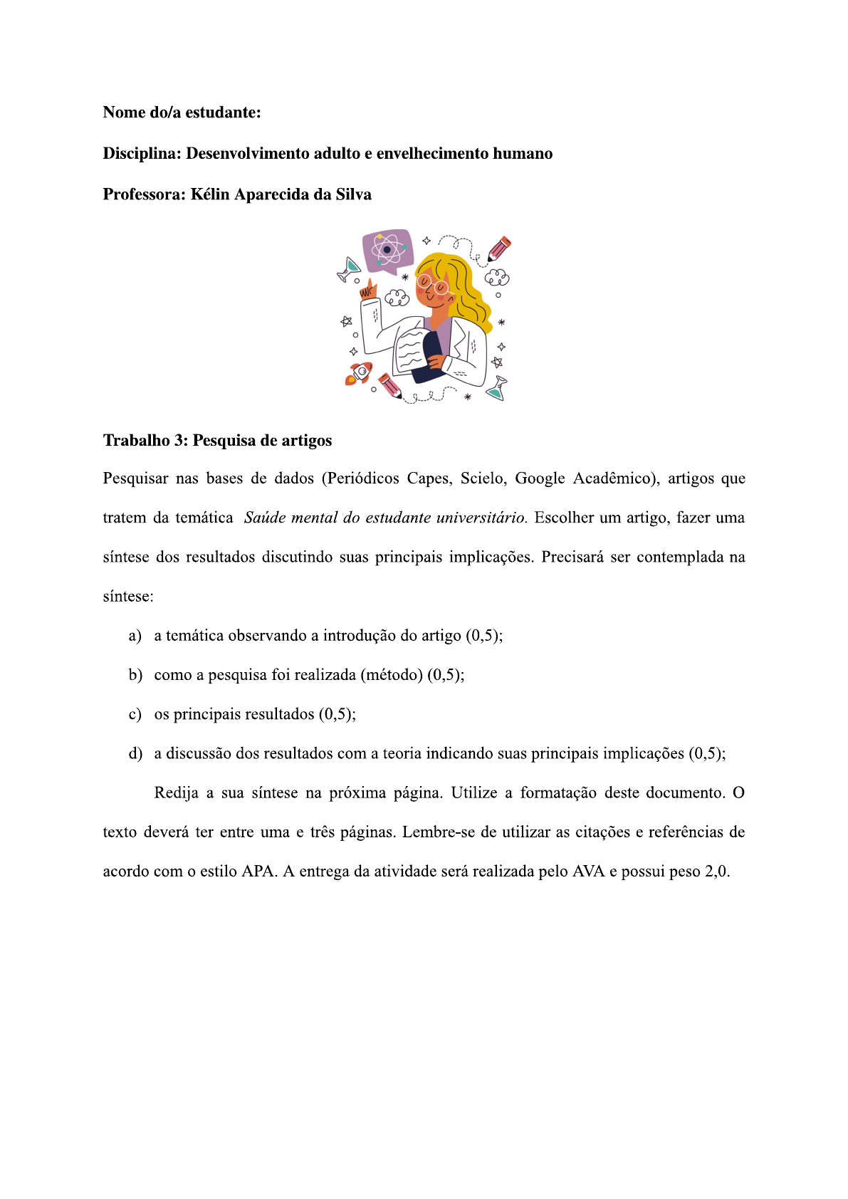 <p>Nome do/a estudante: Disciplina: Desenvolvimento adulto e envelhecimento humano Professora: Kélin Aparecida da Silva * o Trabalho 3: Pesquisa de artigos Pesquisar nas bases de dados (Periódicos Capes, Scielo, Google Acadêmico), artigos que tratem da temática Saúde mental do estudante universitário. Escolher um artigo, fazer uma síntese dos resultados discutindo suas principais implicações. Precisará ser contemplada na síntese: a) a temática observando a introdução do artigo (0,5); b) como a pesquisa foi realizada (método) (0,5); c) os principais resultados (0,5); d) a discussão dos resultados com a teoria indicando suas principais implicações (0,5); Redija a sua síntese na próxima página. Utilize a formatação deste documento. O texto deverá ter entre uma e três páginas. Lembre-se de utilizar as citações e referências de acordo com o estilo APA. A entrega da atividade será realizada pelo AVA e possui peso 2,0.</p><p>O artigo "A influência do meio ambiente na saúde dos universitários: uma revisão narrativa" publicado pela Revista Científica Multidisciplinar, discutiu a interação sobre grandes tópicos que cercam a vida dos estudantes. Com o enfoque em três principais aspectos, o artigo foi capaz de desenvolver mais facilmente as suas relações. primeiro tópico foi o estresse na vida universitária. Considera-se que o estresse é uma resposta geralmente psíquica, que ocorre quando o organismo precisa se adaptar a uma situação de dificuldade. Dessa forma, o estresse é uma resposta recorrente na vida dos estudantes devido a rotina exaustiva e a provável transição para a vida adulta. segundo assunto foi o abuso de substâncias ilícitas durante a graduação relacionado a frequência e a quantidade de jovens que já usaram ou usam substâncias. Entre os graduandos entrevistados de 17 a 20 anos, 13% já haviam provado alguma droga. Quanto à questão social, a exposição a essas situações eram maiores no estudantes de universidades públicas. O último aspecto aprofundado foi o despreparo psicoemocional dos estudantes que dificulta a vida acadêmica, como o nervosismo frente a épocas de prova e o desinteresse em matérias desmotivadoras. Dessa forma, o artigo conseguiu relacionar os três tópicos, já que em muitos casos o estresse e o despreparo psicoemocional pode acarretar o uso de drogas no ambiente acadêmico. Essa atitude é vista como uma escapatória de problemas como qualidade de sono, desmotivação, estresse, solidão e má alimentação. Quanto ao método de pesquisa, a obra realizou uma revisão narrativa sobre o meio universitário entre os meses de junho e julho de 2024. Foi feita uma coleta de informações sobre a saúde mental dos estudantes pela opinião de outros autores. Além disso, foram incluídos artigos publicados entre 2011 e 2018.</p><p>principal resultado trazido foi quanto os universitários tendem a se sentir vulneráveis quanto a inserção na faculdade, que pode ser acompanhada por toda a formação, ocasionando o sofrimento psíquico e prejuízos à saúde mental. Por fim, as principais implicações desse sofrimento psíquico na faculdade estão relacionados ao momento posterior à graduação, já que grande parte desse sofrimento pode continuar até o fim da graduação. Visto que há a ausência de uma rede de apoio no ambiente acadêmico, principalmente vindo dos docentes, muitos estudantes tendem a adoecer e não passam pela superação do problema. Referências: Nascimento, V. de A., Lima, M. L. da S. & Pachú C.O. (2023). A Influência do meio ambiente na saúde dos universitários: uma revisão narrativa. Revista Científica Multidisciplinar v.4 (n.9).</p>