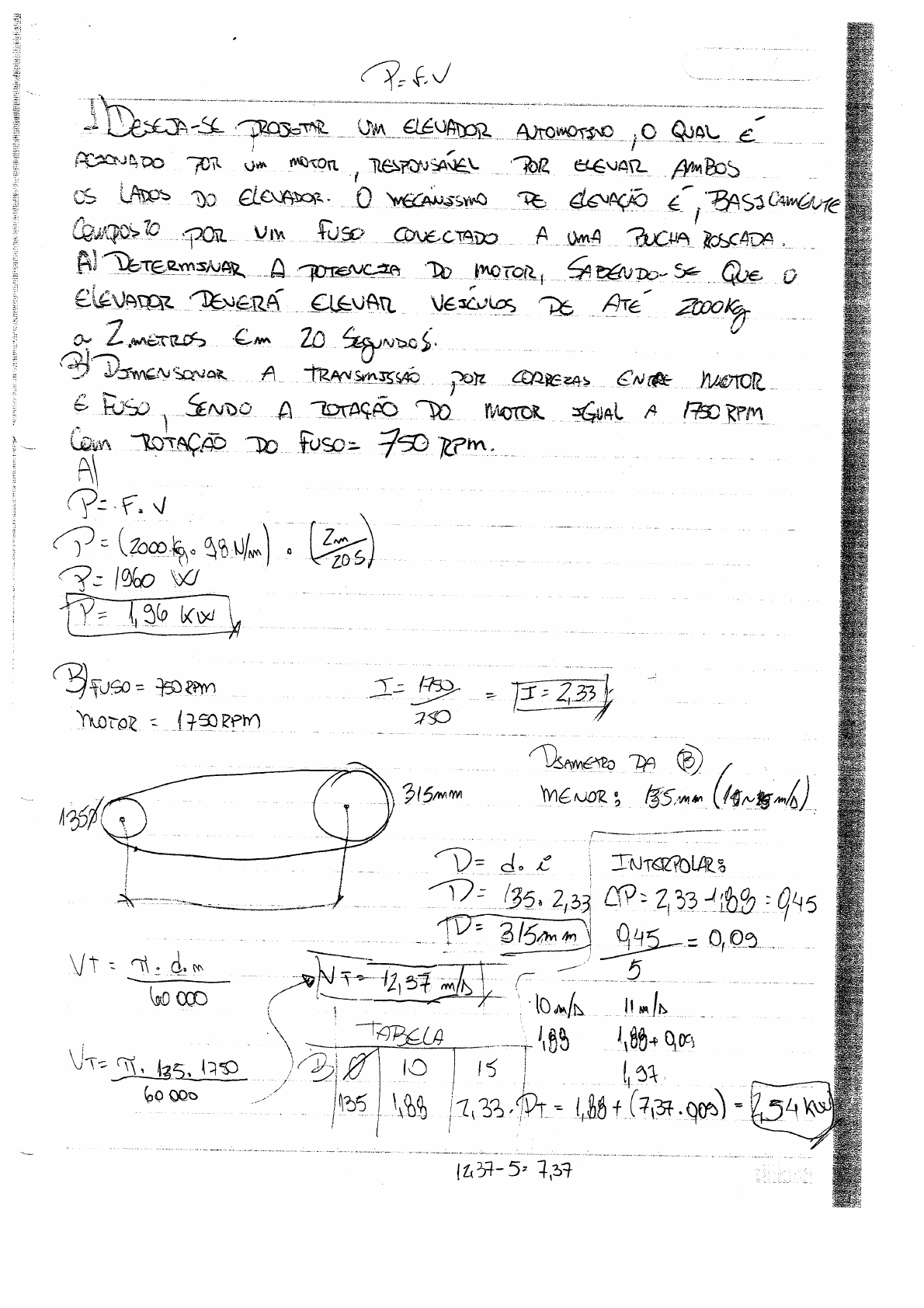 <p>P.F.V ELEVADOR QUAL E FOR POR ELEVAR ELEVADOR. 0 ELEVAÇÃO POR Vin A BUCHA Al A POTENCIA MOTOR, SE QUE ELEVADOR DEVERA ELEVAR DE ATE a Z.METROS Em 20 3) A por MOTOR E Fuso , SENDO A DO MOTOR A 1750 RPM ROTAÇÃO DO Fuso= 750 RPM. Al Zm P= 1960 W P=1,96 = 750 PPM = MOTOR = 1750 PPM 750 DSAMETRO DA B 315mm 135mm 1350 INTERPOLAR: 315mm = 12,37 m 5 60 000 TABELA 10 15 60 000 135 188 =</p><p>Terceira Lista - Elementos de Máquinas 1) Deseja-se projetar um elevador automotivo (1), o qual é acionado por um motor (2), responsável por elevar ambos os lados do elevador (1). mecanismo de elevação é, basicamente, composto por um fuso (3) conectado a uma bucha roscada (4). A) Determinar a potência do motor (2), sabendo-se que o elevador deverá elevar veículos de até 2000 kg a 2,0 metros de altura em 20 segundos. B) Dimensionar a transmissão por correias entre motor (2) e fuso (3), sendo a rotação do motor igual a 1750 rpm com rotação do fuso = 750 rpm 4 2 3 1 2) Deseja-se projetar uma máquina de calandrar chapas, onde o diâmetro dos rolos é de 400 mm com mancais laterais do tipo bucha de deslizamento. A) Determinar a potência do motor, sabendo-se que a força tangencial no rolo motriz é de 6200 N com rotação de 8 rpm; B) O rolo motriz é conectado a um redutor de engrenagens com i = 64 e posteriormente a um sistema de transmissão por correias trapezoidais, sendo este conectado ao motor elétrico acima calculado. Dimensionar o sistema de transmissão por correias, sabendo-se que a rotação do motor é de 1750 rpm. C) Redimensione a transmissão, substituindo-se a transmissão de correias por corrente. D) Faça um esboço para cada sistema de transmissão (correia e corrente), onde deve constar um desenho (simplificado) com informações, tais como número de correias, diâmetro das polias, distancia entre centros; número de correntes, diâmetro do pinhão/corroa, distancia entre centros. 3) Duas placas metálicas foram fixadas entre sí por parafusos M6 da classe de resistência 8.8, o torque aplicado aos parafusos é de 6,0 N.m. As placas estão submetidas a uma força de 3000 kgf, a qual tende a separa-las. Qual a quantidade mínima de parafusos para que não ocorra ruptura do mecanismo?</p><p>0,9 0,7 de 0,5 90 120 150 180 de Tabela 4 Fator de Correção para Comprimento da K2 Comprimento nominal de Fator de Comprimento B Correia D E A 0,85 A16 889 Até 1168 Até 1905 Até 3251 0,90 965-1168 122-1524 2057-2438 3657- 4115 4953 122-1397 1575-1905 2667-3648 4394- 5334 5334- 6096 0,95 1524-1905 1981-2464 3251-4014 6096 6858- 7620 1,00 1981-2286 2667-3048 4115-4953 6858-8382 8382- 9906 1.05 1,10 2438-2845 3251-3657 5334-6096 9144-10668 10668-12192 3048 e acima 4013-4572 6858-7620 12192 13716-15240 1,20 5 Fatores de Sobrecarga K3 Sobrecarga percentual 0 25 50 75 100 150 Fator de 1,0 1,2 1,3 1,4 1,5 Multiplicar a potência fornecida por estes fatores para obter a potência de projeto. Para serviços de 16 a 24 h/dia adicionar 0,1 a estes valores.</p><p>Didmetro nominal Velocidade de correia, m/s Seção da polia menor. da mm Correia 5 10 15 20 25 65 0,33 0,43 0,35 - - 75 0,47 0,72 0,79 0,64 0,24 85 0,58 0,94 1,13 1,00 0,60 95 1,13 1,41 1,48 1,27 A 105 0,75 1,26 1,60 1,60 115 0,81 1,38 1,78 1,97 1,91 125 0,85 1,48 1,92 2,16 2,13 e acima 105 0,76 1,19 1,18 0,86 - 115 0,93 1,41 1,62 1,45 0,84 125 1,04 1,67 2.00 1.97 1,50 135 1,15 1,88 2,33 2,41 2,03 B 145 1,24 2,08 2,58 2,79 2,51 155 1,32 2,24 2,86 3,11 2,91 165 1,39 2,38 3,08 3,40 3,28 175 1,47 2,51 3,26 3,65 3,59 e acima 155 1,41 2,08 2,19 1,66 - 175 1,77 2,81 3,30 3,14 2,18 200 2,14 3,53 4,38 3,99 225 2,42 5,23 5,70 5,38 C 250 2,64 4,54 5.89 6,60 6,50 280 2,85 4,98 7,43 7,58 300 2,98 5,21 6,90 7,81 7,96 e 250 2,96 4,33 3,47 0,75 280 3,70 5,81 6,81 6,44 4,47 300 6,64 8,02 8,11 330 4,64 7,74 9,64 10,29 9,24 D 350 4,94 8,31 10,55 10,73 380 5,34 9,13 11,73 13,03 12,78 400 5,56 9,58 12,42 13,90 13,85 430 5,89 10,23 13,37 15,25 15,47 e acima 410 10,6 13.1 13,5 460 7,4 12,5 15,8 17,2 16,0 510 8,1 13,9 18,1 20,1 19,7 560 8,7 15,1 19,8 22,5 22,8 E 610 21,3 24,5 25,2 660 9,7 17,0 22,6 26,2 710 10,0 17,7 23,7 27,7 29,2 e acima</p><p>Elementos de 3/4 HP motor 1750 RPM 600 RPM ) de funcionamento 30% HP = 736N 736 N = 0,55 KW = 1750 i=2,92 n2 600 D As OL n=600 1750 RPM RPM D= d.i D= 85.2,92 I =</p><p>Vt = : Vt = 60000 60000 Tabela 5 10 15 85 0,58 0,94 Interpolamos valor da potincia transmissivel esta P= 036 = 0,072 5 de 10 5 podemos transmissão : 0,58 + da + + d.os) D-d = 148,4° L = 20 = LC =300 mm</p><p>Tabela K1 K1= 7 ; 90 120 150 148 = u 85) = 577,38 + 568,004 = Tabelado 1168 mm K3 = K2 = 0,54 KW K3 0,1 de 24 h de acrescenta 0,1</p><p>2 Al velocidade, no qual a 2600 RPM a Poten. aa a 736 1,84 KW 1HP 5 10 15 B 135 1,15 1,88 2,33 i = ni = 13 135 . . n2 200 i = max = 10 in, i2 i=4 i=3,25 0135</p><p>de 5CVa ) wa a 14 650 5CV. = KW 5 25 3,65 0175 4,38 C : 2 = 20 Pet 5 = Pt Pt KW</p><p>- = 2.500 Tabela 180 212,5 - x 3,71 = mm Tabela K2=1,0 Sobrecarga 25% 2,56ku 1,2 Numero kw = 1,4 2 2,56</p>