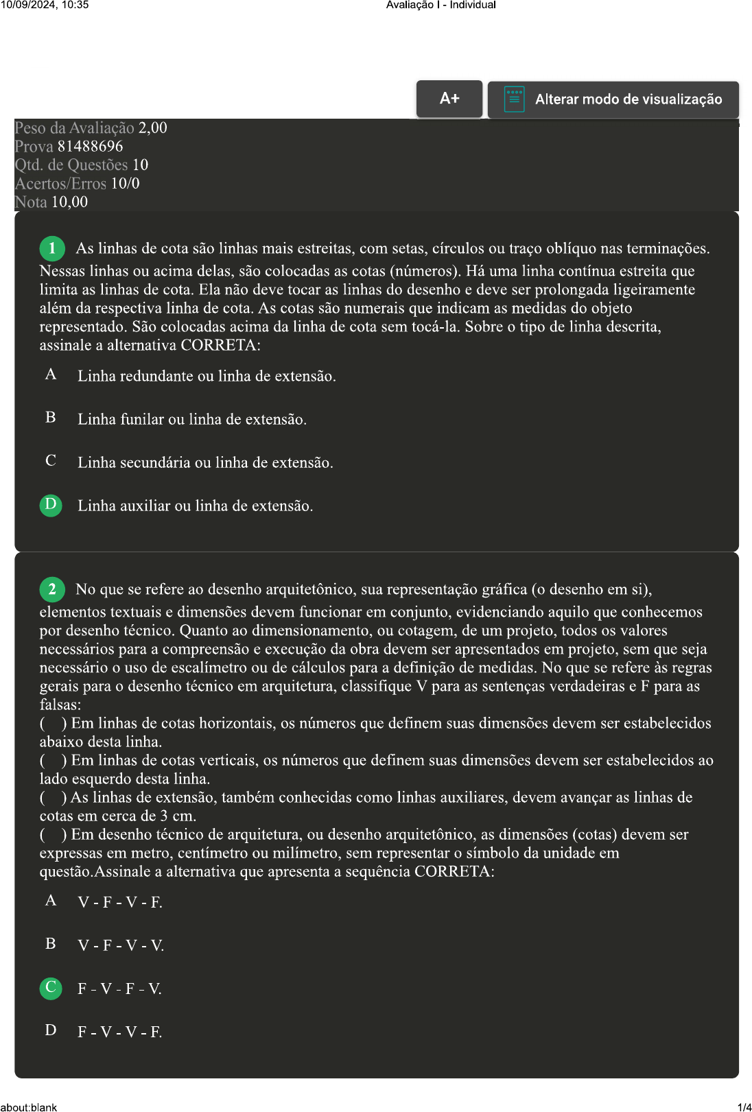 <p>10/09/2024, 10:35 Avaliação Individual A+ Alterar modo de visualização Peso da Avaliação 2,00 Prova 81488696 Qtd. de Questões 10 Acertos/Erros 10/0 Nota 10,00 1 As linhas de cota são linhas mais estreitas, com setas, círculos ou traço oblíquo nas terminações. Nessas linhas ou acima delas, são colocadas as cotas (números). Há uma linha contínua estreita que limita as linhas de cota. Ela não deve tocar as linhas do desenho e deve ser prolongada ligeiramente além da respectiva linha de cota. As cotas são numerais que indicam as medidas do objeto representado. São colocadas acima da linha de cota sem tocá-la. Sobre tipo de linha assinale a alternativa CORRETA: A Linha redundante ou linha de extensão. B Linha funilar ou linha de extensão. C Linha secundária ou linha de extensão. D Linha auxiliar ou linha de extensão. 2 No que se refere ao desenho arquitetônico, sua representação gráfica (o desenho em si), elementos textuais e dimensões devem funcionar em conjunto, evidenciando aquilo que conhecemos por desenho técnico. Quanto ao dimensionamento. ou cotagem, de um projeto, todos os valores necessários para a compreensão e execução da obra devem ser apresentados em projeto, sem que seja necessário uso de escalímetro ou de cálculos para a definição de medidas. No que se refere às regras gerais para desenho técnico em arquitetura, classifique V para as sentenças verdadeiras e F para as falsas: ( ) Em linhas de cotas horizontais, os números que definem suas dimensões devem ser estabelecidos abaixo desta linha ( ) Em linhas de cotas verticais, os números que definem suas dimensões devem ser estabelecidos ao lado esquerdo desta linha. ( ) As linhas de extensão, também conhecidas como linhas auxiliares, devem avançar as linhas de cotas em cerca de 3 cm. ( ) Em desenho técnico de arquitetura, ou desenho arquitetônico, as dimensões (cotas) devem ser expressas em metro, centímetro ou milímetro, sem representar símbolo da unidade em questão.Assinale a alternativa que apresenta a sequência CORRETA: A B V-F-V-V C F-V-F-V D about:blank 1/4</p><p>10/09/2024. 10:35 Avaliação Individual 3 Vários tamanhos padronizados de papel são usados no desenho de projetos. De acordo com a norma brasileira, a padronização do papel está vinculada ao formato A0, um retângulo cujos lados medem 841 mm e 1.189 mm, com área de 1 todos os outros formatos da série A são gerados a partir deste formato padrão. Dentro desse contexto, analise as sentenças a seguir: I- O formato é dobro do formato A1, formato A2 é dobro do tamanho do formato A3 e assim por diante. II- O formato A8 é a metade do tamanho do formato A4, formato A4 é a metade do tamanho do formato A2 e assim por diante. III- O formato A8 é dobro do tamanho do formato A4, formato A4 é dobro do tamanho do formato A2 e assim por diante. O formato é a metade do tamanho do formato A1, formato A2 é a metade do tamanho do formato A3 e assim por diante. Assinale a alternativa CORRETA: A Somente a sentença III está correta. B Somente a sentença II está correta. C Somente a sentença IV está correta. D Somente a sentença I está correta. 4 O desenho técnico, ao longo do tempo, passou por um crescente processo de normalização, buscando-se uma unidade tanto em termos visuais quanto na circulação de informações técnicas. Diante da sua importância para desenvolvimento tecnológico e industrial das nações, qual é a definição de desenho técnico? É uma representação gráfica de processos, estruturas ou objetos que deve transmitir pouca A exatidão nas características e informações do que está representado no papel, mas deve obrigatoriamente apresentar beleza artística. É uma representação gráfica que tem objetivo de organizar e ilustrar a forma, a dimensão e a B posição de objetos, estruturas ou processos para que os profissionais da área envolvidos no projeto consigam utilizá-lo como retrato fiel e aplicar suas informações na realidade física. C É uma representação gráfica que retrata sentimentos pessoais e não necessita ser fiel à realidade, pois sua execução não segue normas técnicas. É uma representação gráfica caracterizada pela normatização e apropriação das regras da D geometria descritiva, utilizada na concepção e fabricação de manufaturas, mas nunca é um meio de comunicação entre quem projeta e quem fabrica. 5 Quando se evidenciam os valores atrelados ao desenho técnico, estes extrapolam a representação gráfica do objeto em O desenho técnico também expressa as dimensões do objeto, englobando a representação gráfica de um valor numérico em uma determinada unidade de medida. Este tipo de representação gráfica, evidenciada através do uso de linhas, símbolos e respectivas notas, é denominado cotagem, usada com a finalidade de expressar características técnicas do objeto representado. Sobre a cotagem, analise as sentenças a seguir: I- As linhas auxiliar (ou de extensão) e as linhas de cota devem possuir a mesma espessura, ou seja, devem ser representadas por linha grossa e traço contínuo. about:blank 2/4</p><p>10/09/2024, 10:35 Avaliação Individual II- Em linhas de cota definidas na posição horizontal, os números que expressam suas dimensões devem ser estabelecidos acima desta linha. III - Em desenho técnico, a unidade de medida não deve ser evidenciada ao lado da cota. IV- A unidade de medida deve ser exposta na legenda, ou seja, para cada desenho deve ser empregada uma única unidade de medida Assinale a alternativa CORRETA: A As sentenças II, III e IV estão corretas. B Somente a sentença IV está correta. C As sentenças I e III estão corretas. D Somente a sentença I está correta. 6 A escolha correta dos equipamentos e materiais utilizados para desenho técnico é de suma importância. A falta ou a escolha incorreta pode dificultar desempenho da atividade.Sobre instrumentos utilizados para desenho t